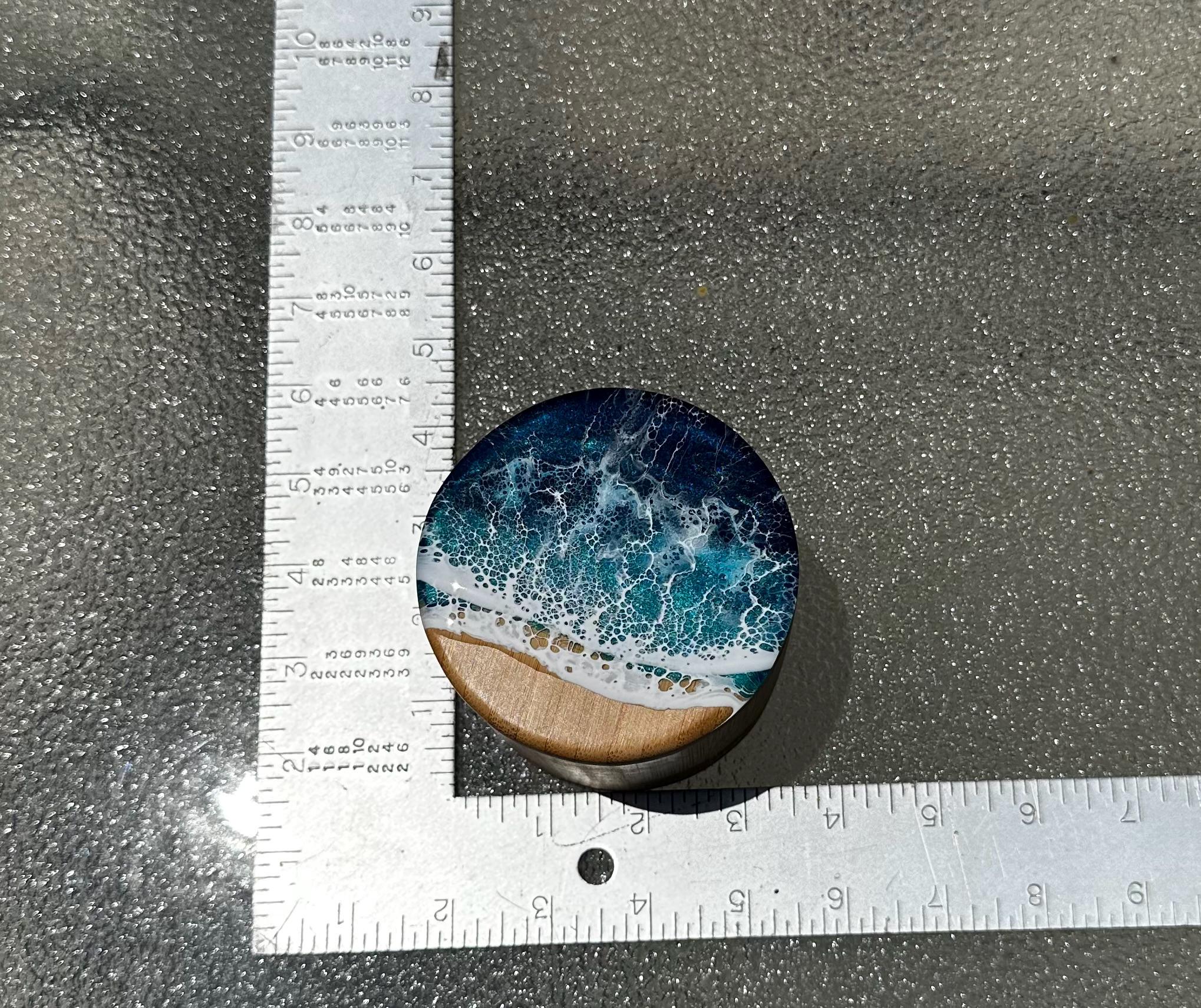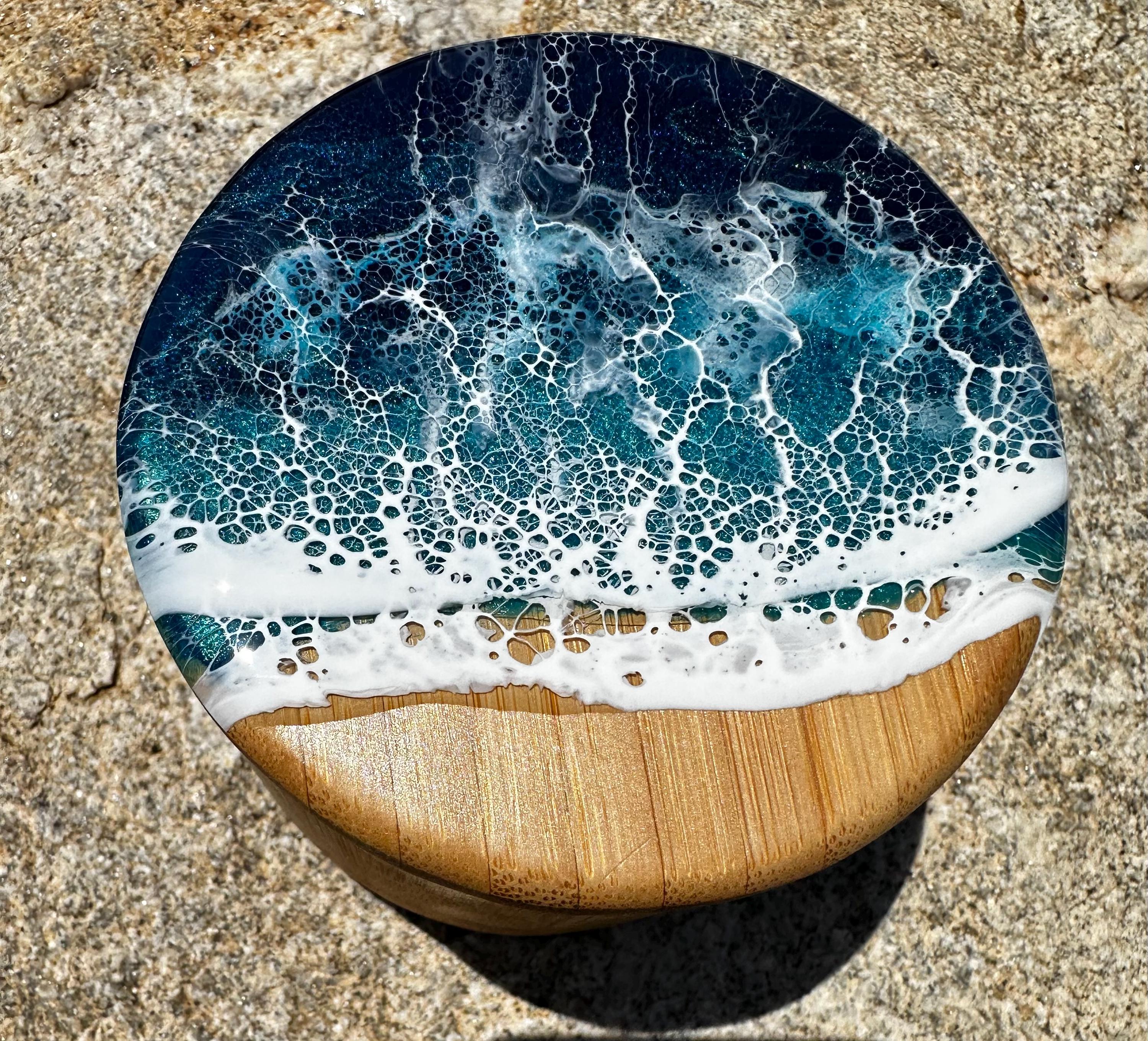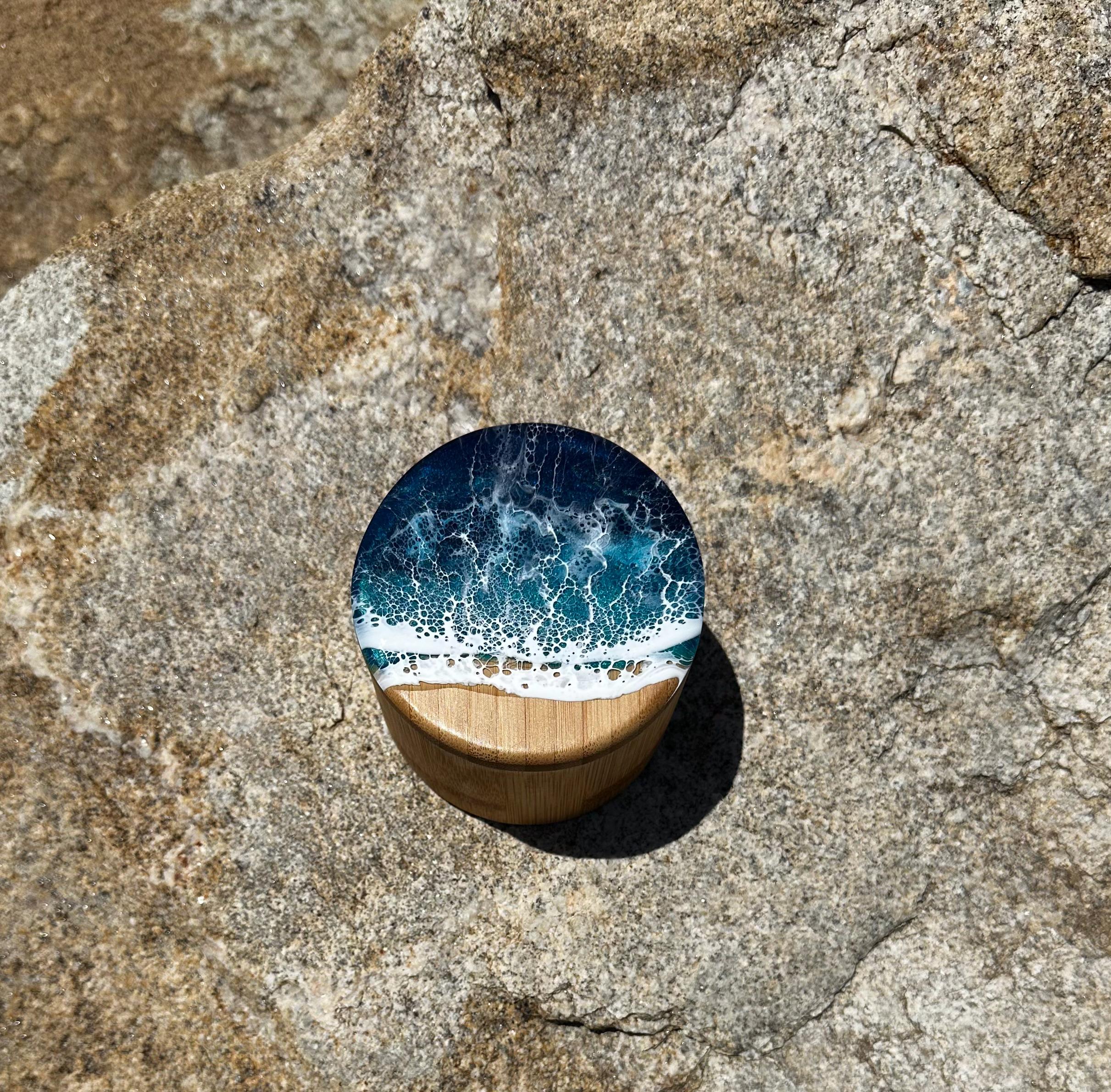 Bamboo wood canister/ box with ocean resin art poured on top.