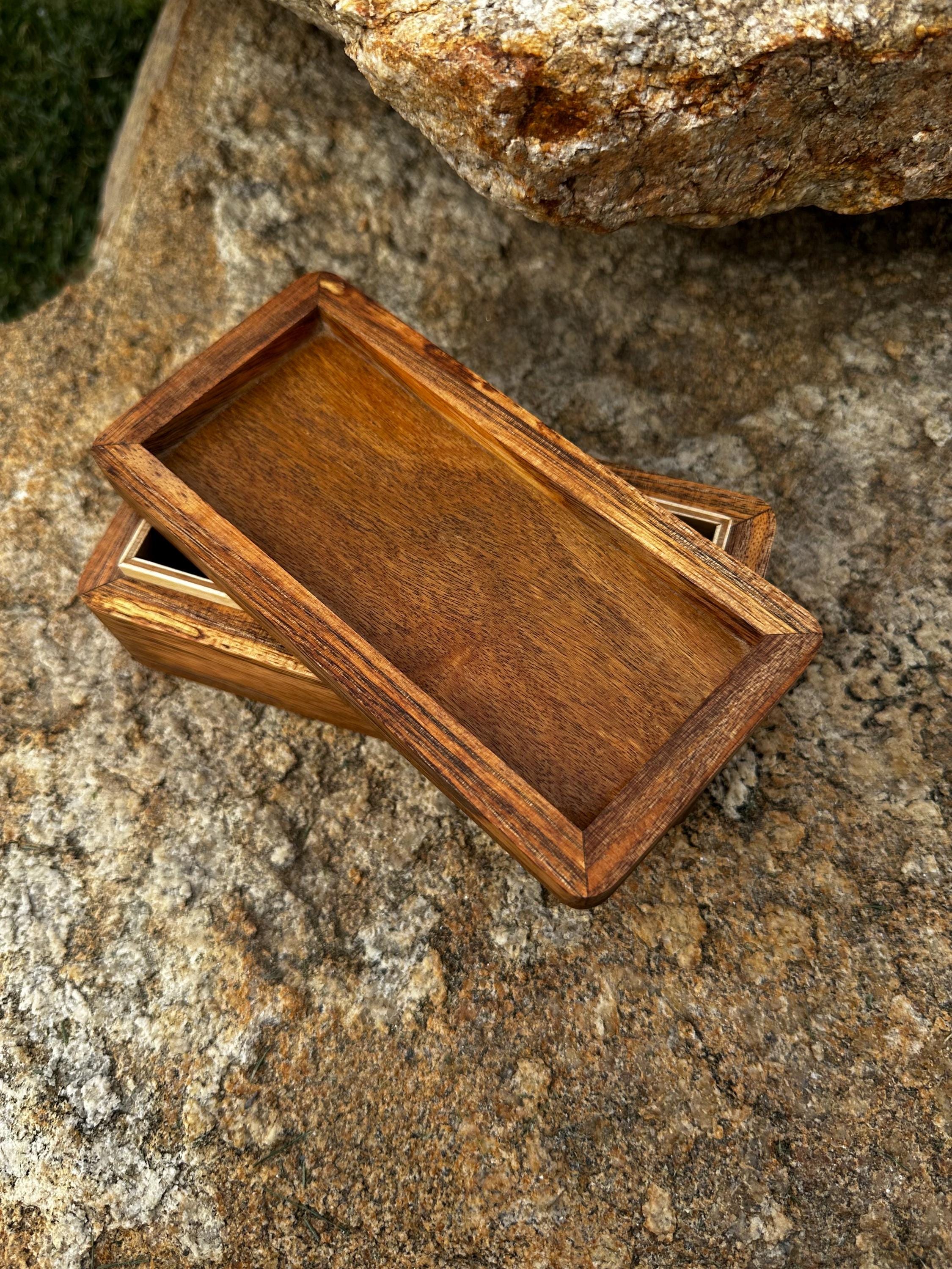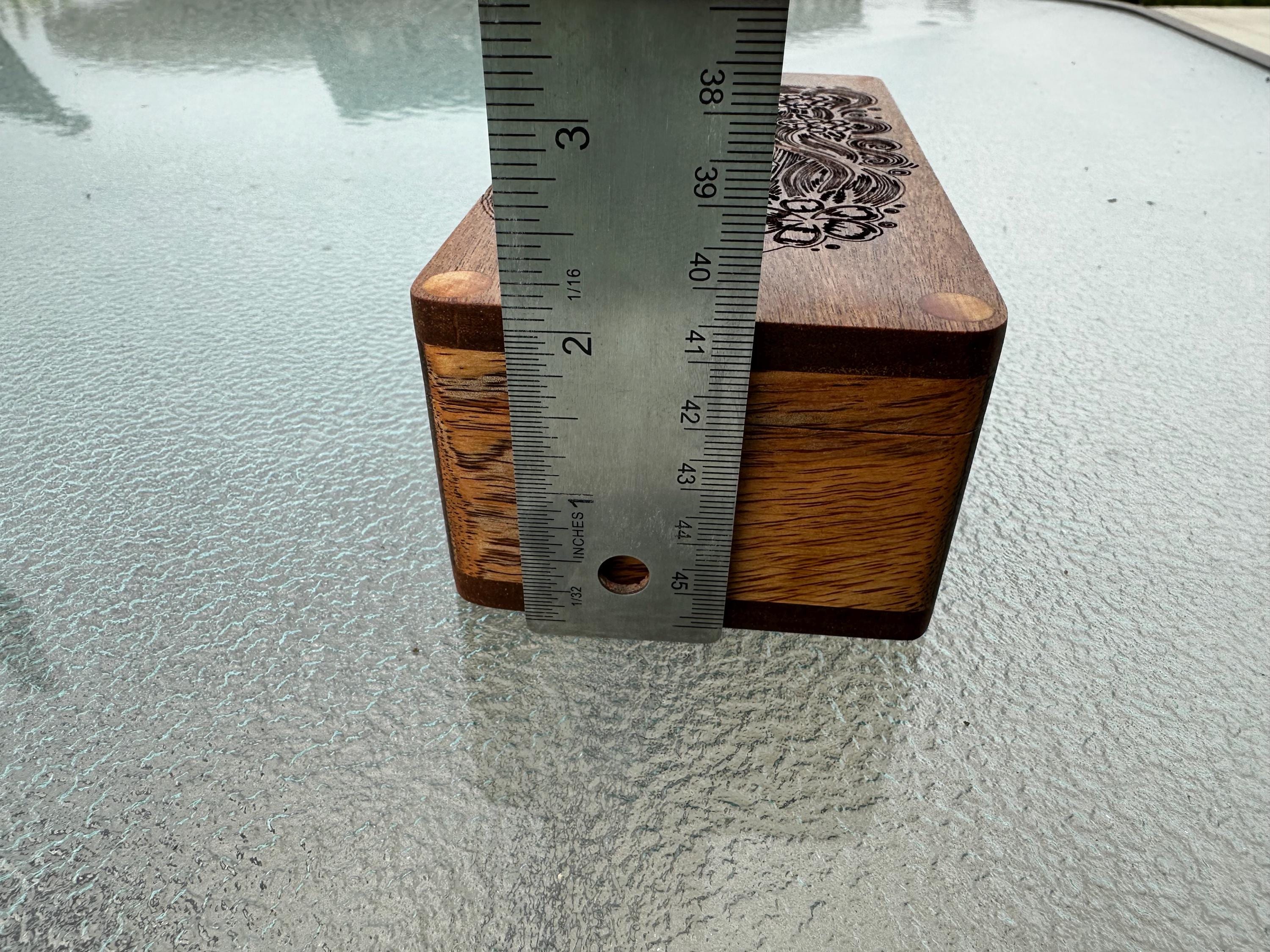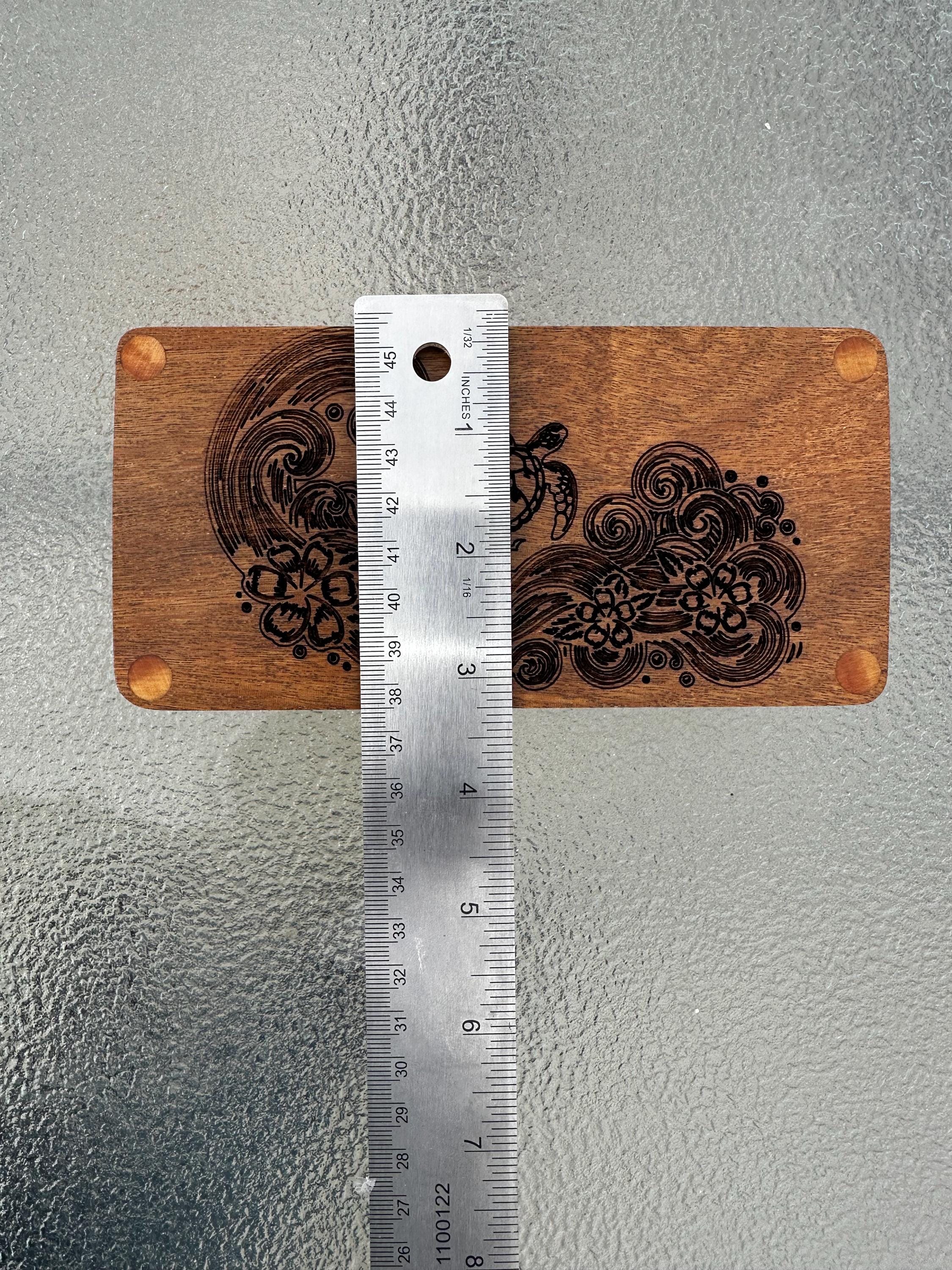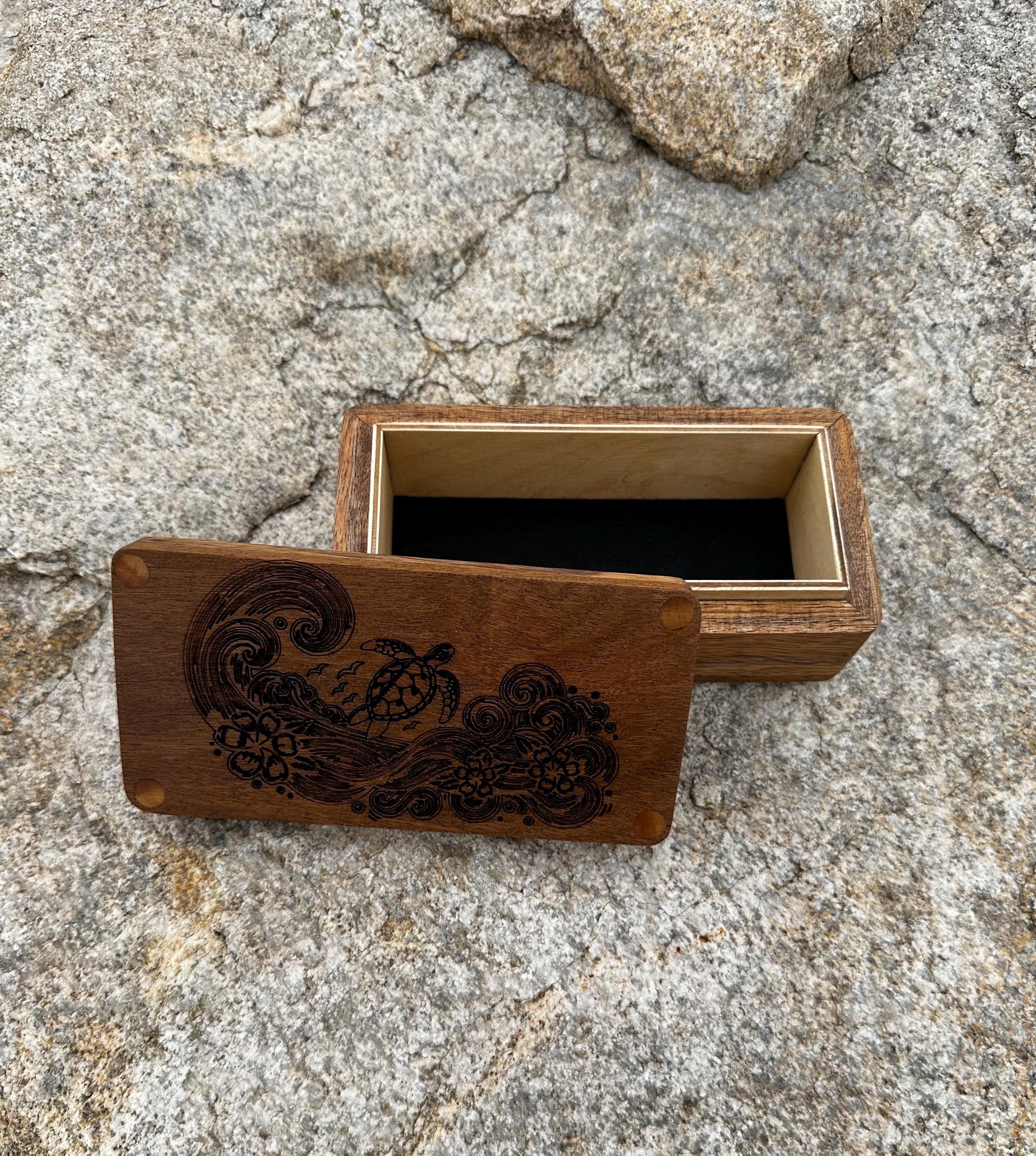 This box is handmade and created using beautiful mango and ipe wood. The body of the box is made out of mango wood picked up on our travels to Maui. The top and bottom of the box is made with IPE wood to help create contrast. The top has been engraved with a sea turtle riding a wave.
