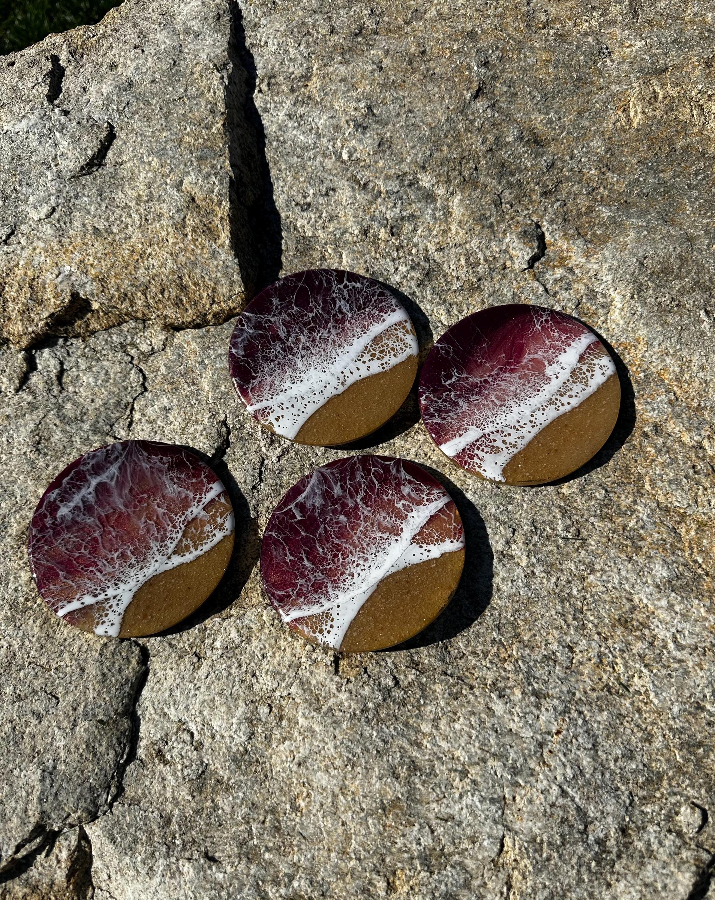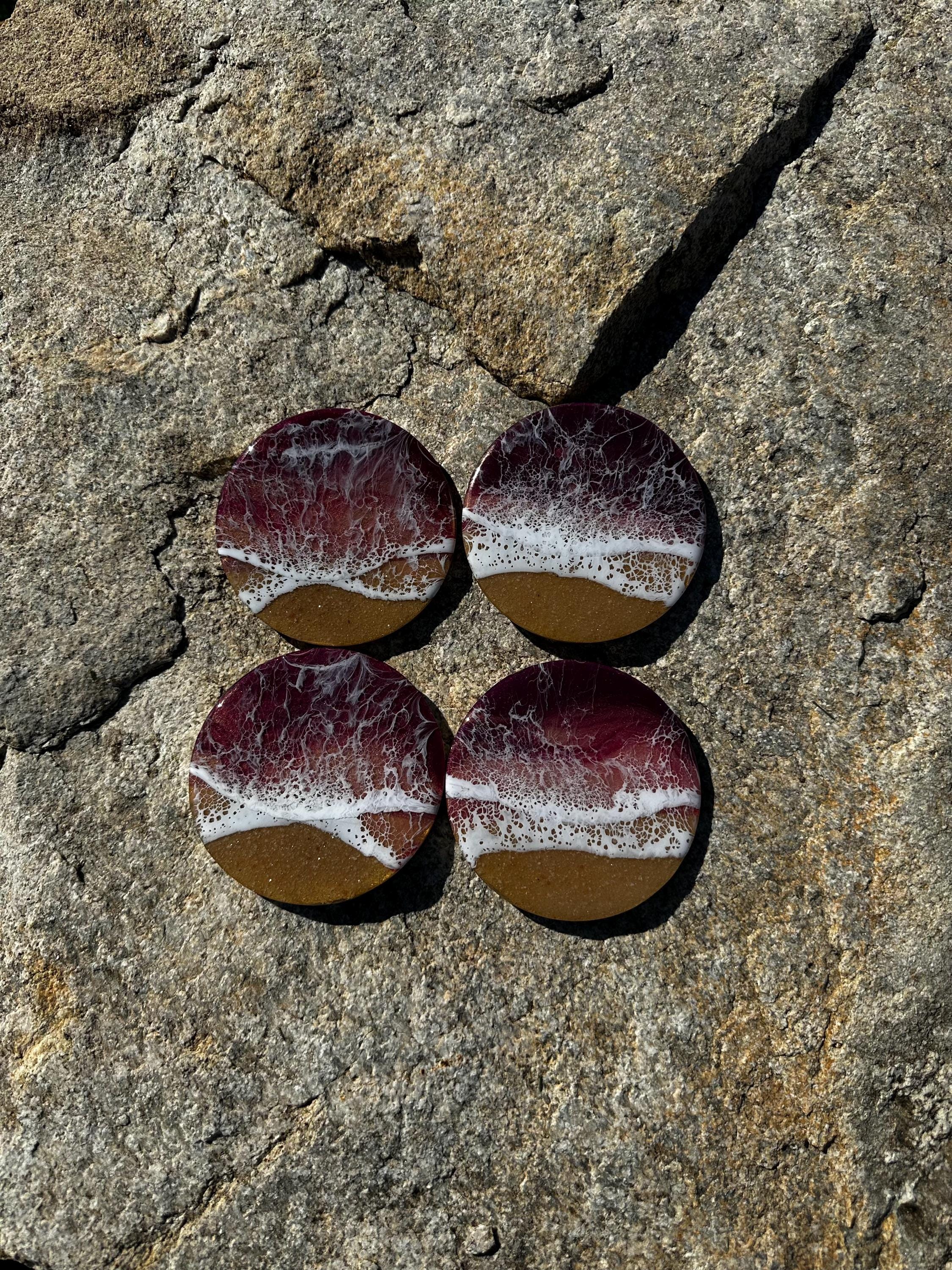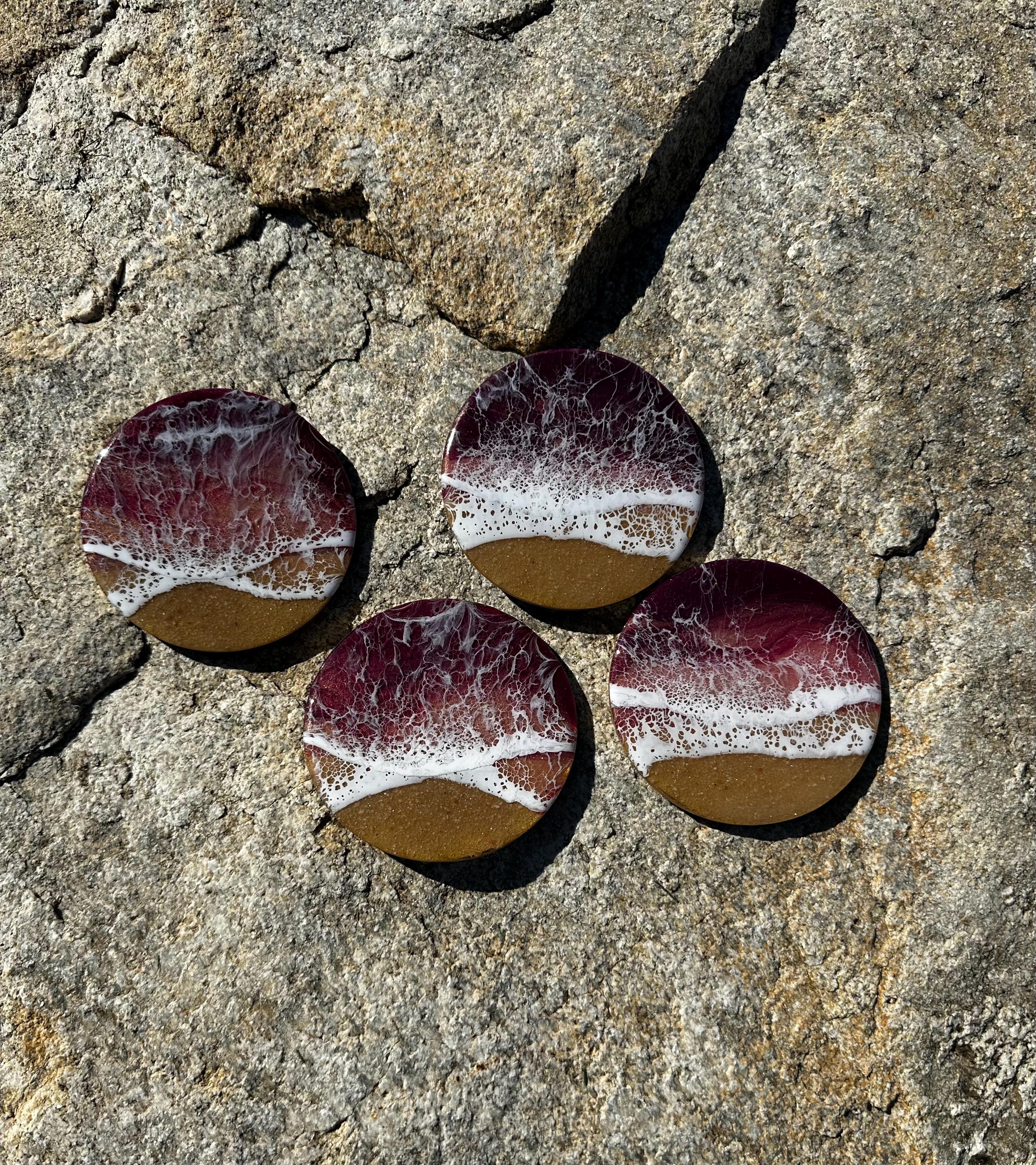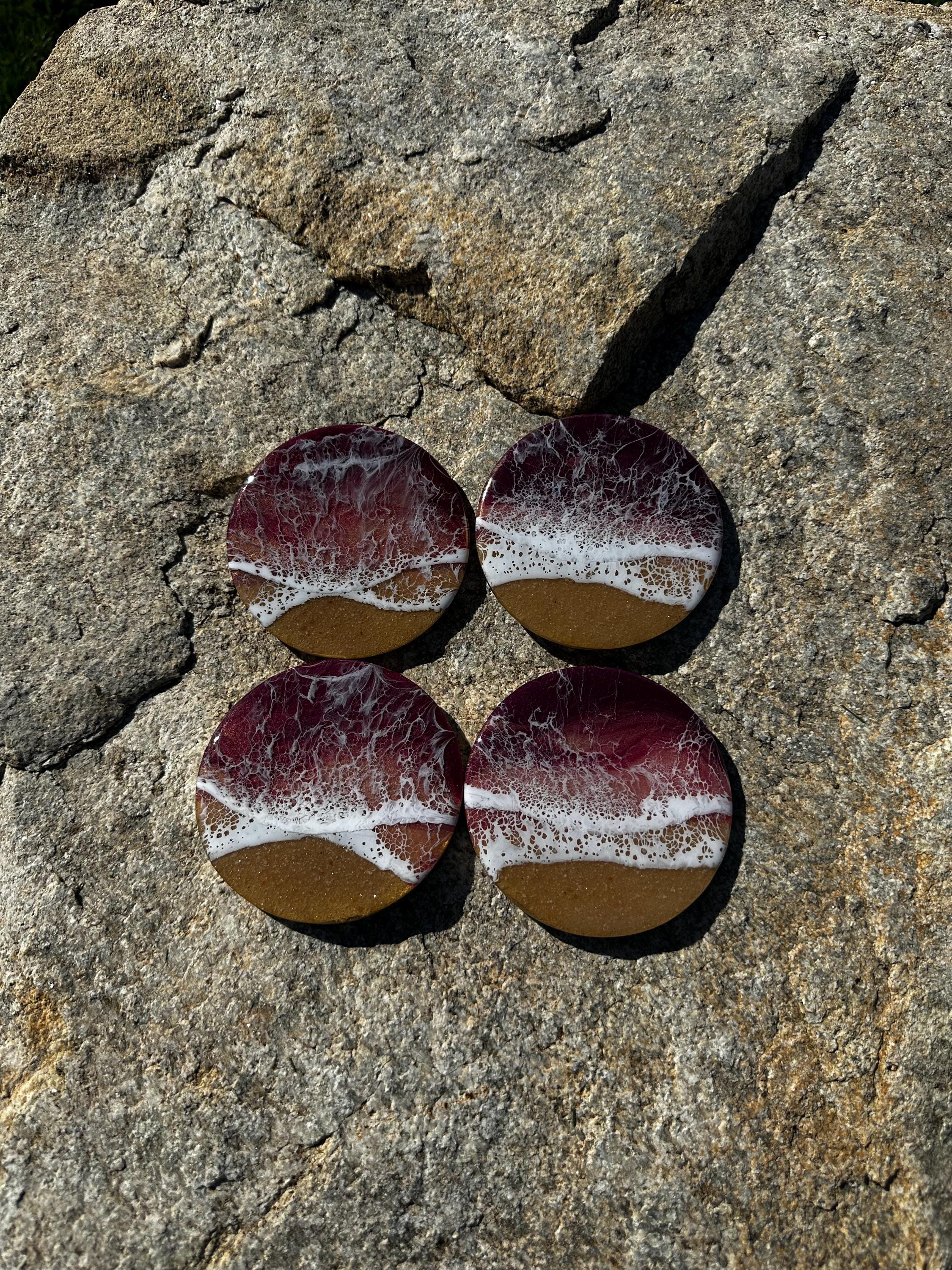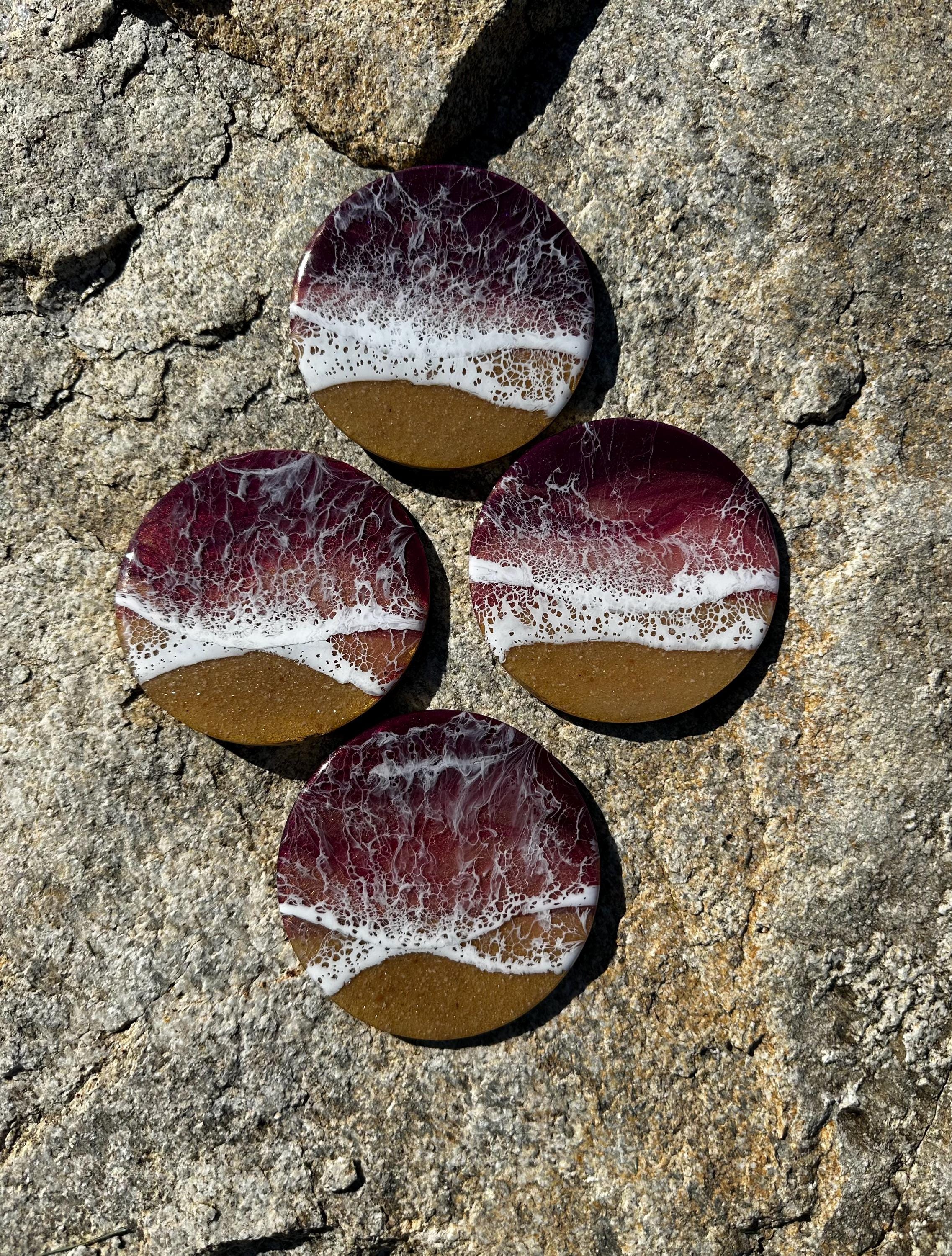 This coaster set depicts a beach setting with the waves crashing on the sand. The ocean colors are deep burgundy, rose gold, and pink with a real tan sand beach and white waves. Each is different and unique. The coasters are made from resin poured on wood. Each has a cork backing to help protect your furniture.