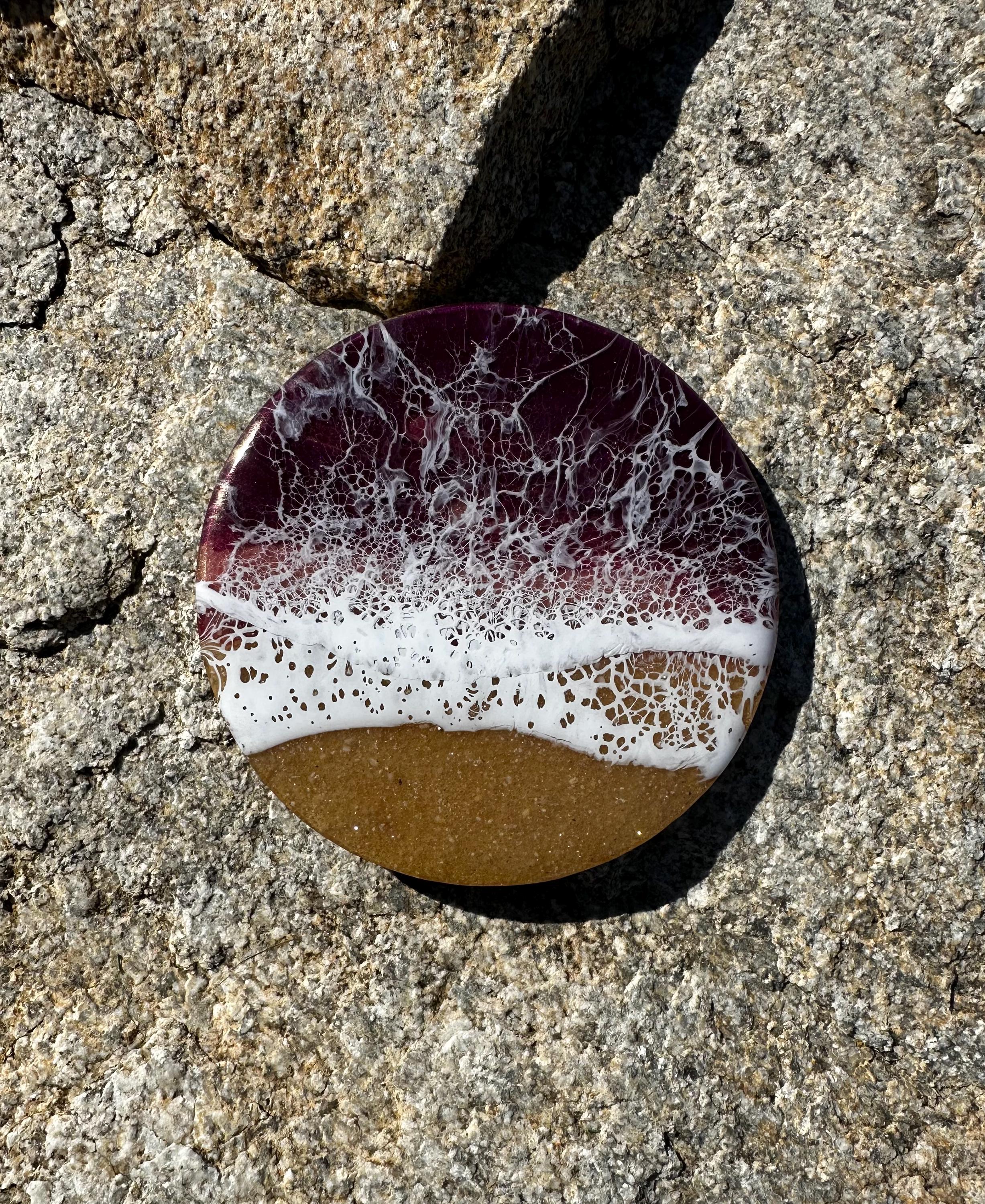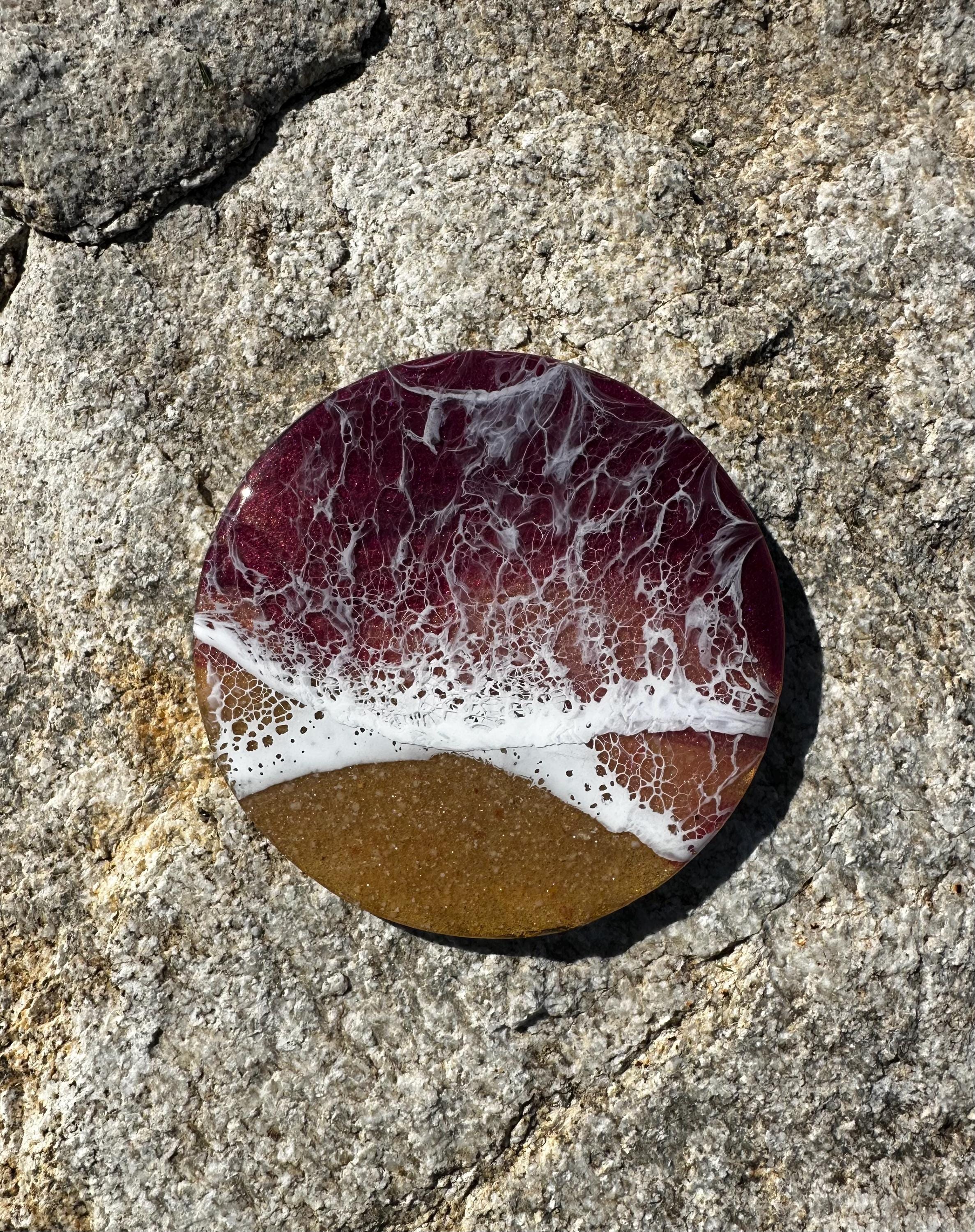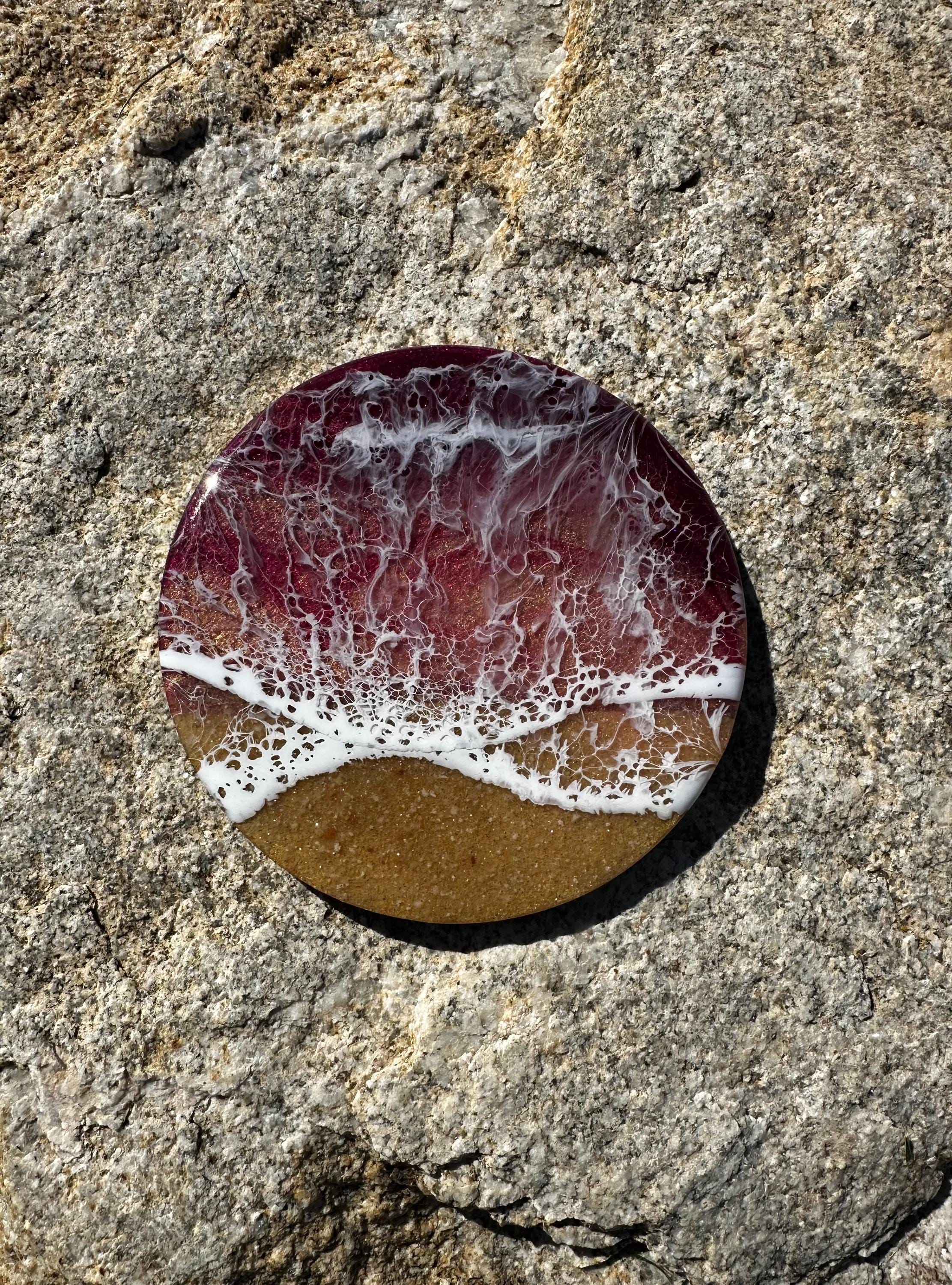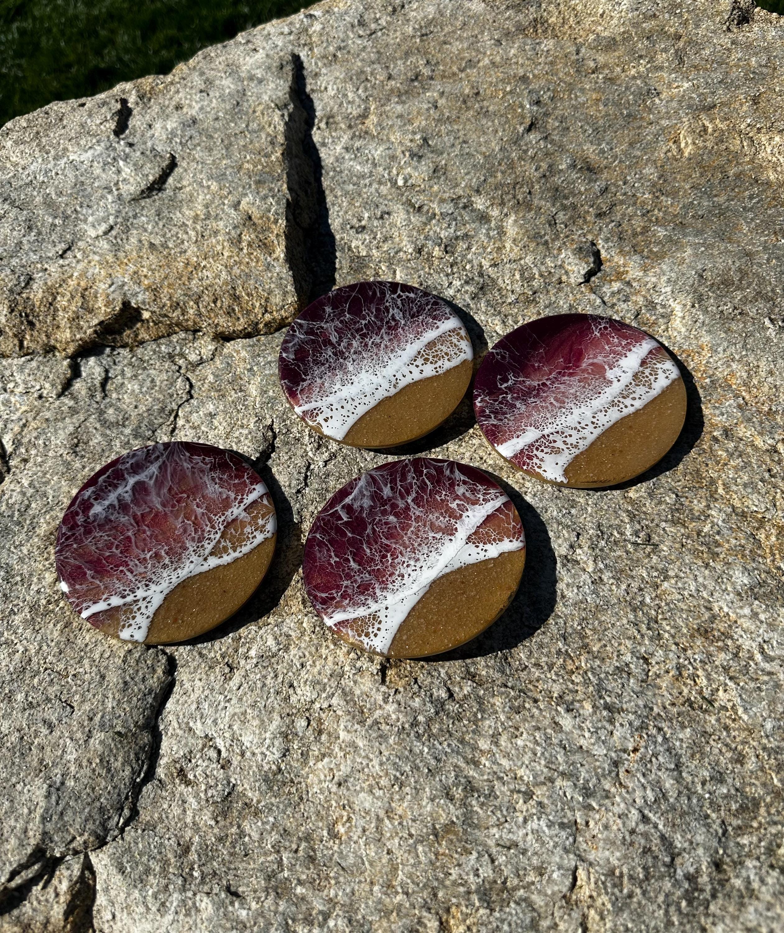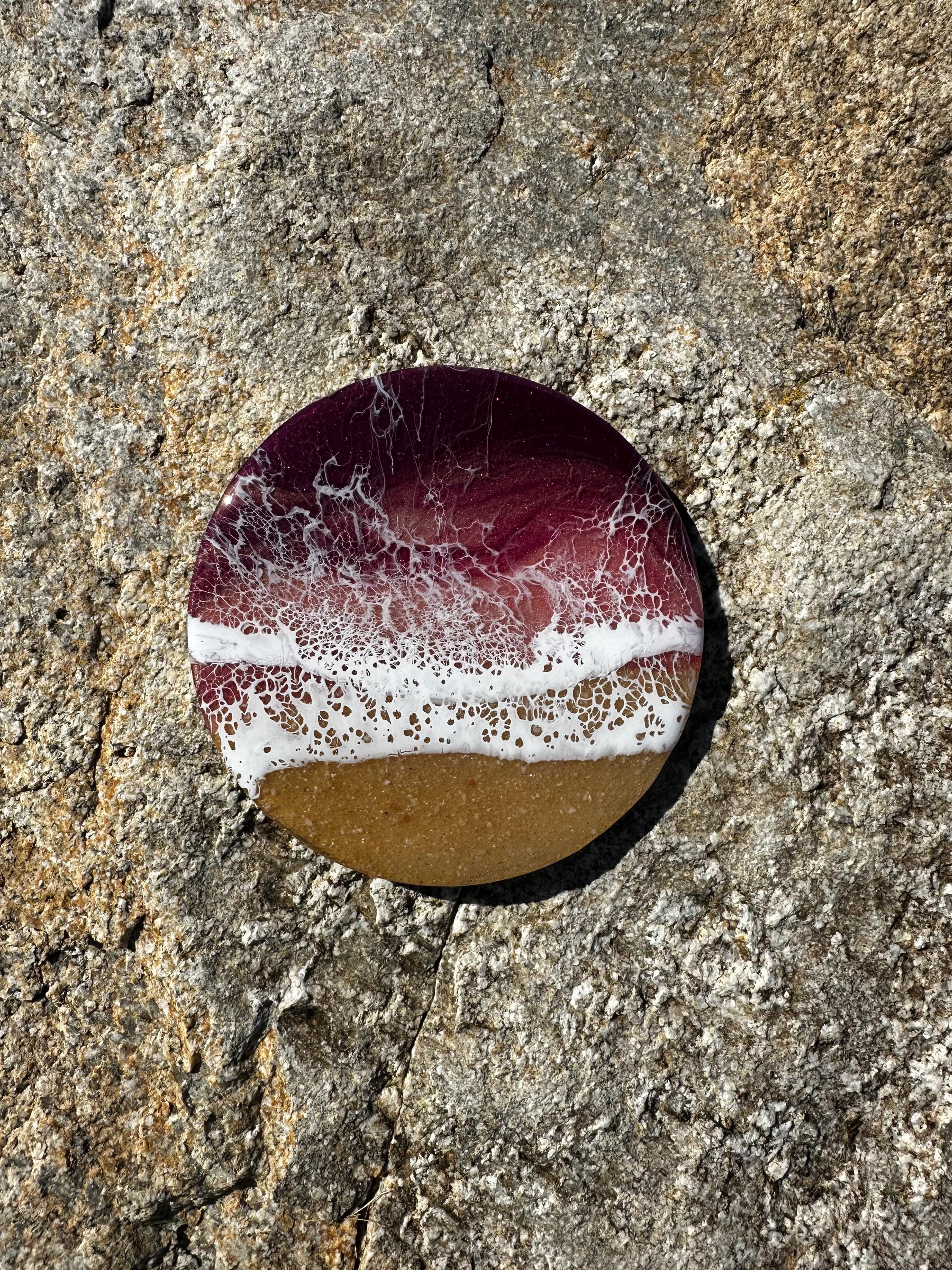 This coaster set depicts a beach setting with the waves crashing on the sand. The ocean colors are deep burgundy, rose gold, and pink with a real tan sand beach and white waves. Each is different and unique. The coasters are made from resin poured on wood. Each has a cork backing to help protect your furniture.