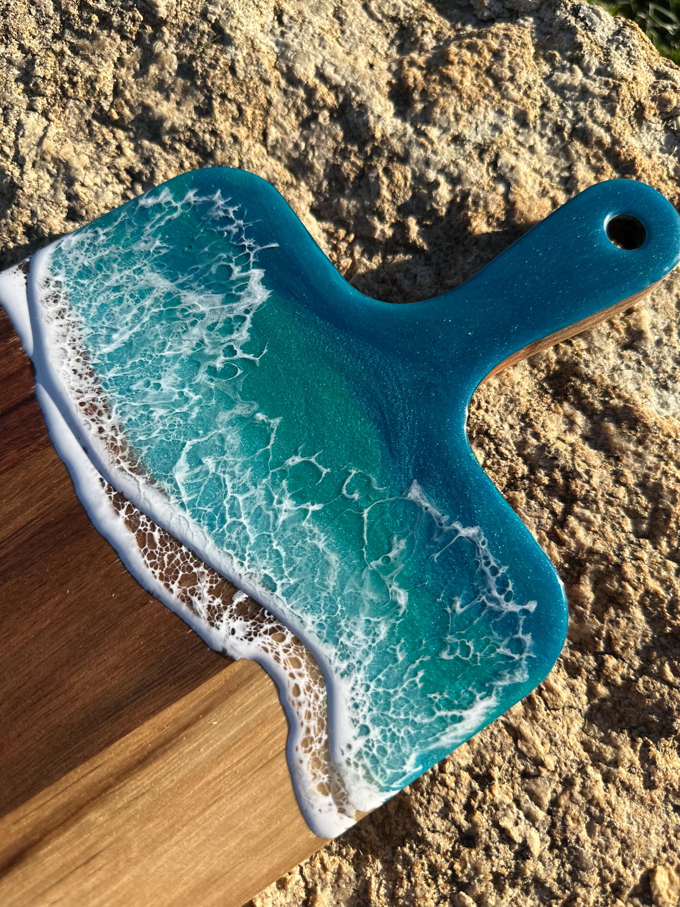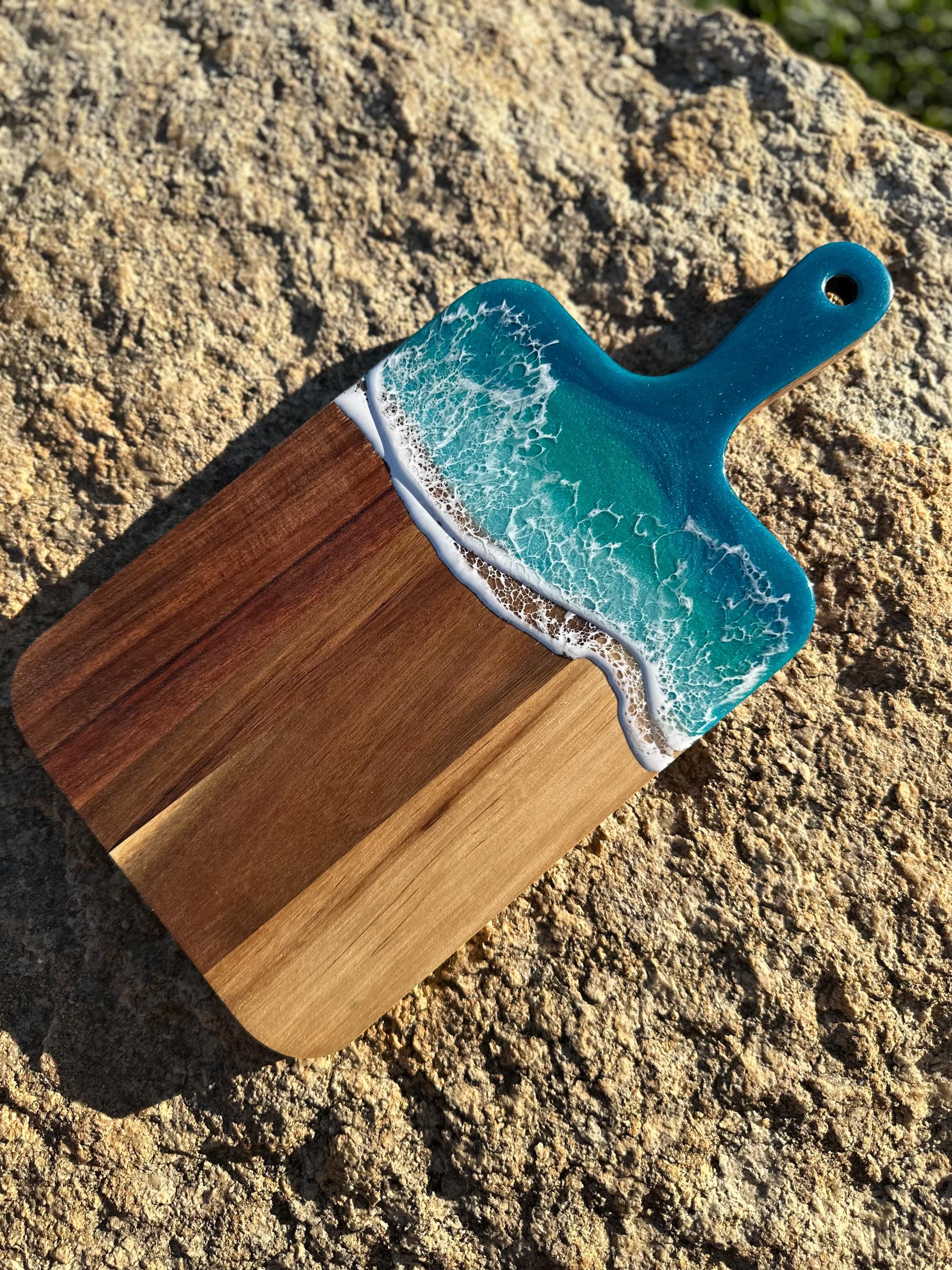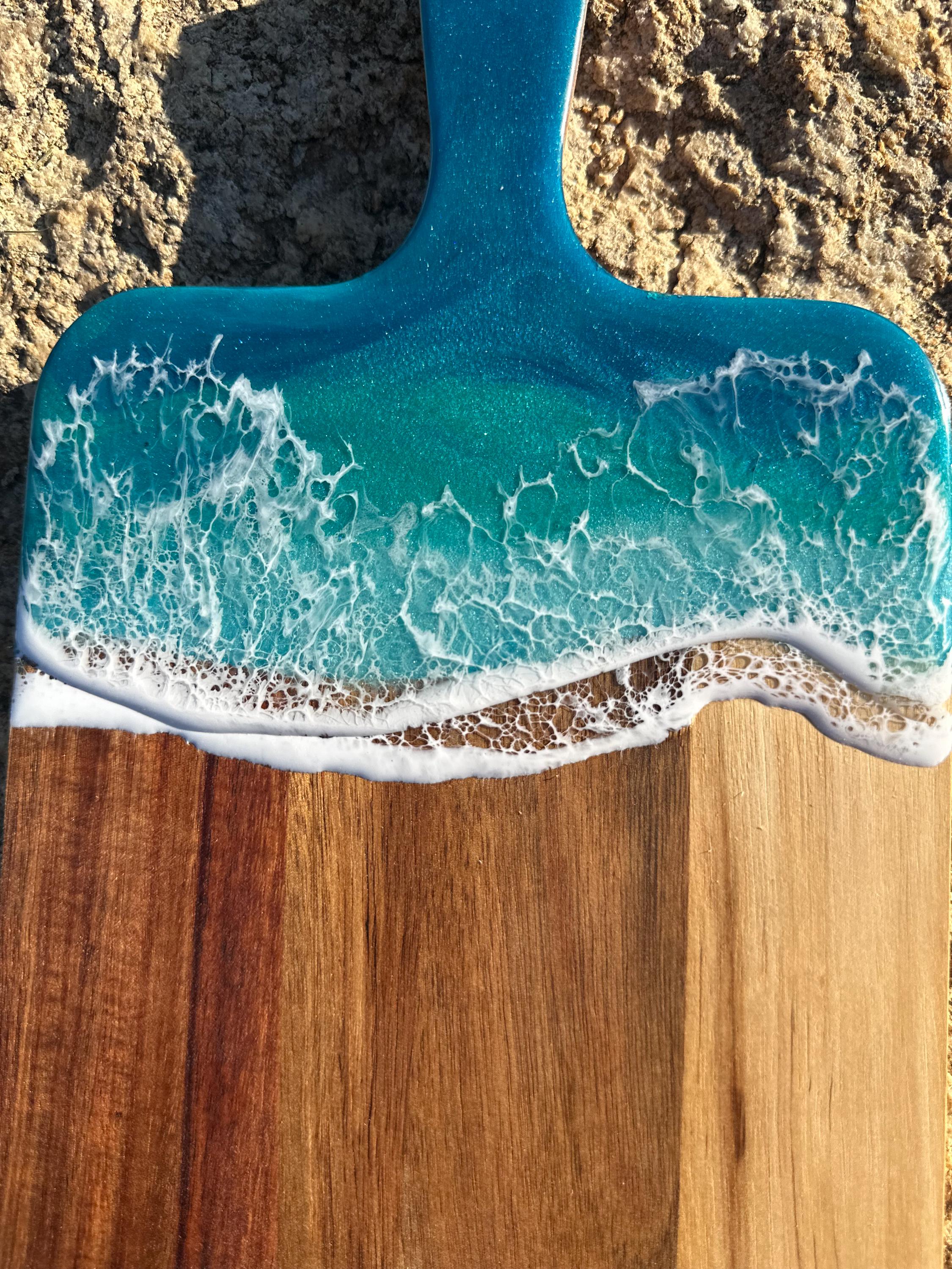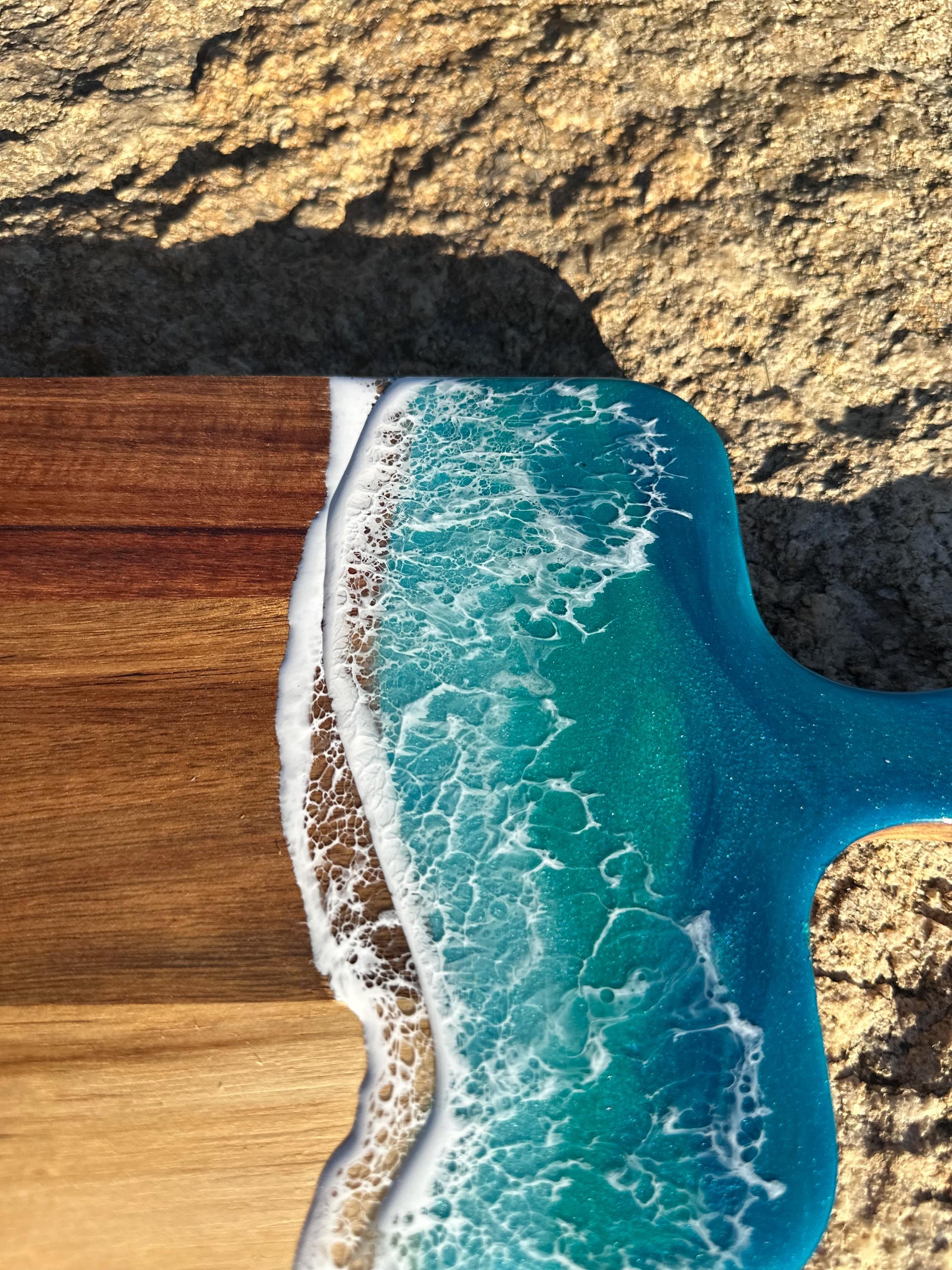 Resin serving board poured on wood. Perfect for charcuterie boards, cheese board, or simply a cutting board. Leave these beautiful boards out on your counter for decoration and it will also be easily accessible for a quick cheese platter or charcuterie board. Ocean waves are realistic and so beautiful in colors of turquoise, teal blue, and sea foam with white crisp ocean waves.