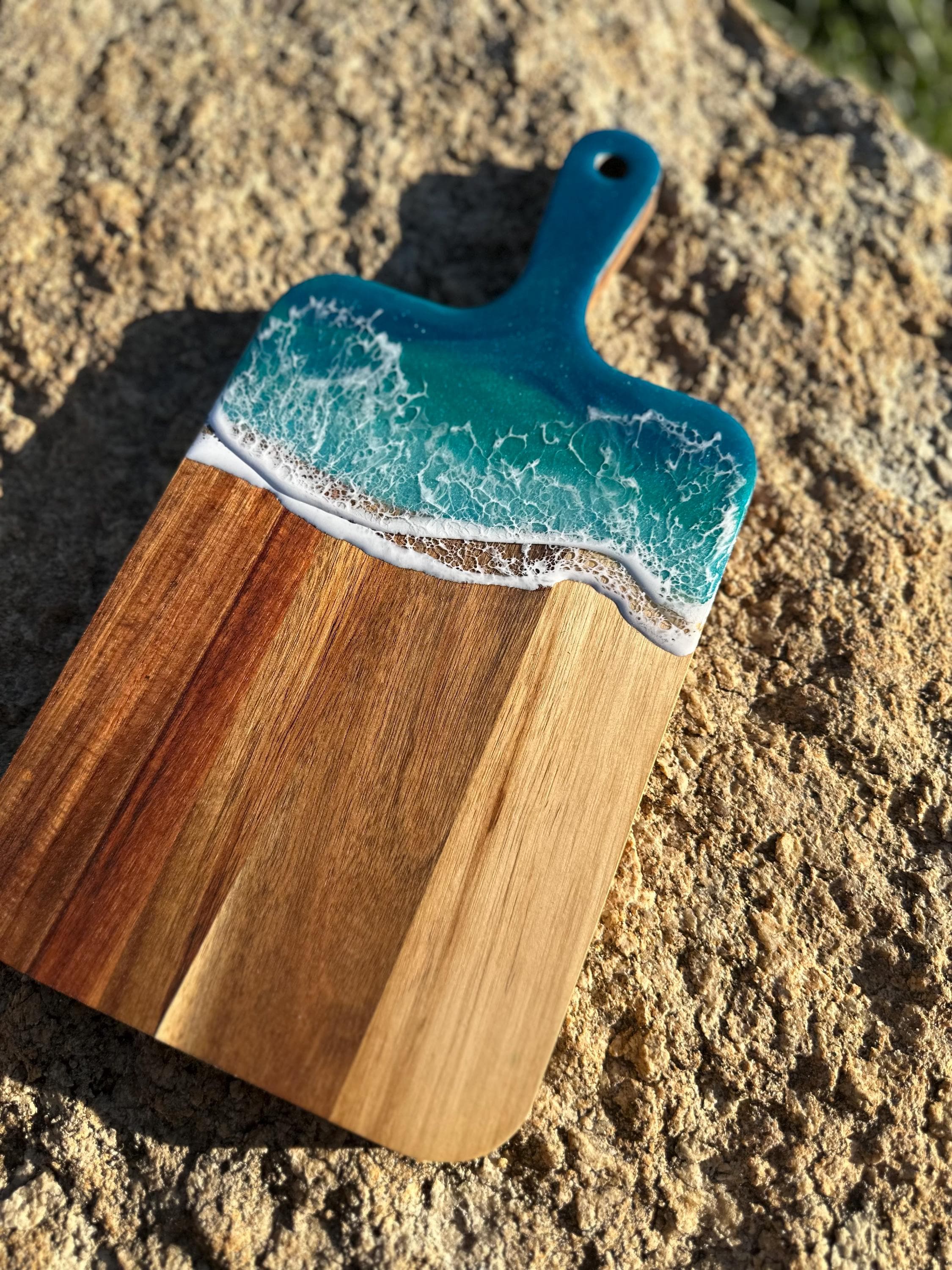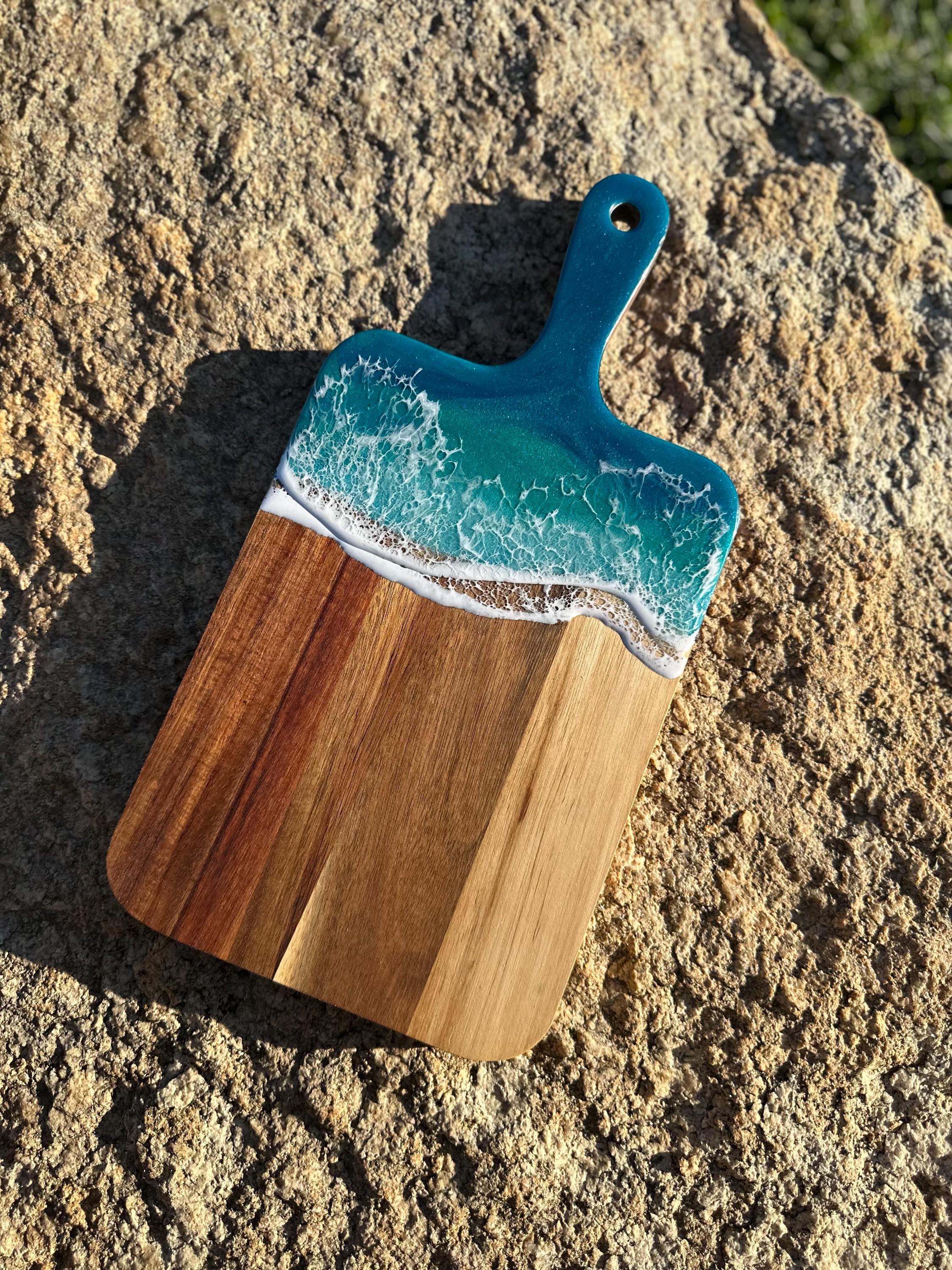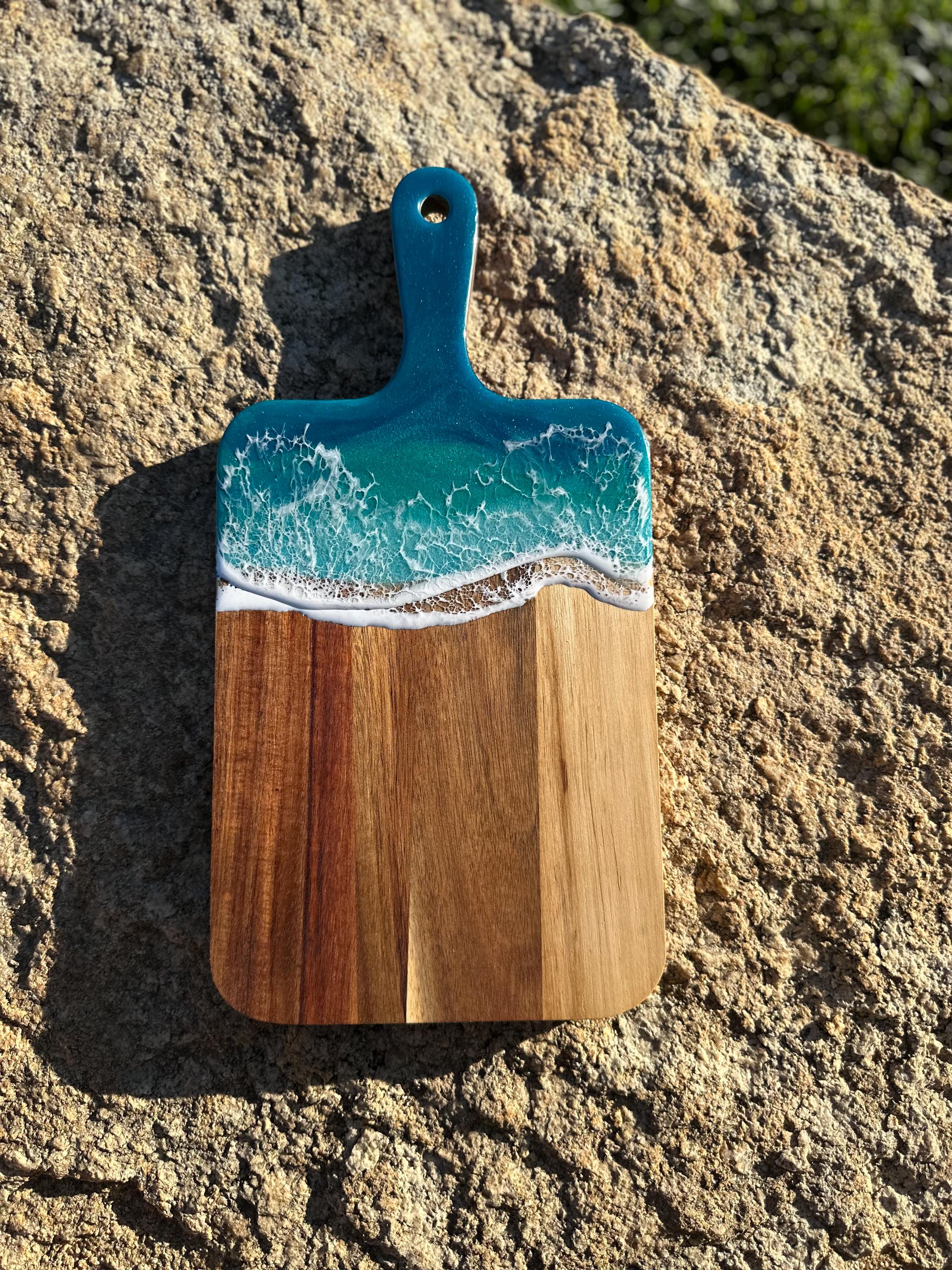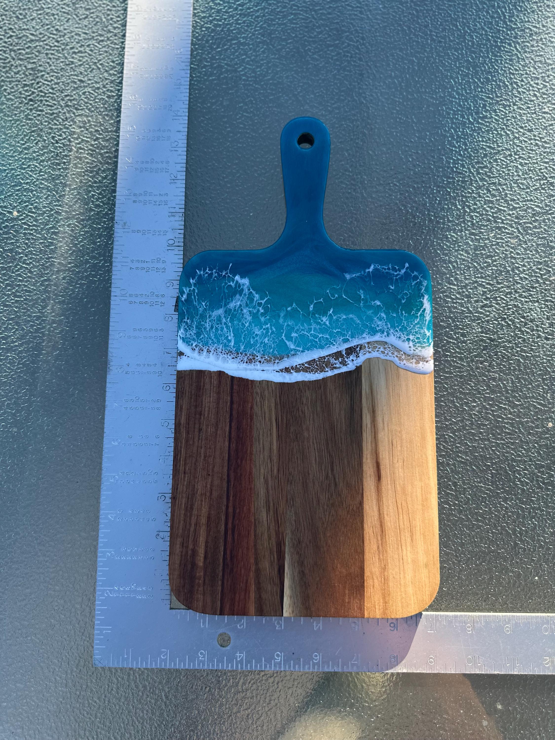 Resin serving board poured on wood. Perfect for charcuterie boards, cheese board, or simply a cutting board. Leave these beautiful boards out on your counter for decoration and it will also be easily accessible for a quick cheese platter or charcuterie board. Ocean waves are realistic and so beautiful in colors of turquoise, teal blue, and sea foam with white crisp ocean waves.
