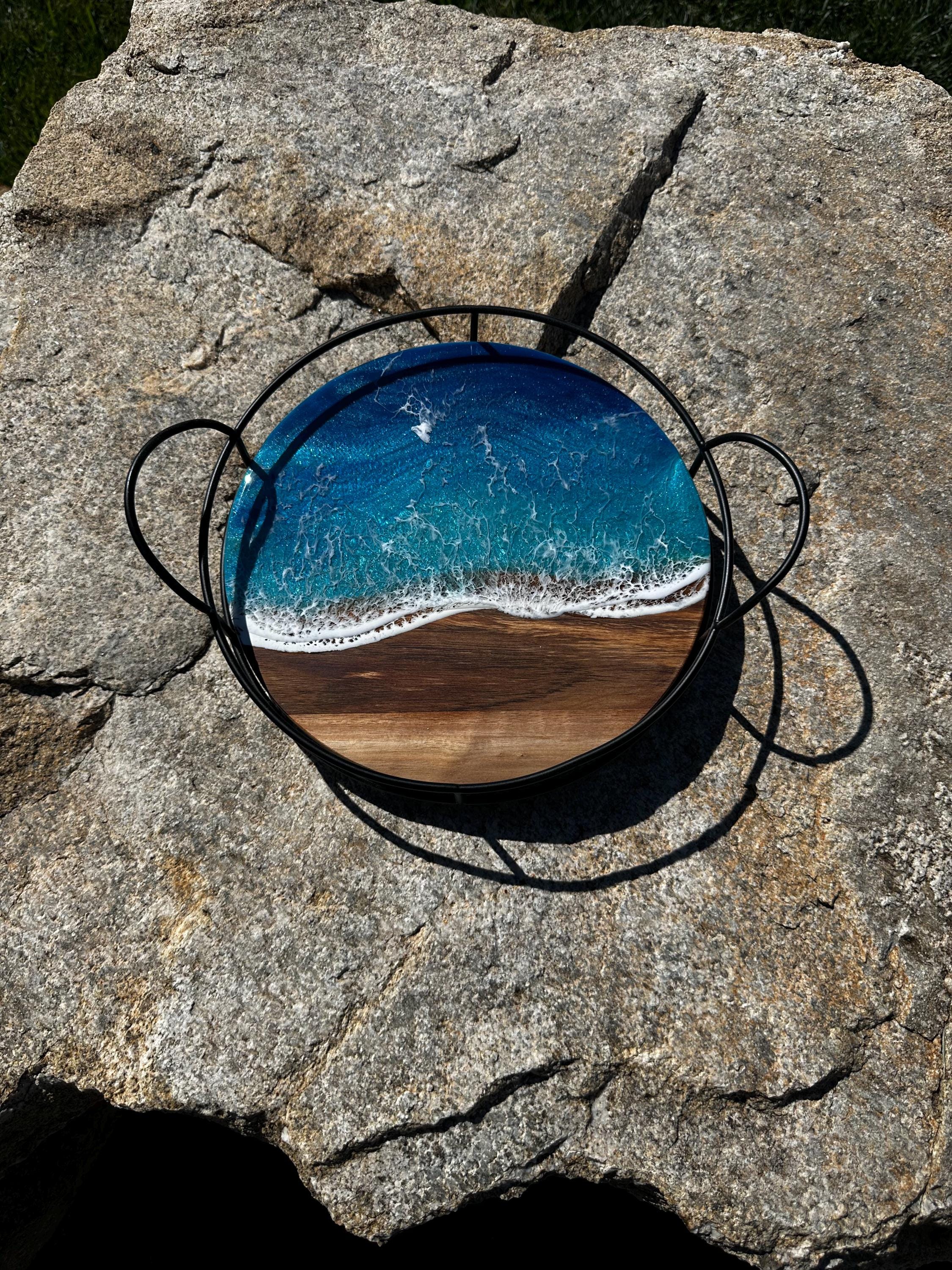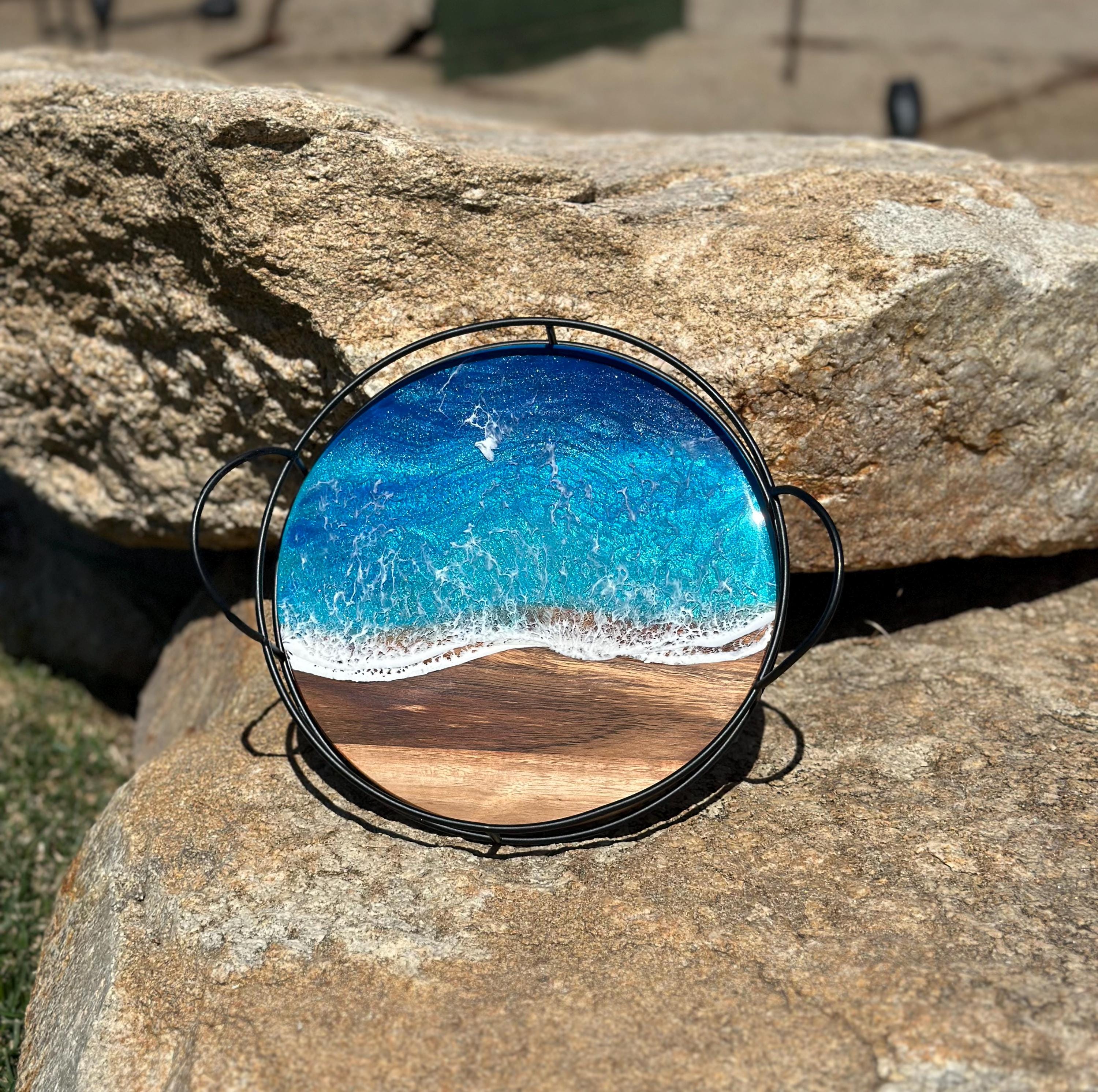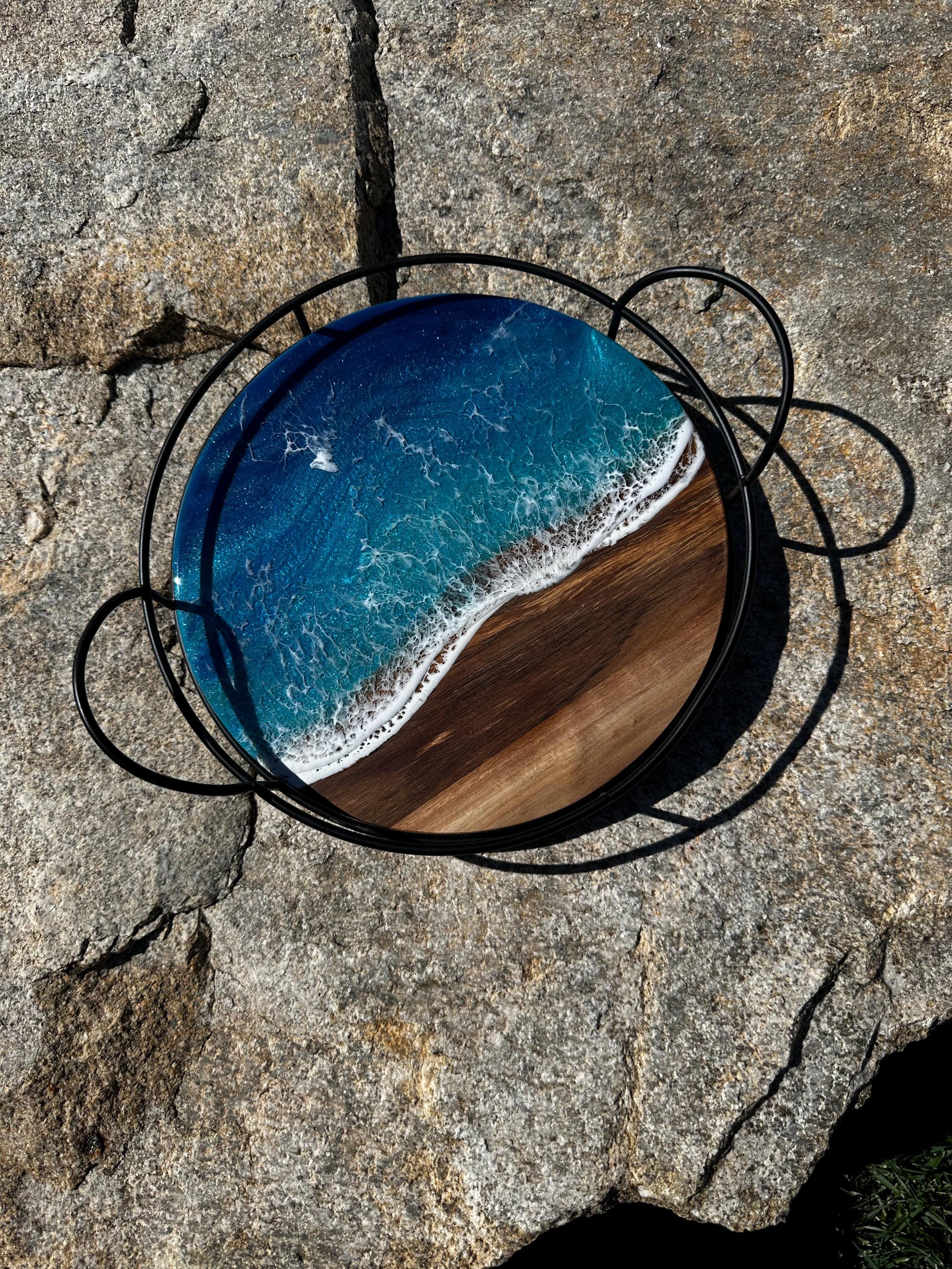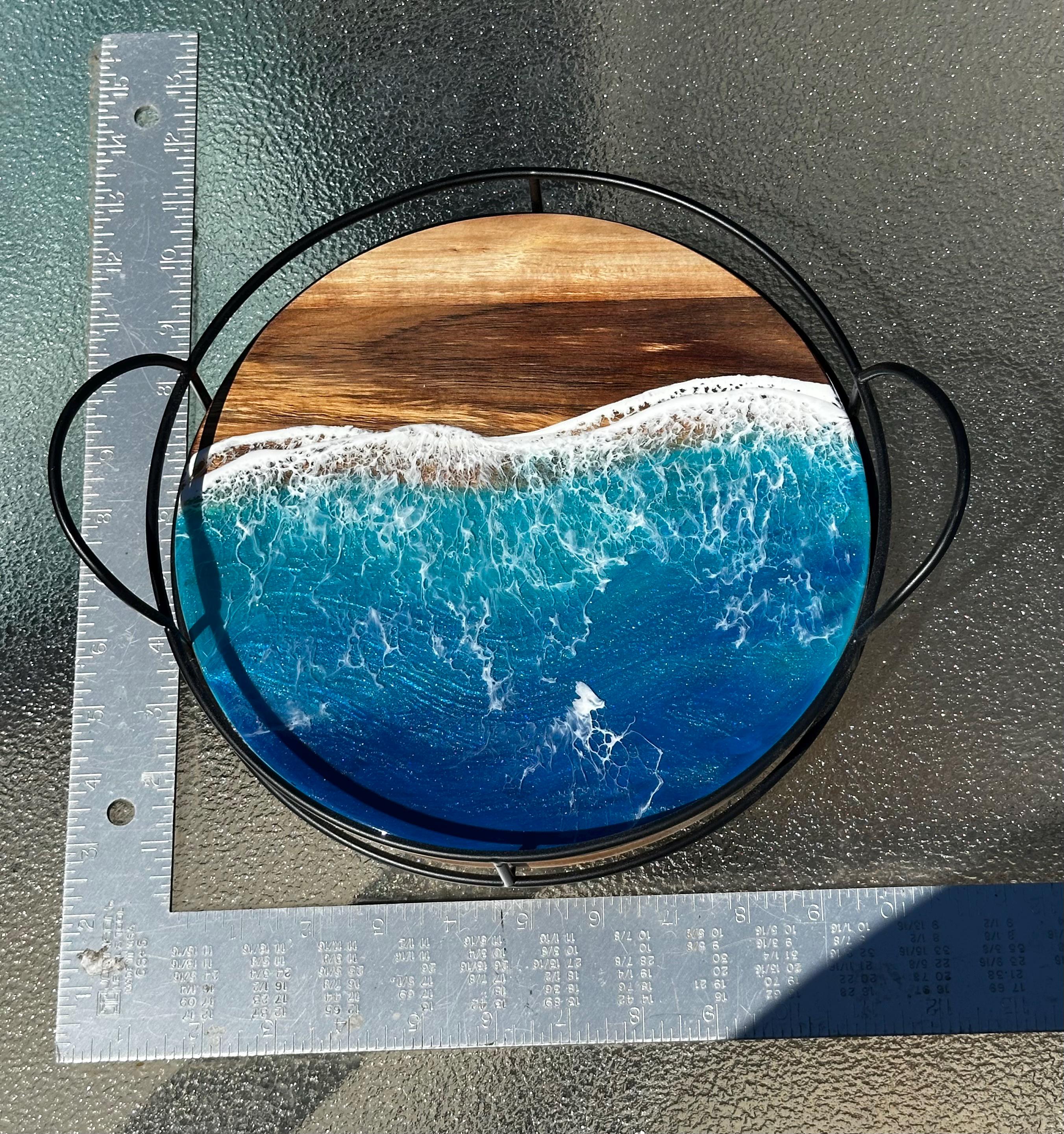 Original functional art. This is a 12.5" lazy Susan- the wood portion is 10.16 inches the full width in the holder is 12.13 inches with ocean waves poured with resin. This adds a coastal vibe to any home.