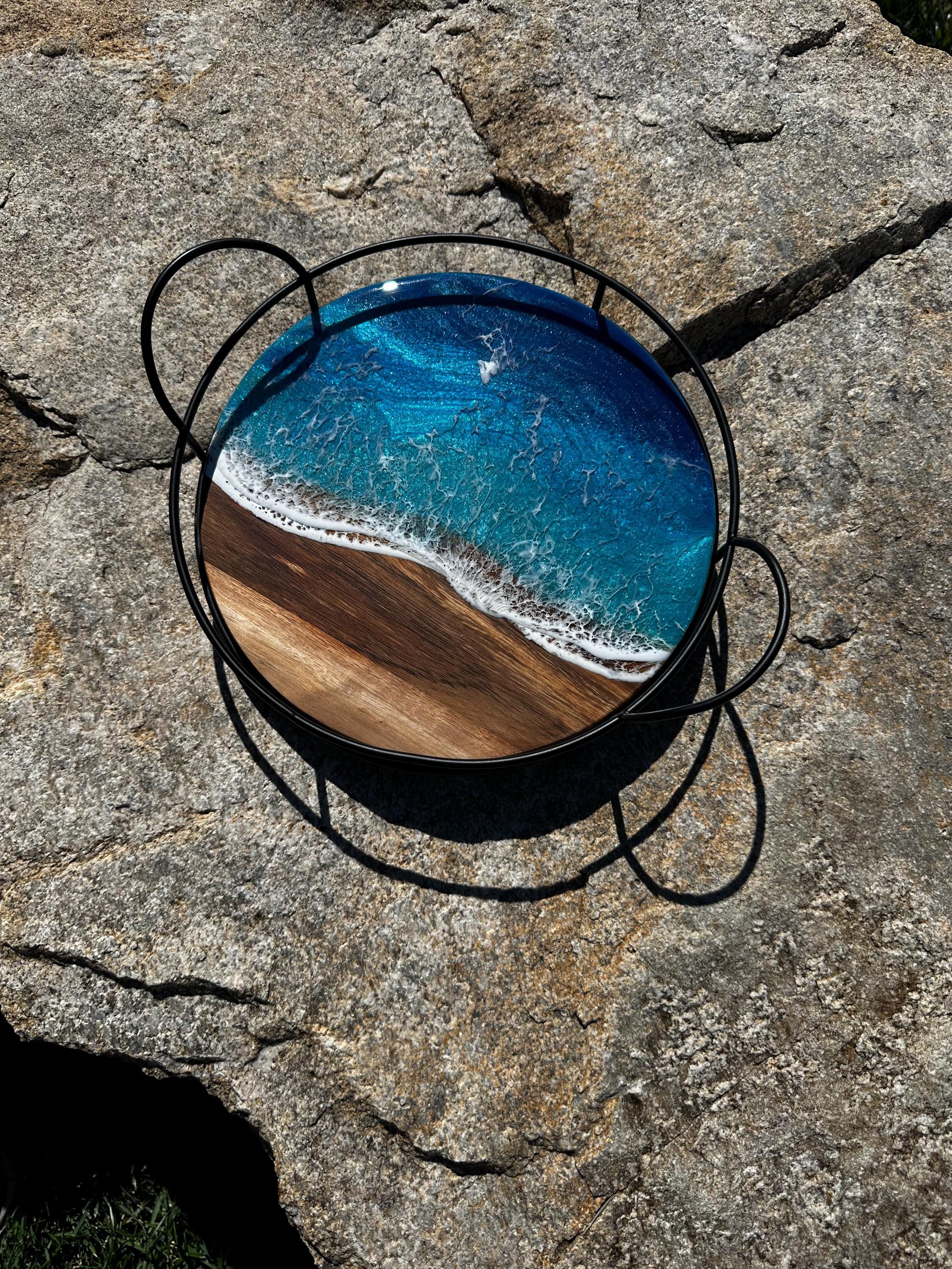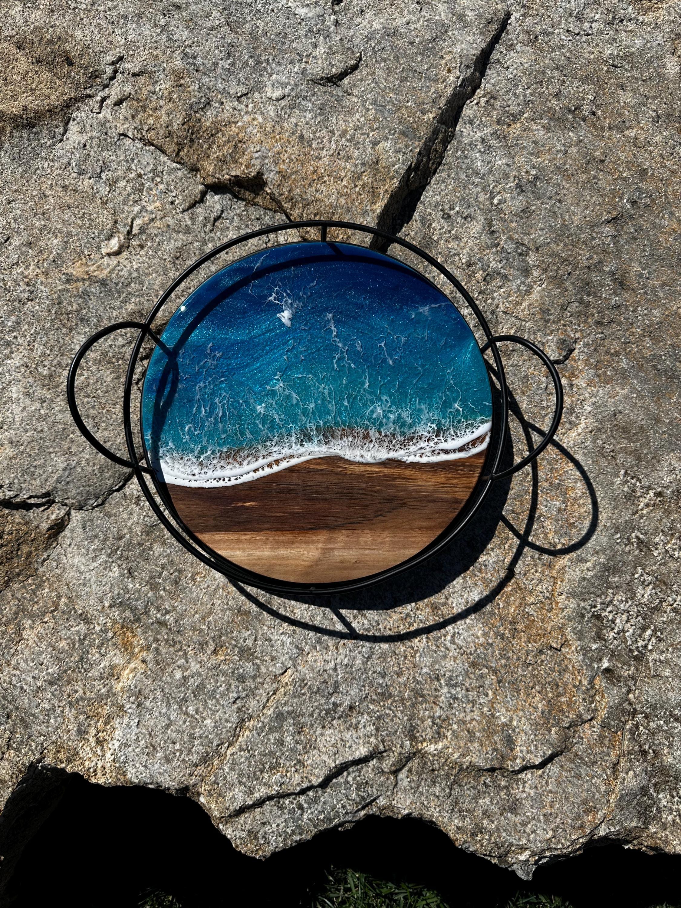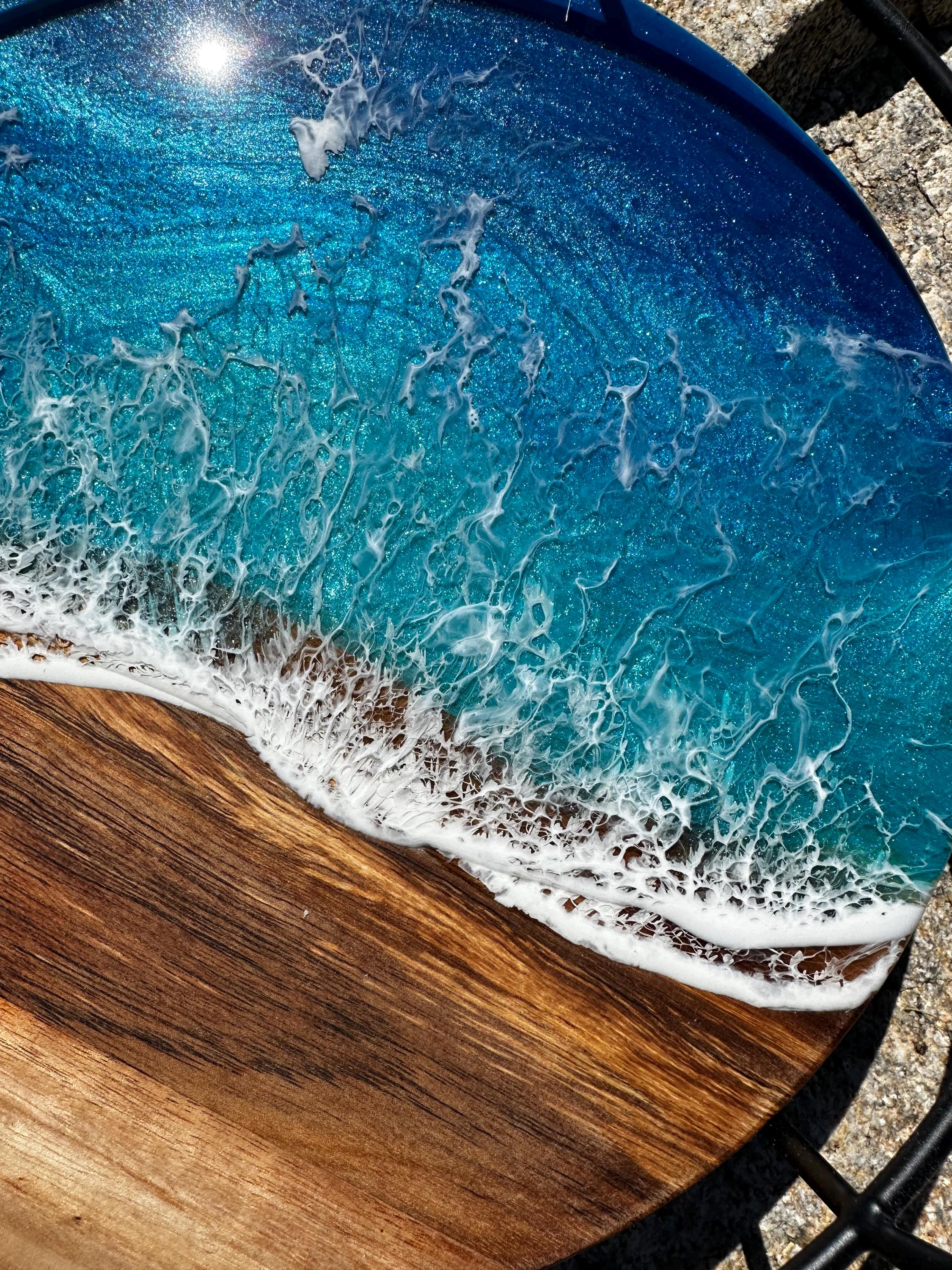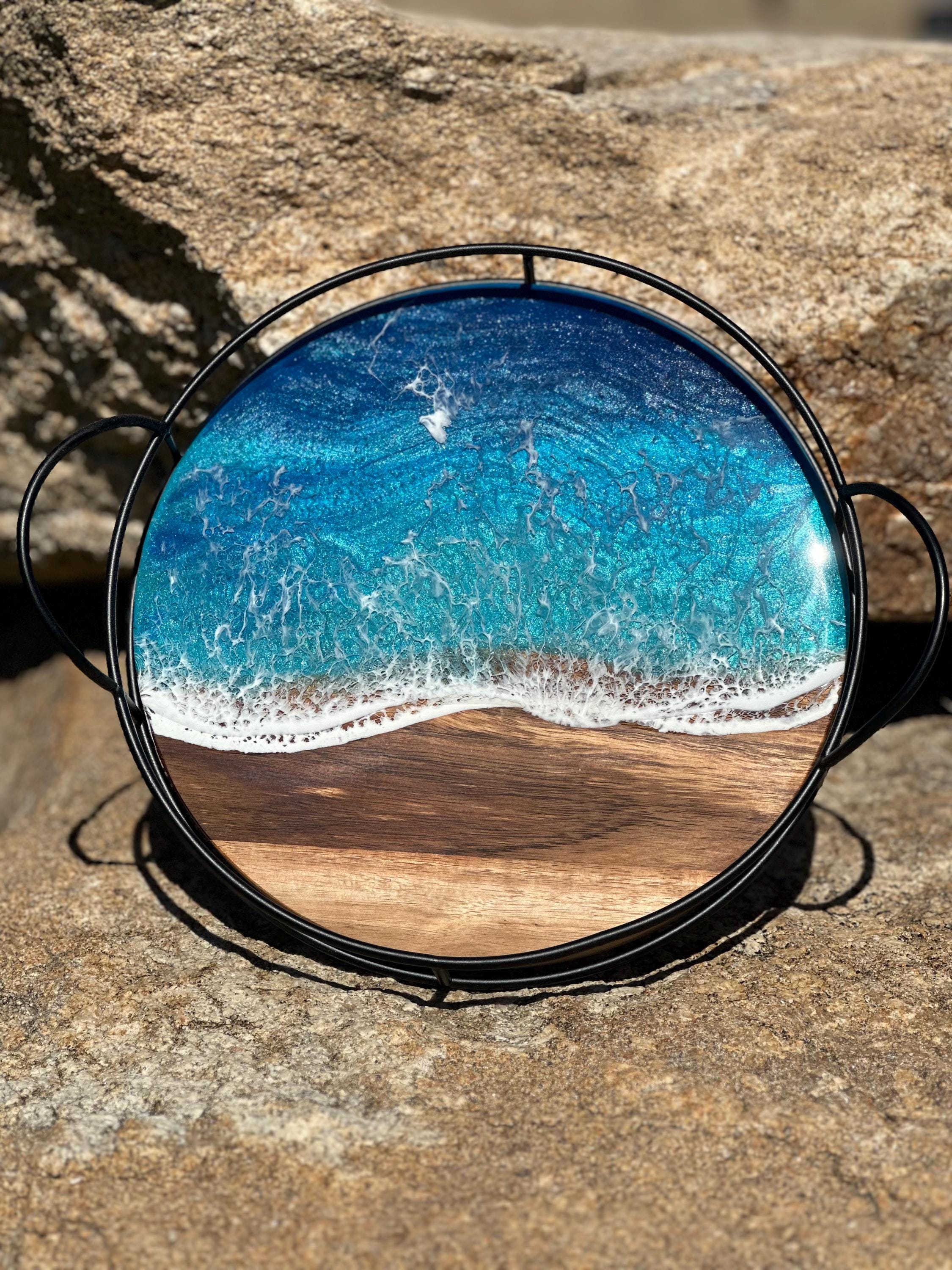 Original functional art. This is a 12.5" lazy Susan- the wood portion is 10.16 inches the full width in the holder is 12.13 inches with ocean waves poured with resin. This adds a coastal vibe to any home.