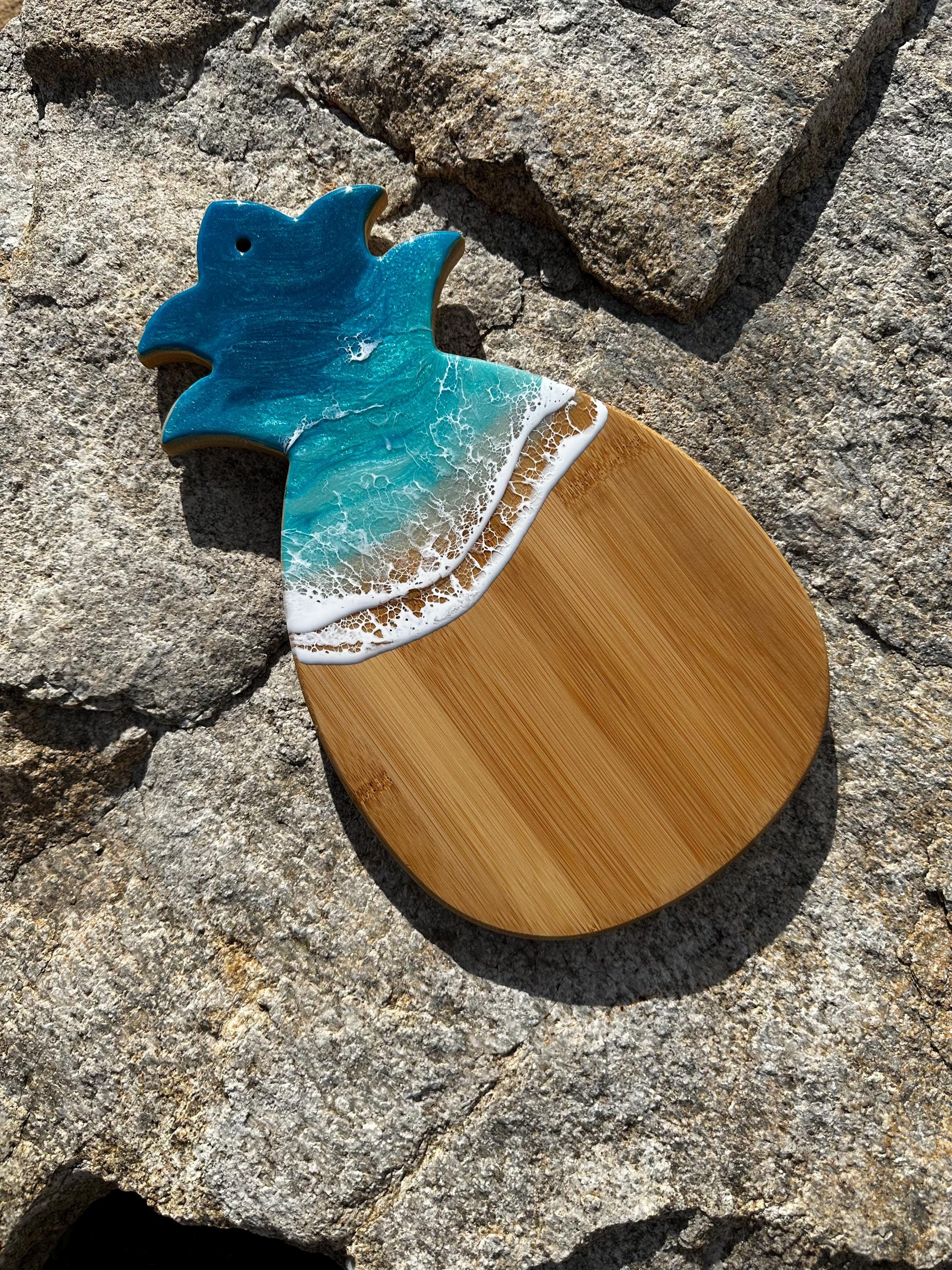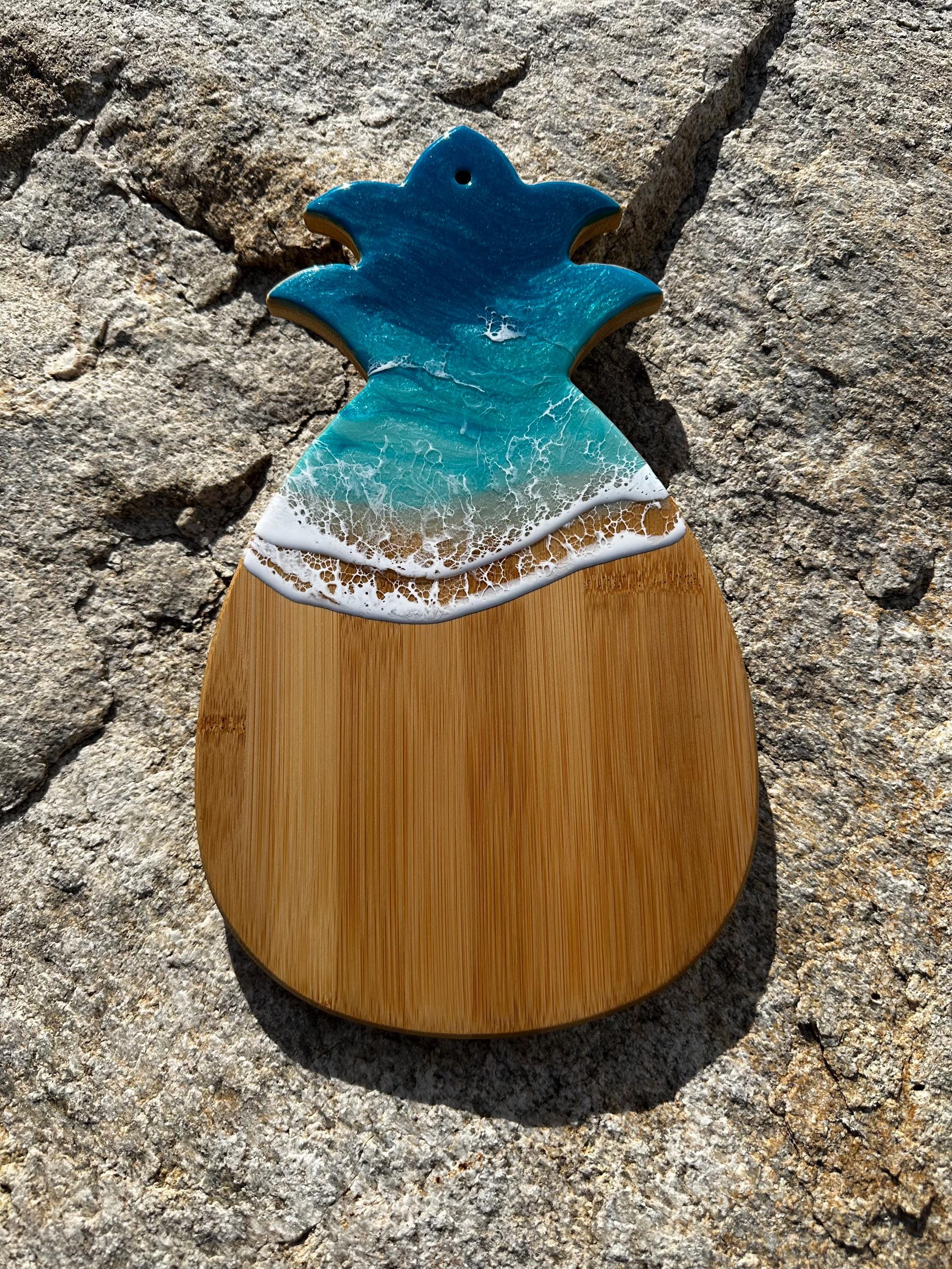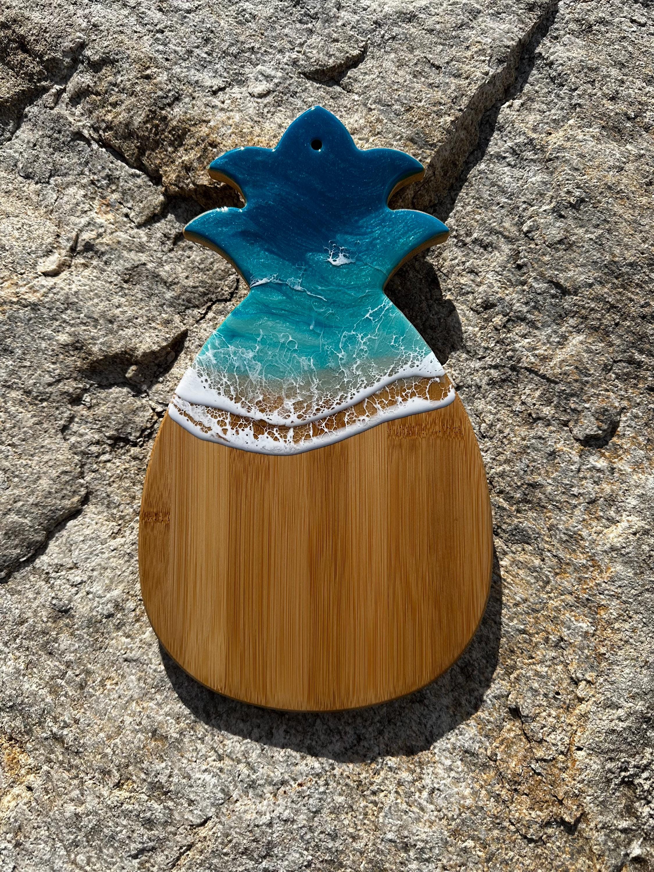Resin serving board made on bamboo wood shaped pineapple. Perfect for charcuterie boards, cheese board, or simply a cutting board. Leave this beautiful board out on your counter or hung on the wall for decoration and it will also be easily accessible for a quick cheese platter or charcuterie board. Ocean waves are realistic and so beautiful. Colors of the ocean on this piece are deep dark turquoise, teal blue and aqua throughout with crisp white waves.