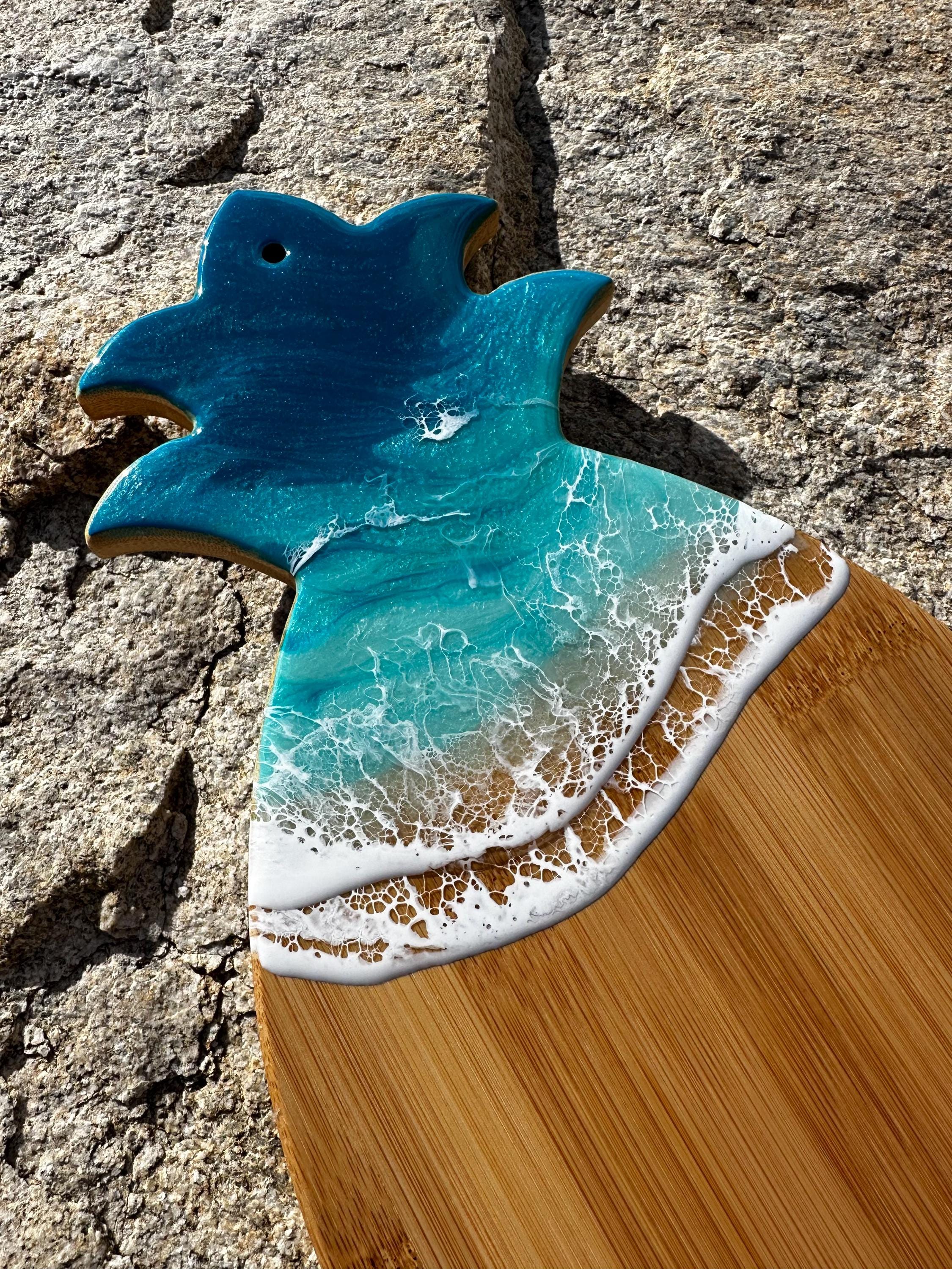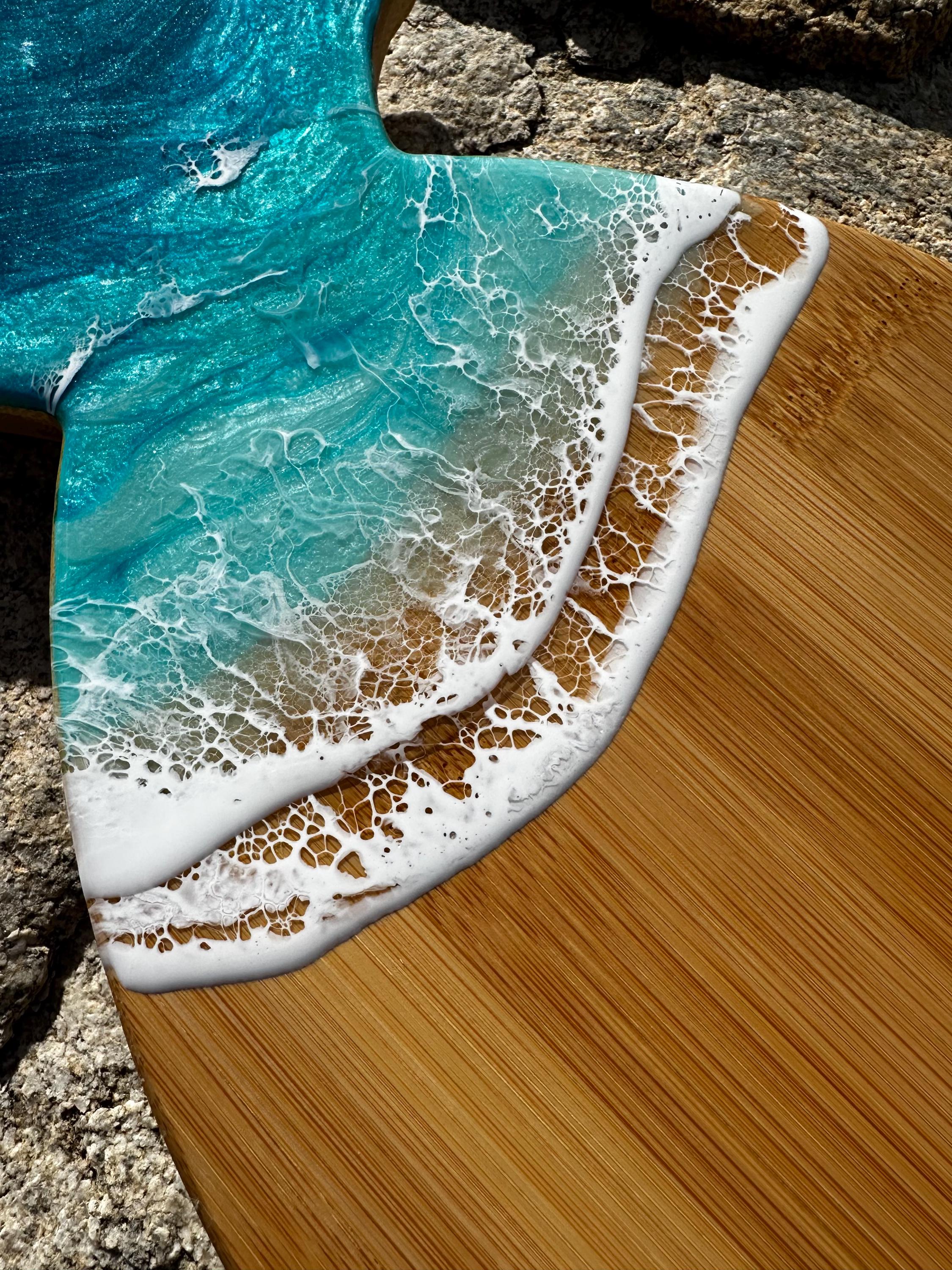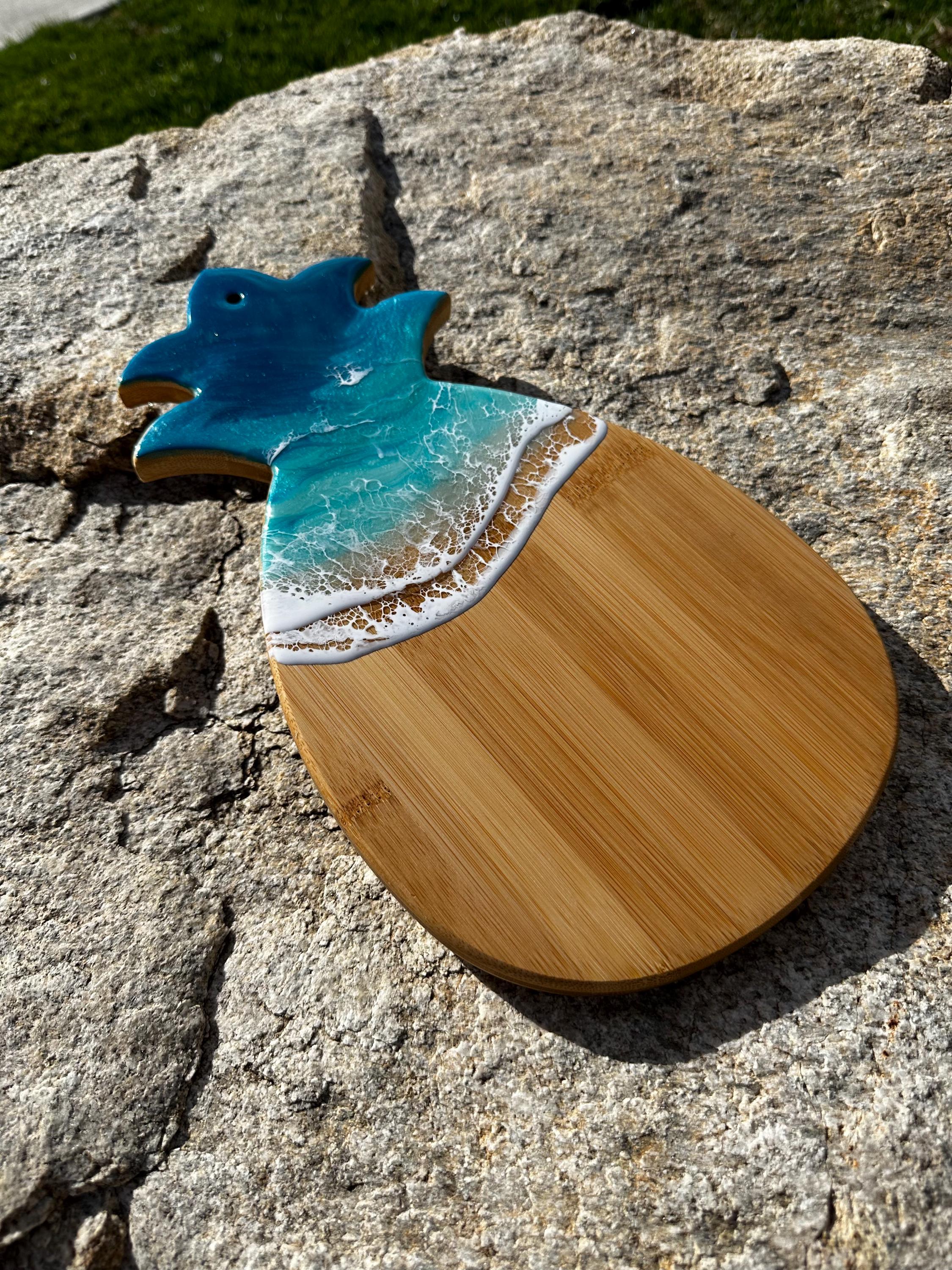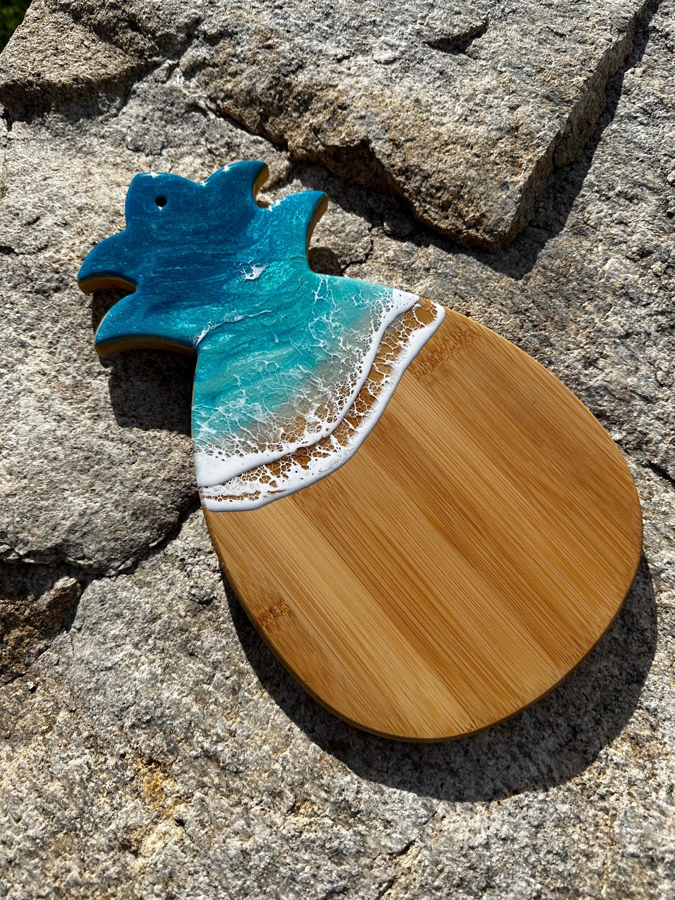 Resin serving board made on bamboo wood shaped pineapple. Perfect for charcuterie boards, cheese board, or simply a cutting board. Leave this beautiful board out on your counter or hung on the wall for decoration and it will also be easily accessible for a quick cheese platter or charcuterie board. Ocean waves are realistic and so beautiful. Colors of the ocean on this piece are deep dark turquoise, teal blue and aqua throughout with crisp white waves.
