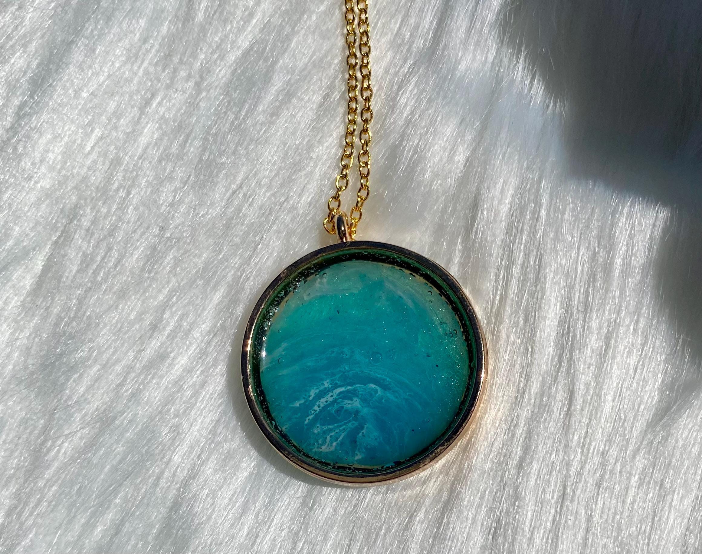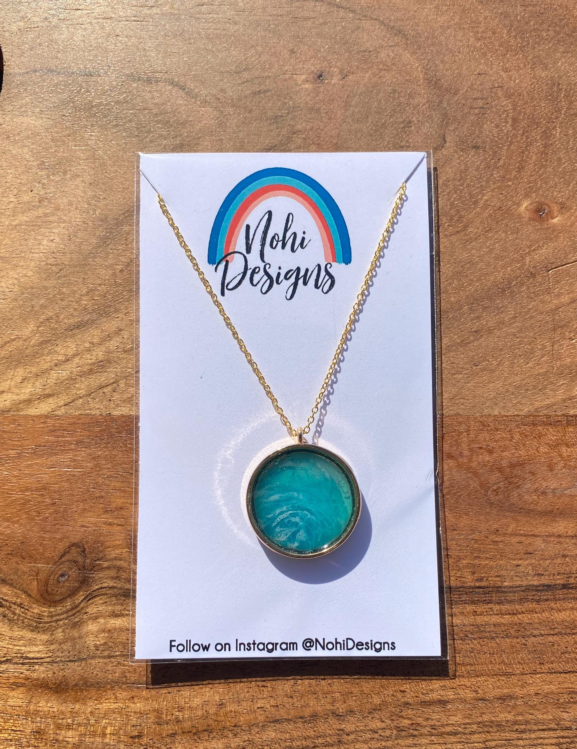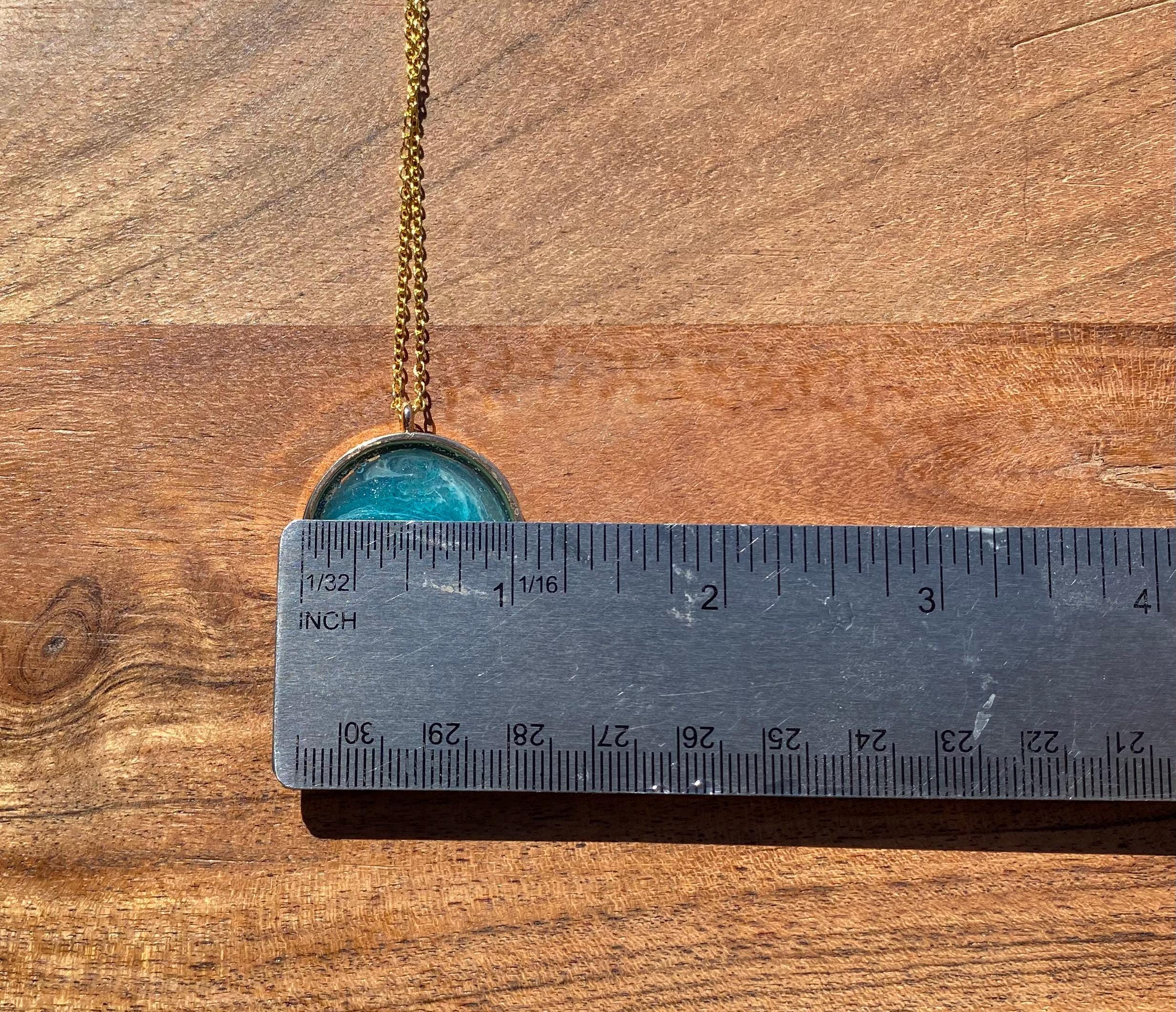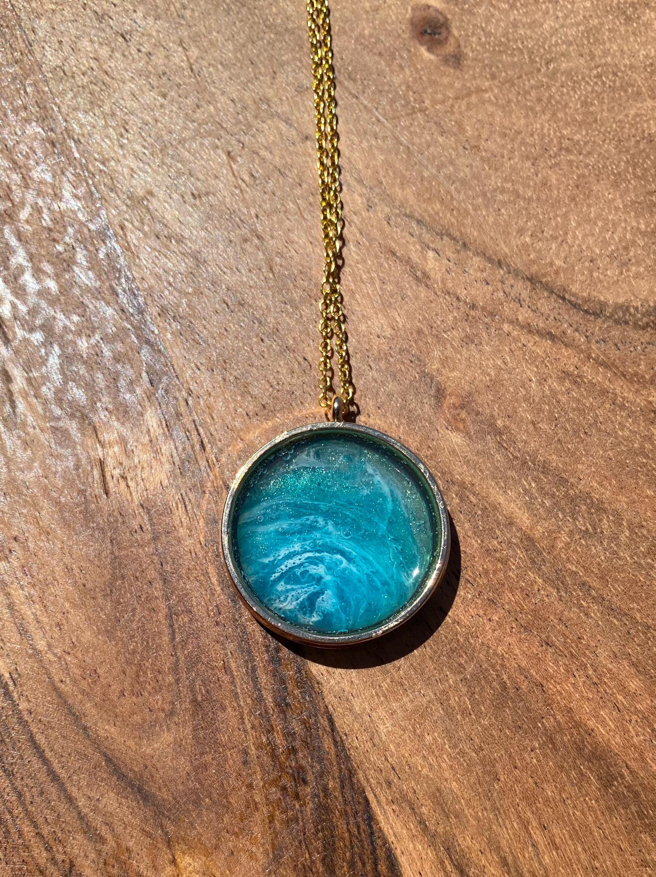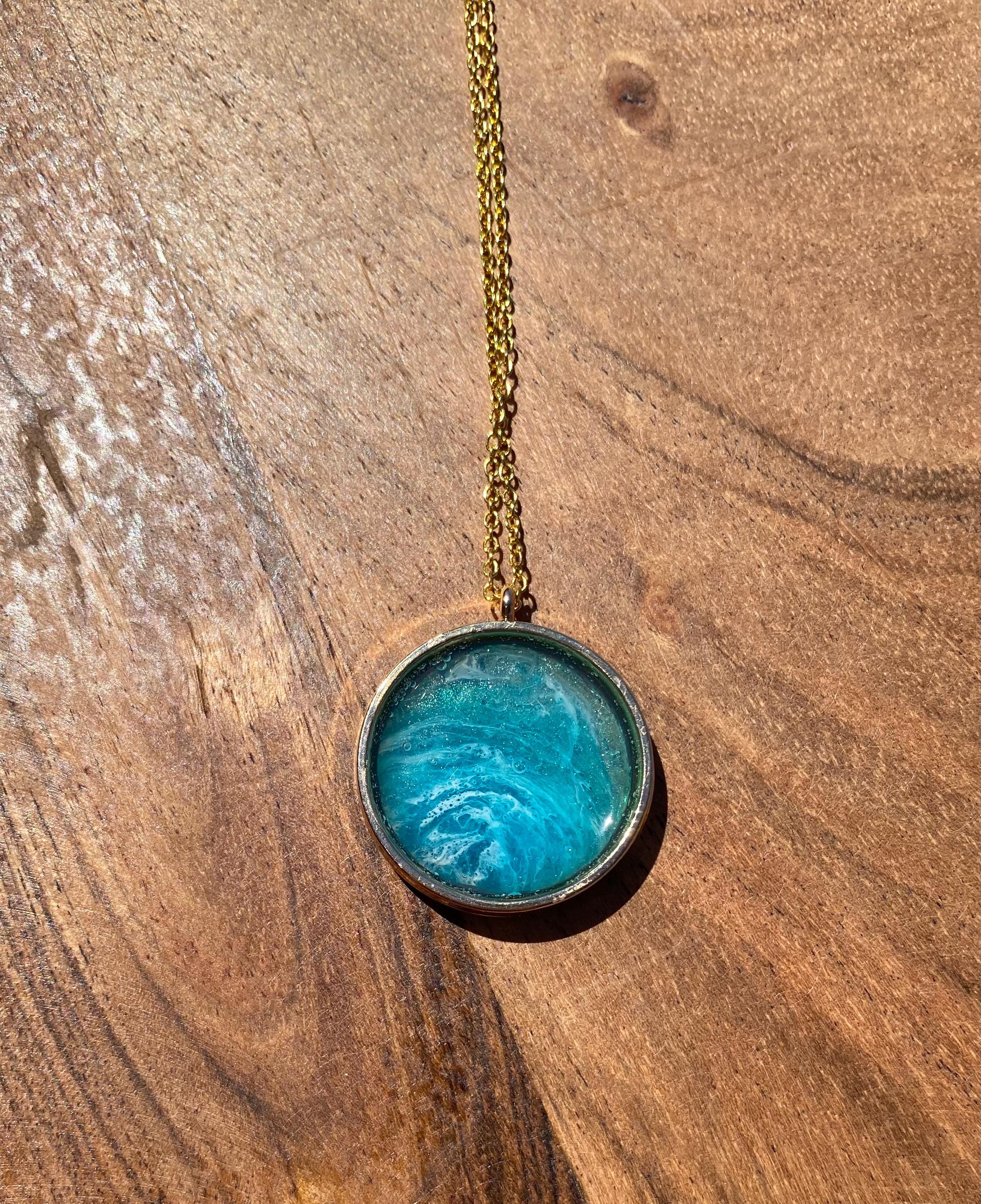 A one-of-a-kind abstract piece of art created with resin pigments. Pendant comes with a 18” coordinating chain.