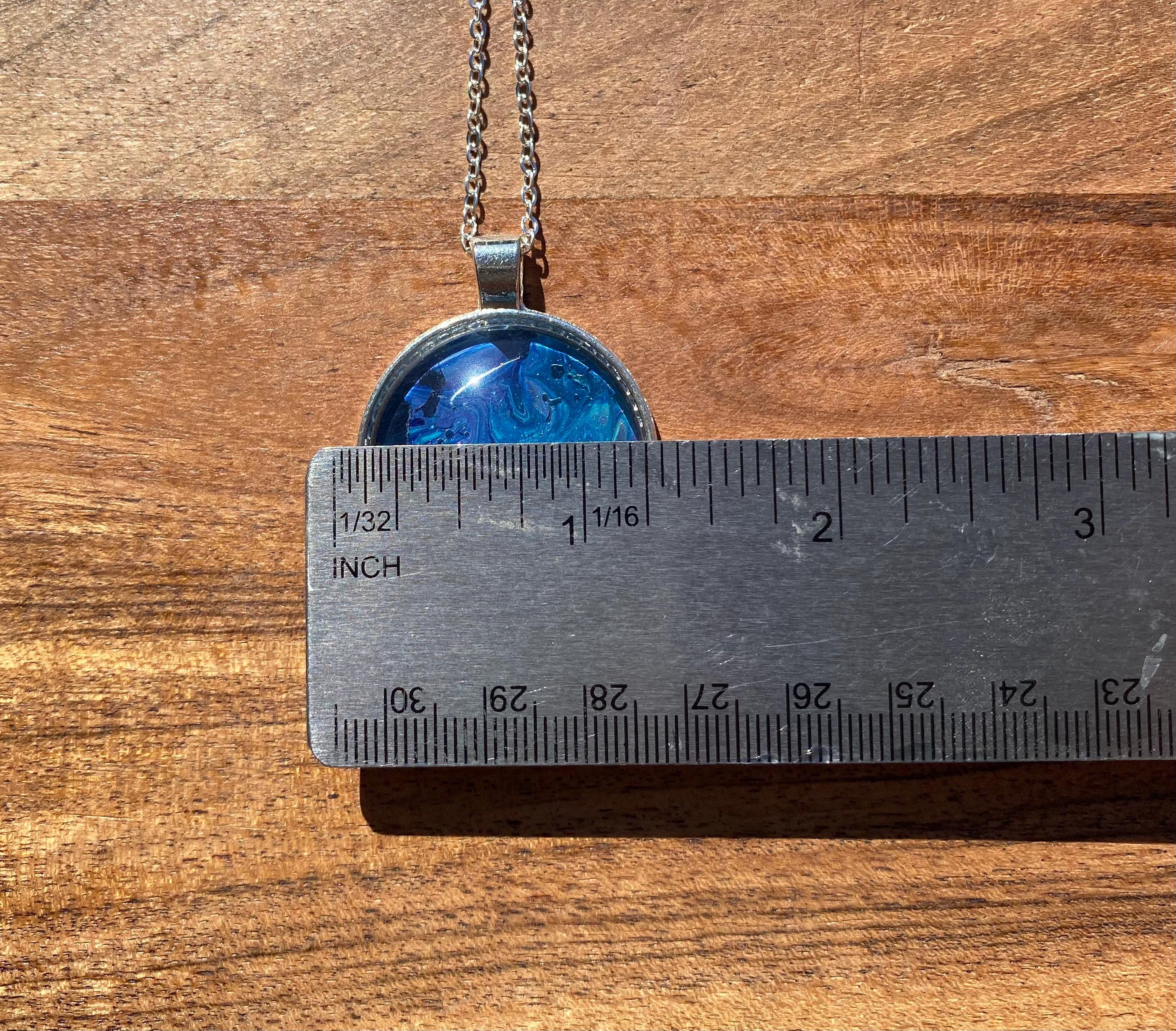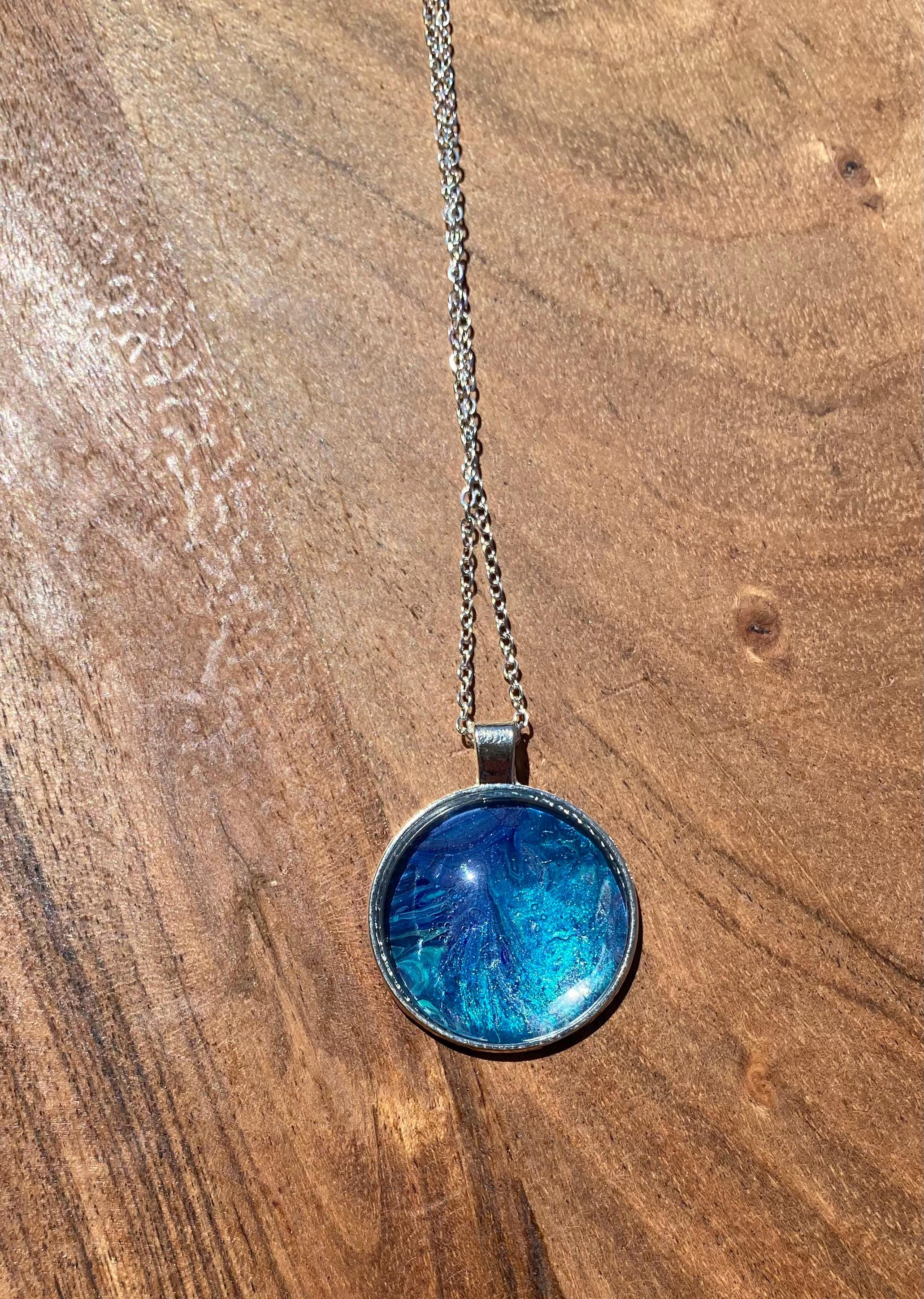A one-of-a-kind abstract piece of art in a pendant with a glass cabochon protecting the art. Pendant comes with a 18” coordinating chain.