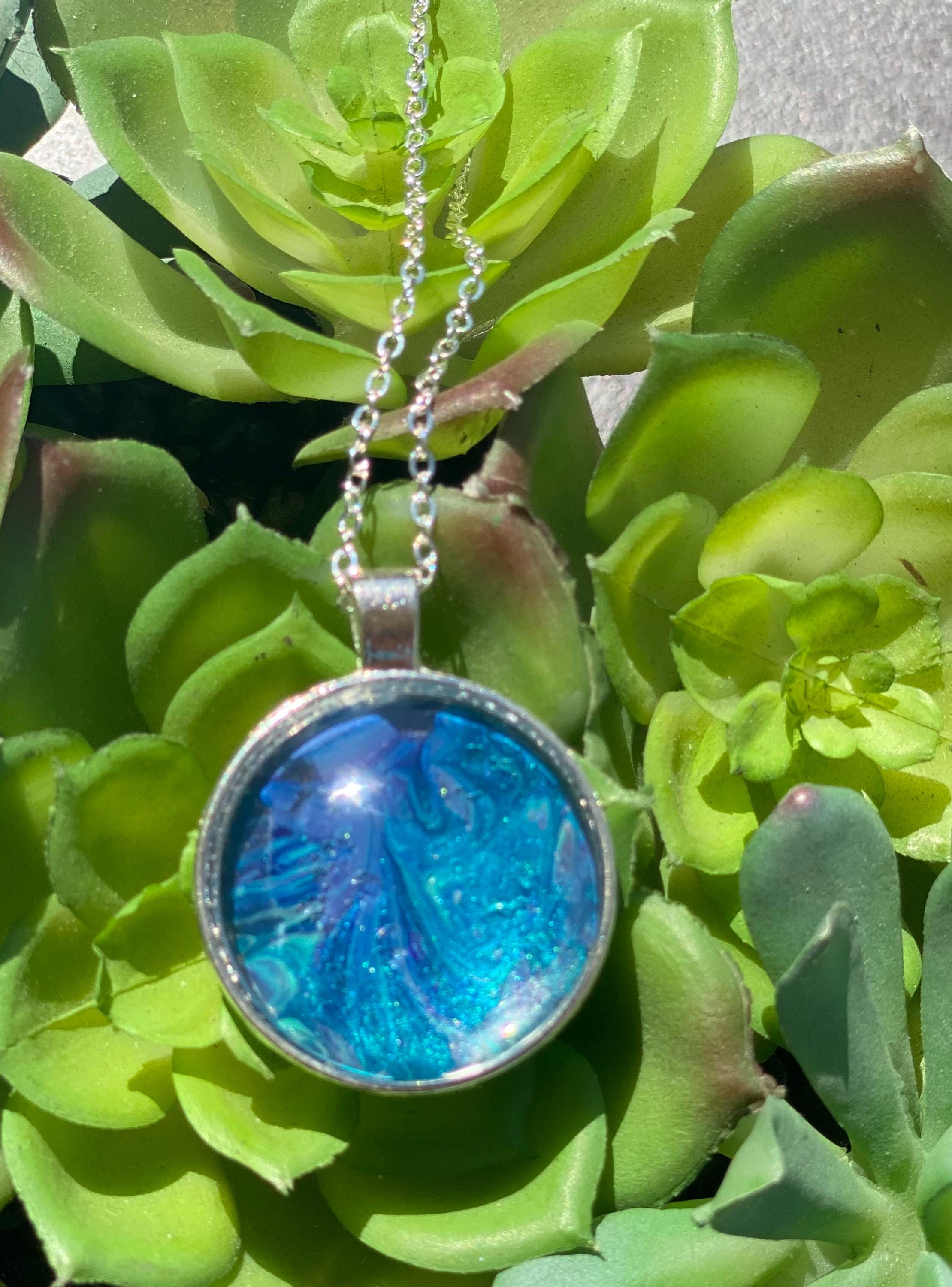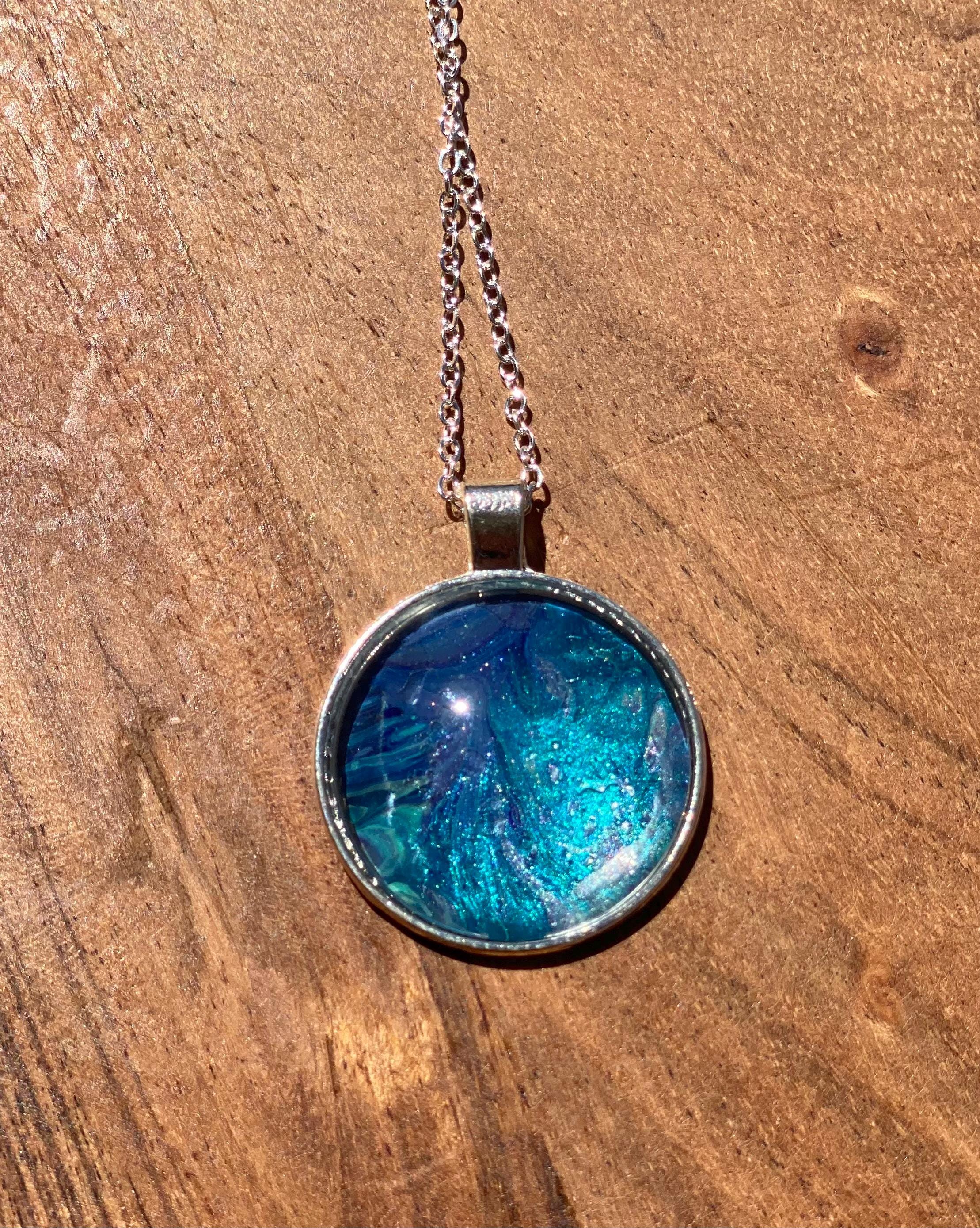 I truly enjoy mixed media art. One of the arts that I enjoy is acrylic pour painting. When you create these beautiful pieces of art you create custom mixes of paint during the canvas paintings. From that session you are left with pools of gorgeous one of a kind abstract art. From that art I remove my favorite pieces and create beautiful jewelry to be enjoyed day in and day out and coordinate beautifully with your wardrobe. The necklaces make wonderful one-of-a-kind gifts.