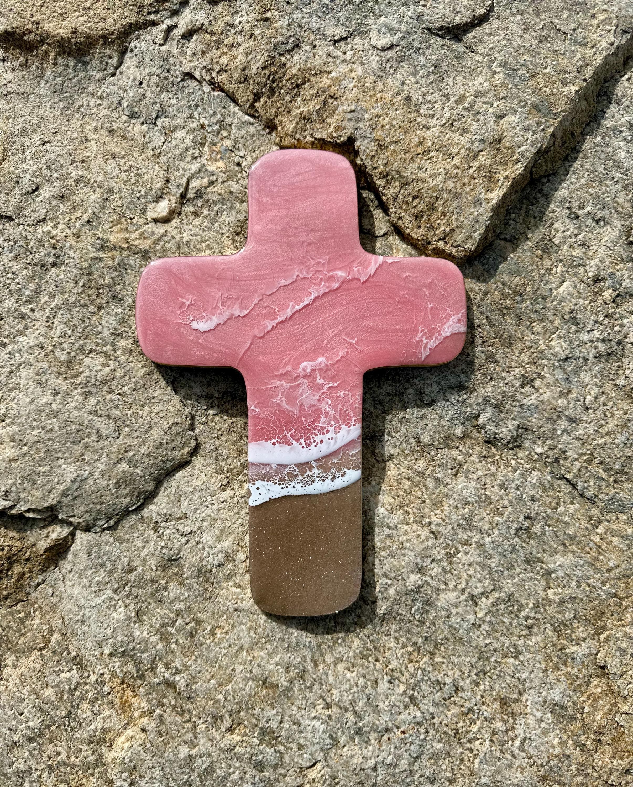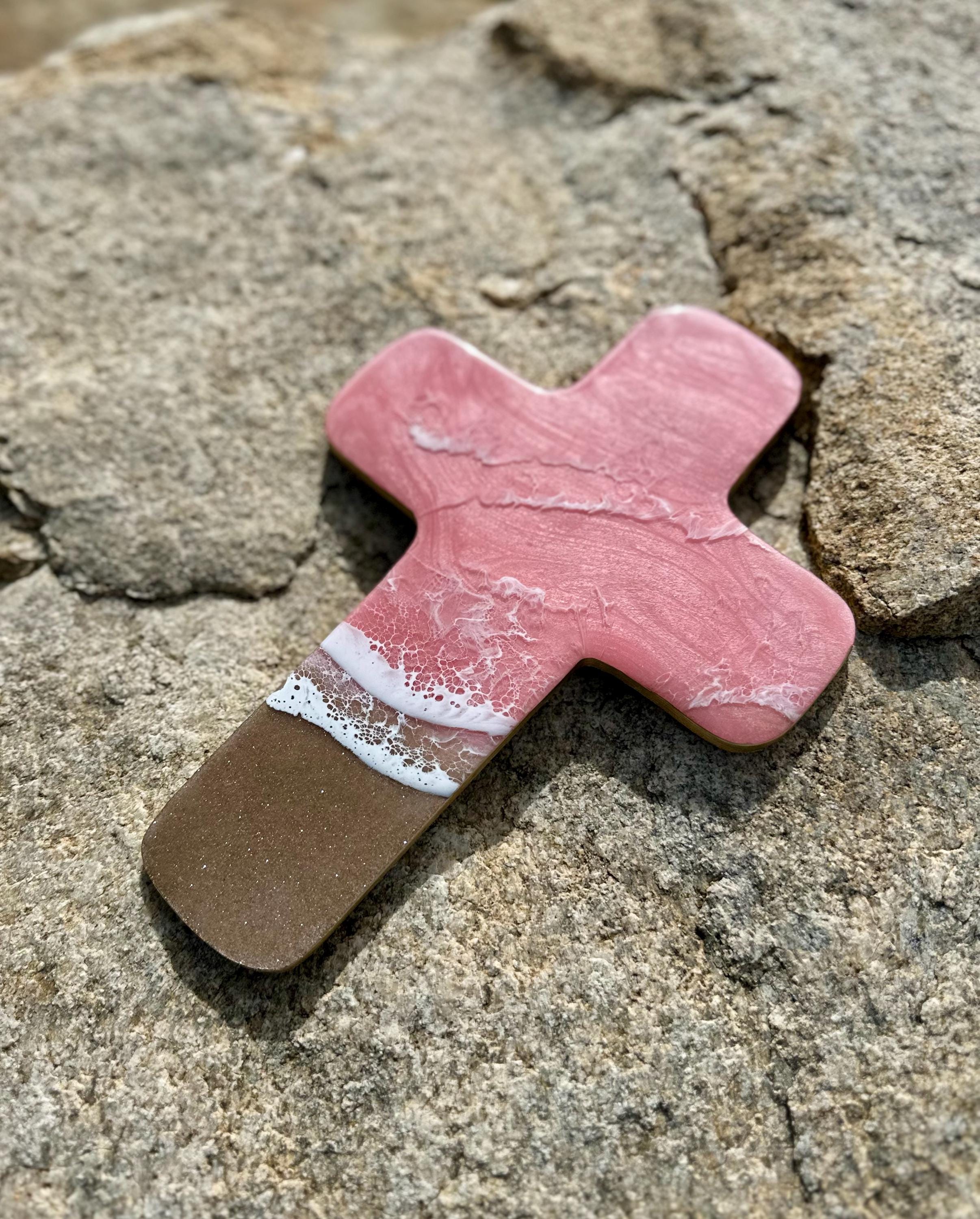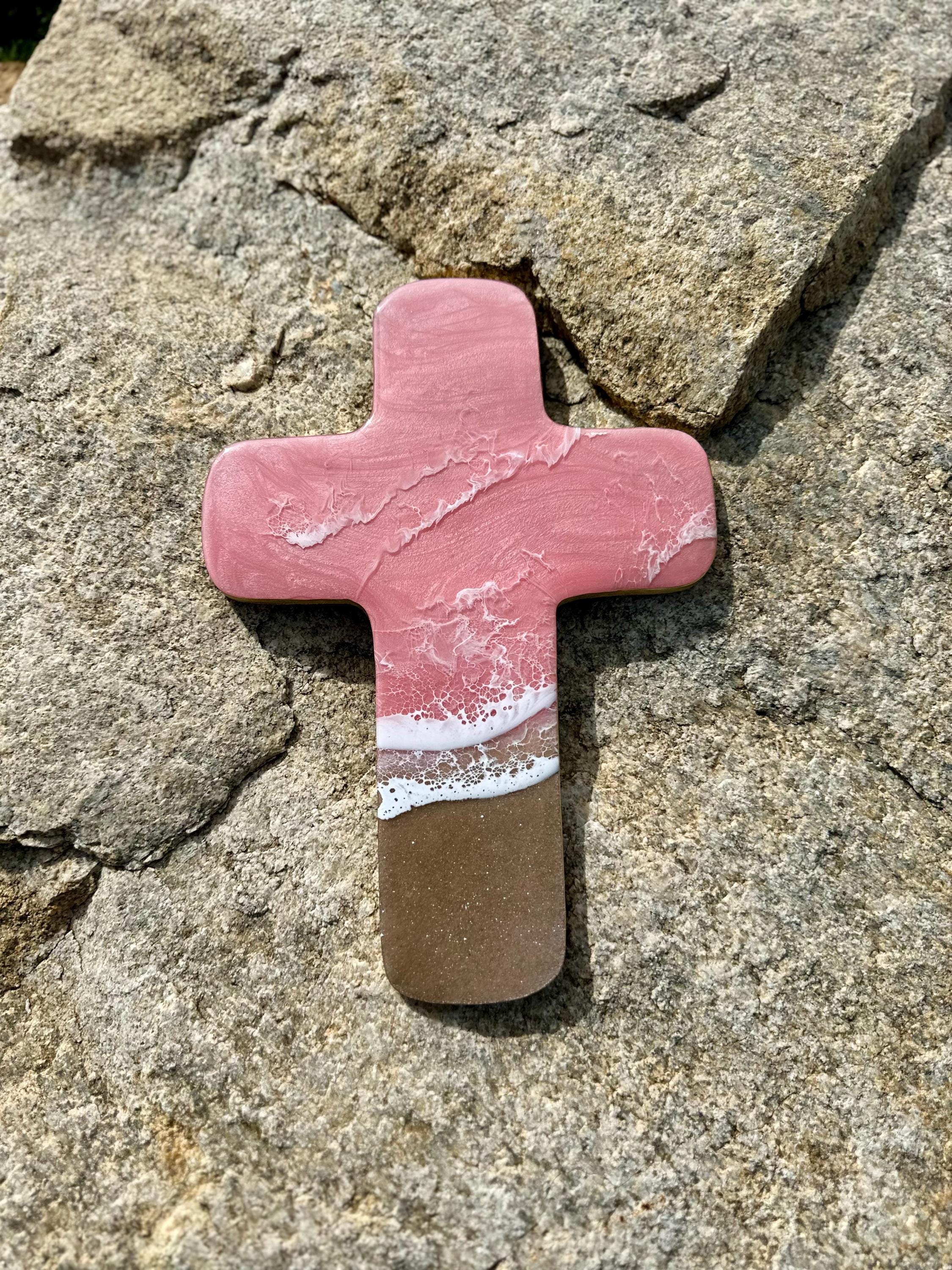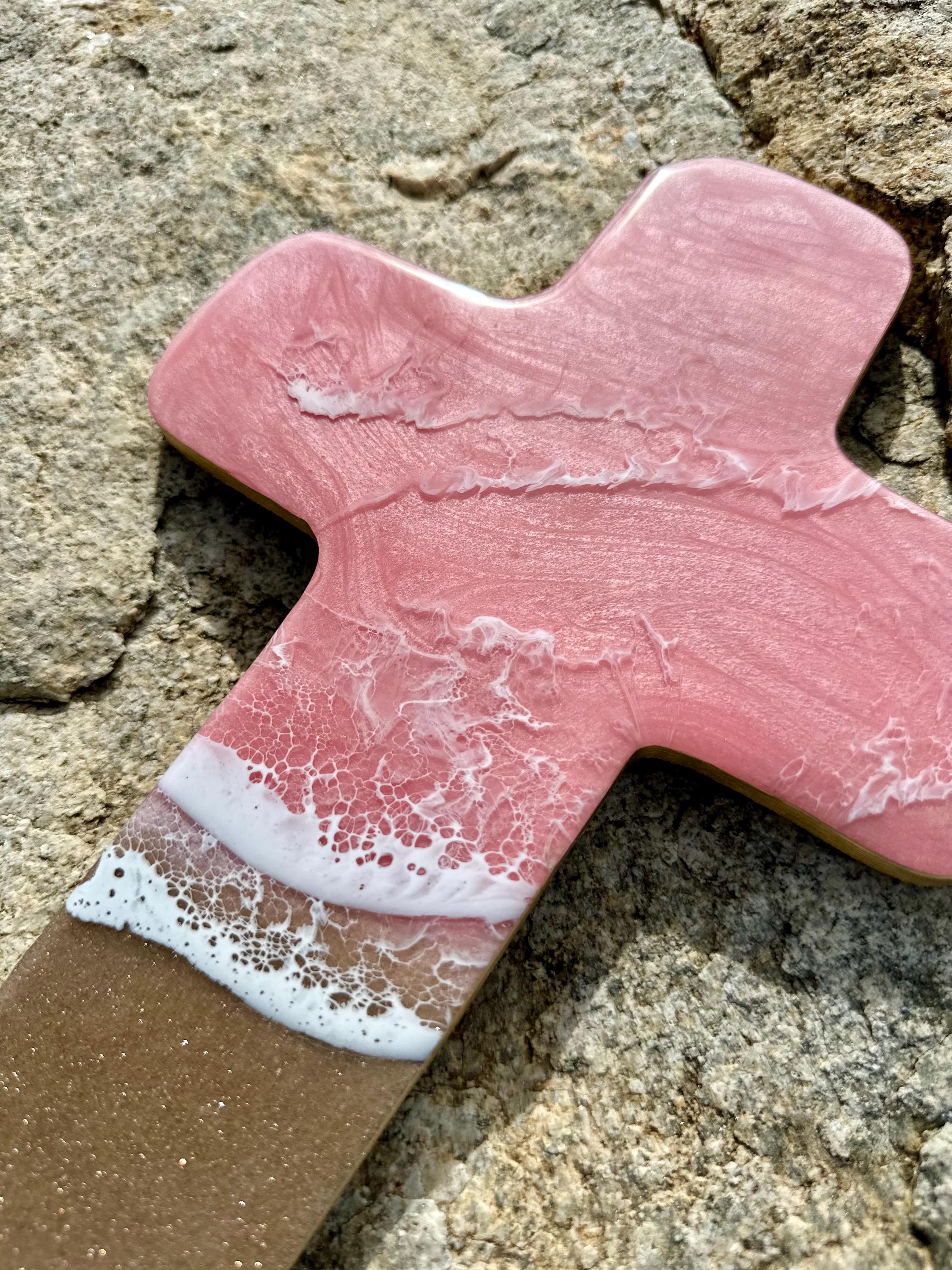 This is a wood cut out in the shape of a cross with a resin ocean scene on top. The waves have multiple layers of waves hitting the shore. The layers of waves help to create the dimension of real water. The water consists of colors of a beautiful baby pink with crisp white waves crashing on the sandy beach area. The beach area is made from real sand mixed with glitter for that sparkle and shine you see at the beach. This piece can be hung on a wall and displayed proudly. Easy addition to any room in your home.