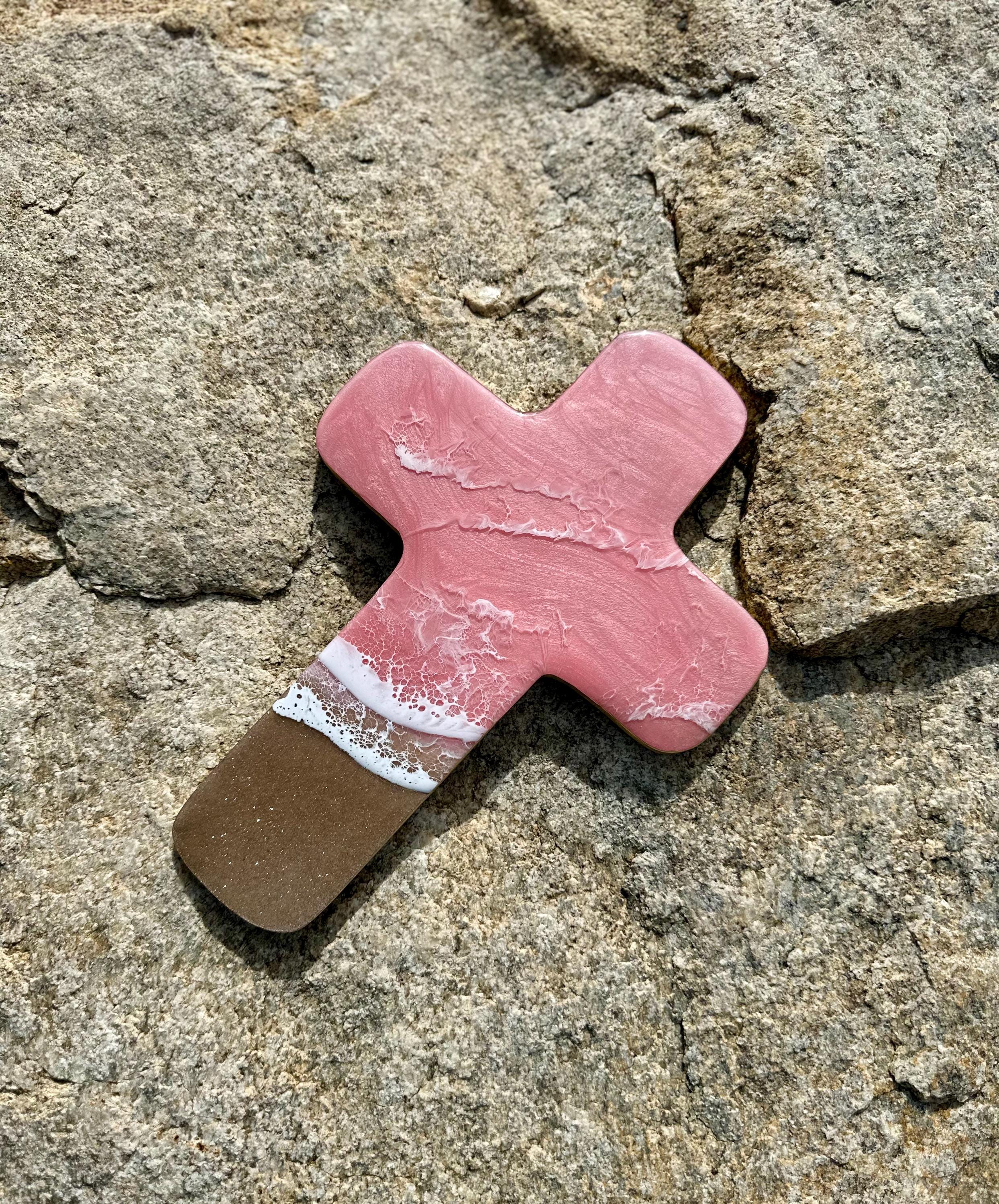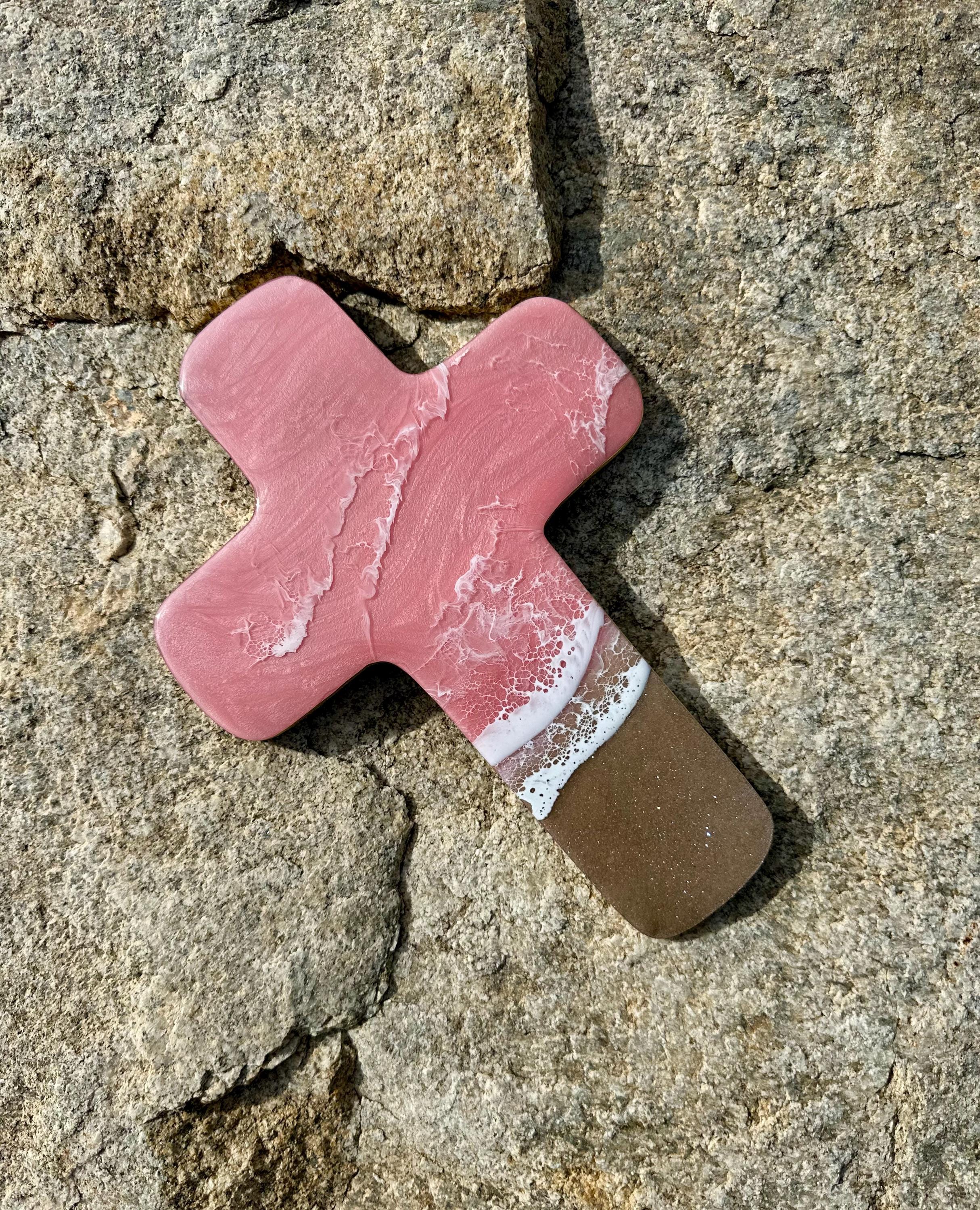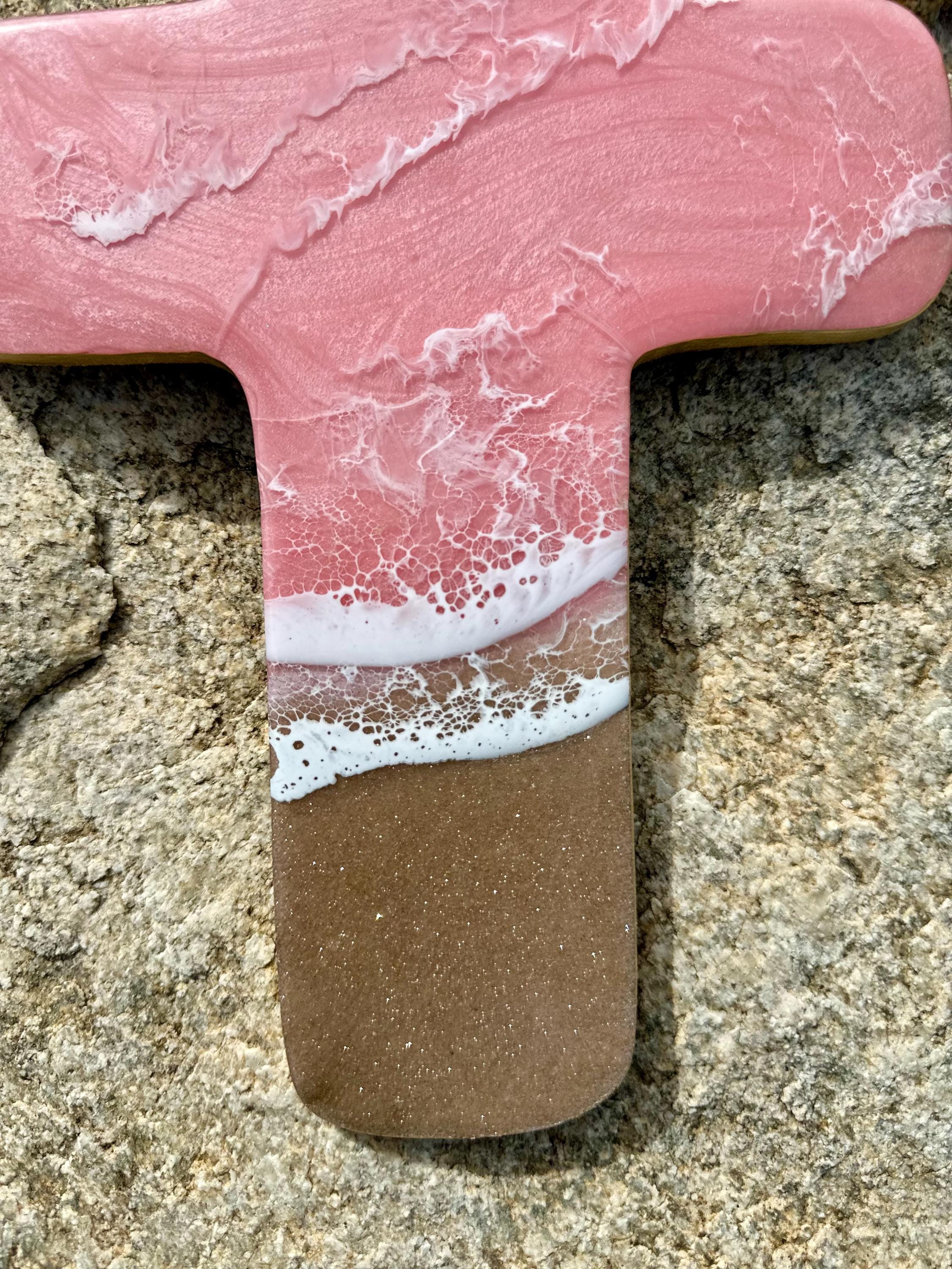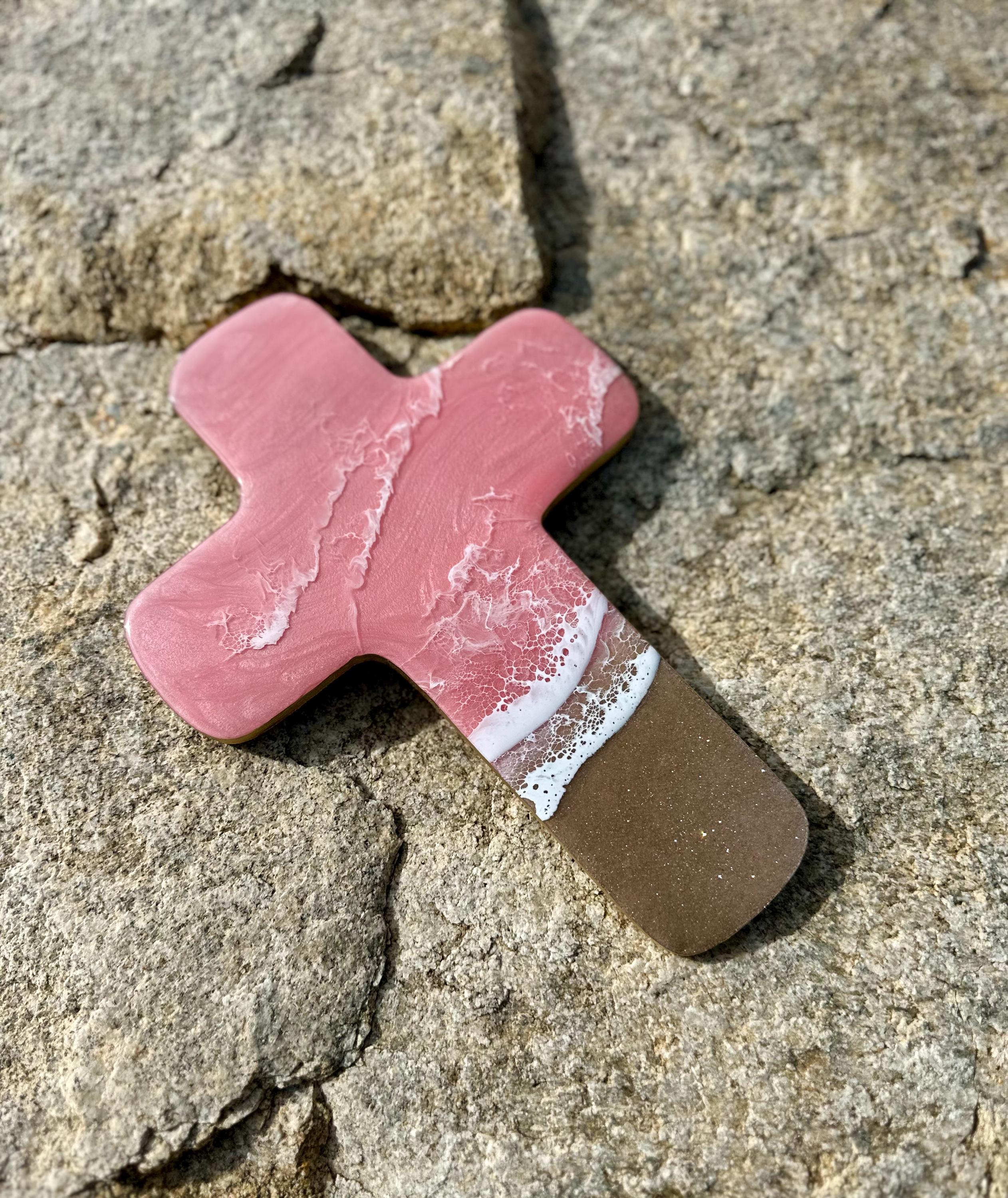 This is a wood cut out in the shape of a cross with a resin ocean scene on top. The waves have multiple layers of waves hitting the shore. The layers of waves help to create the dimension of real water. The water consists of colors of a beautiful baby pink with crisp white waves crashing on the sandy beach area. The beach area is made from real sand mixed with glitter for that sparkle and shine you see at the beach. This piece can be hung on a wall and displayed proudly. Easy addition to any room in your home.