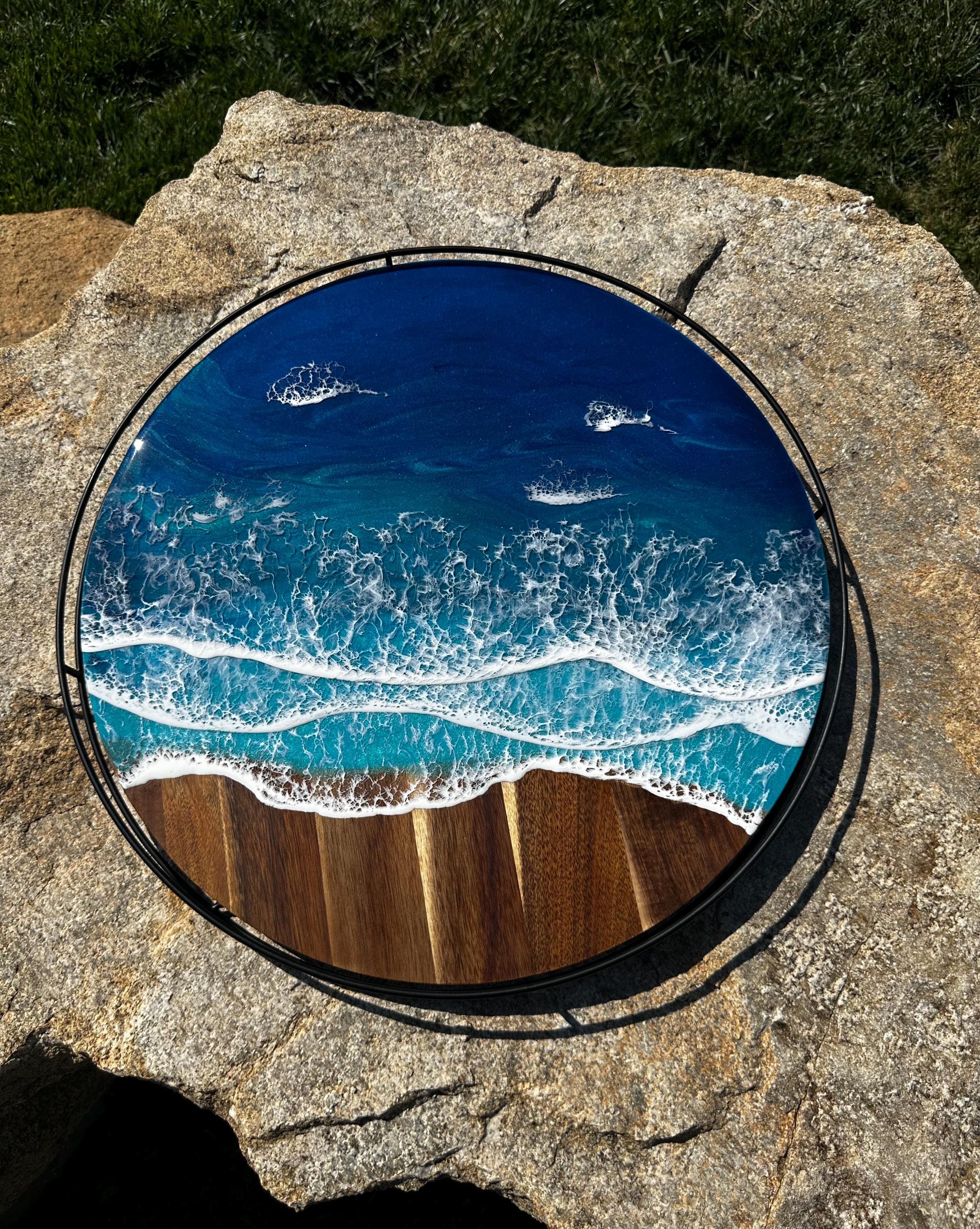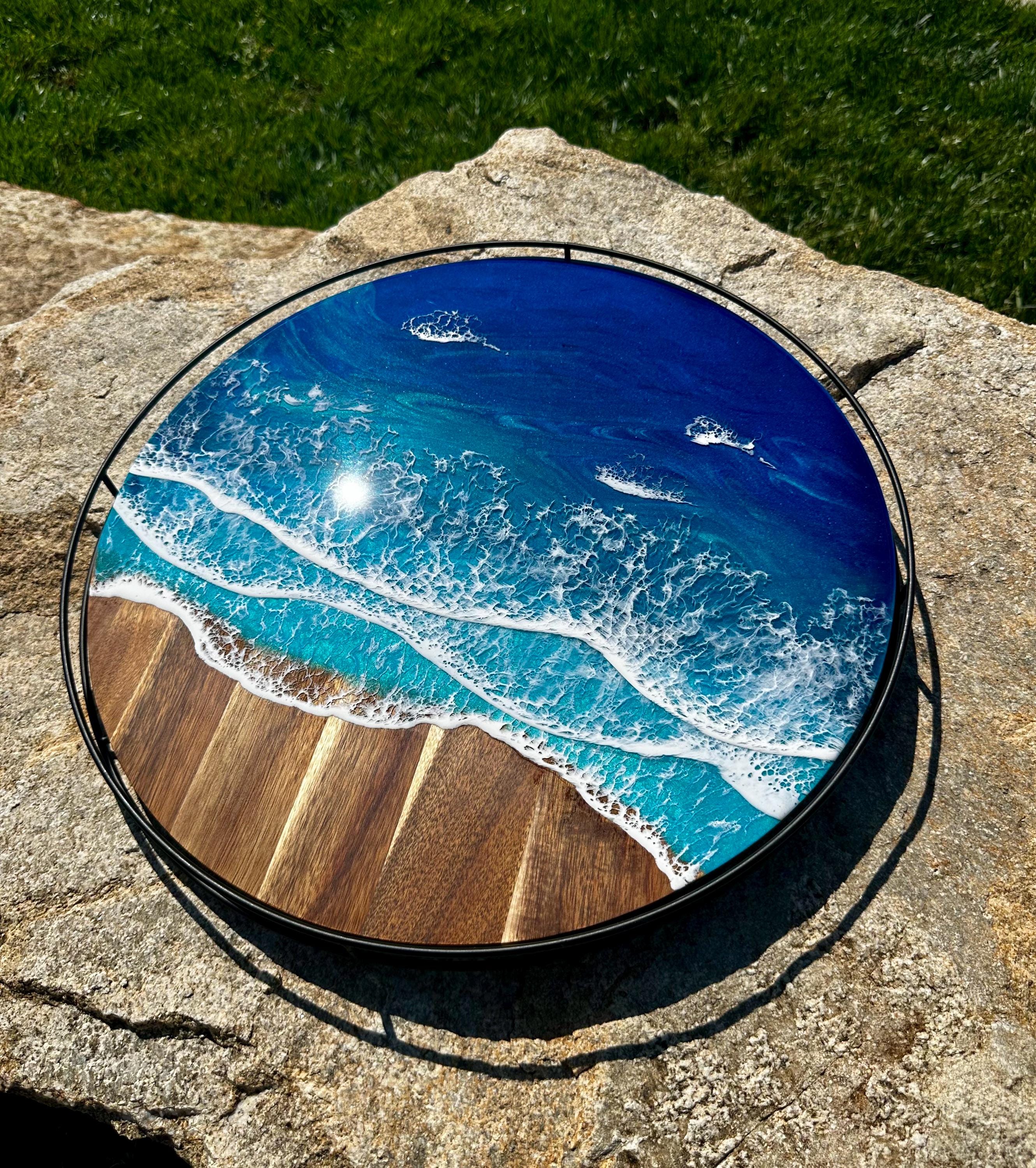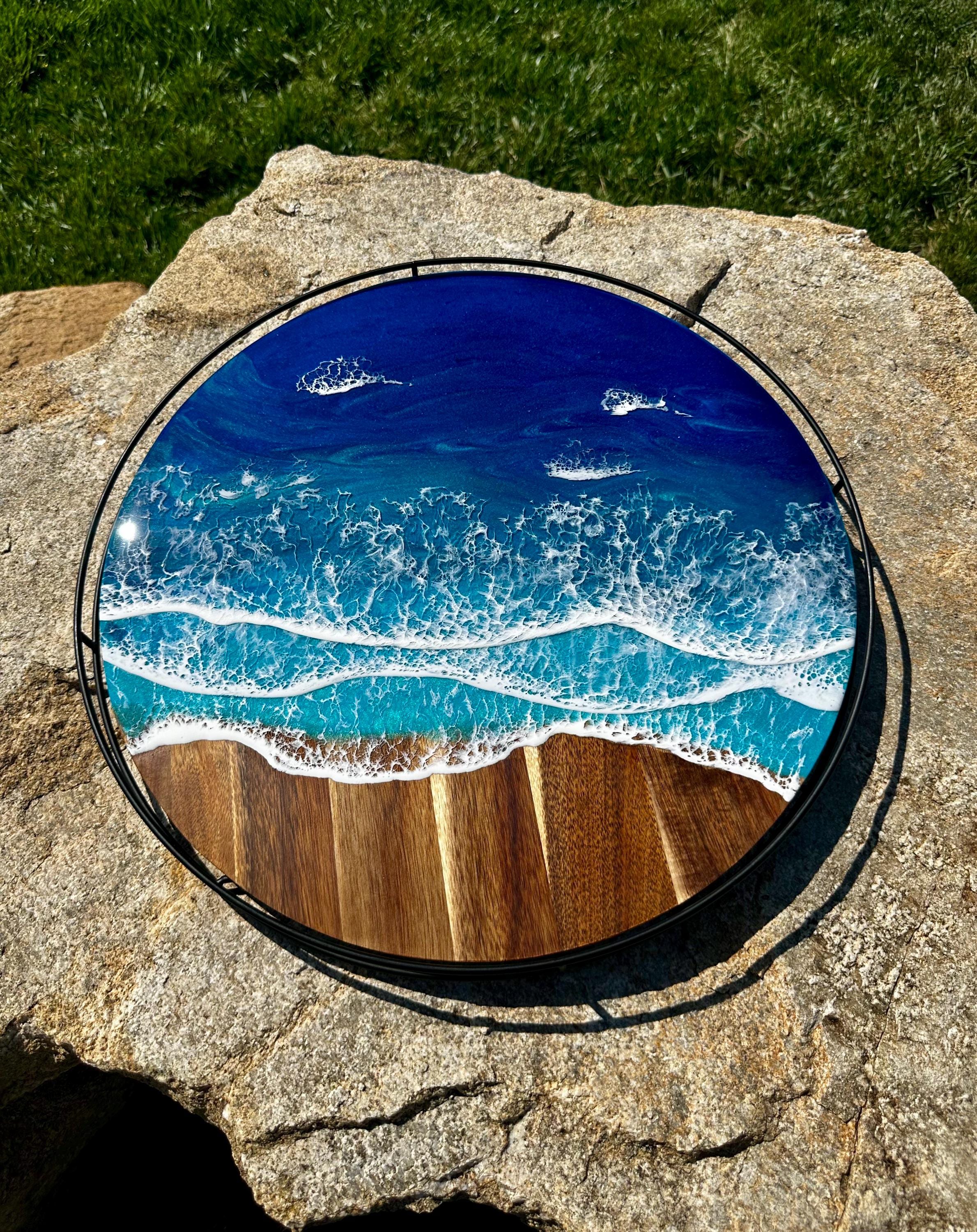 Original functional art. This is a 18" lazy Susan with ocean waves poured with resin. This adds a coastal vibe to any home.