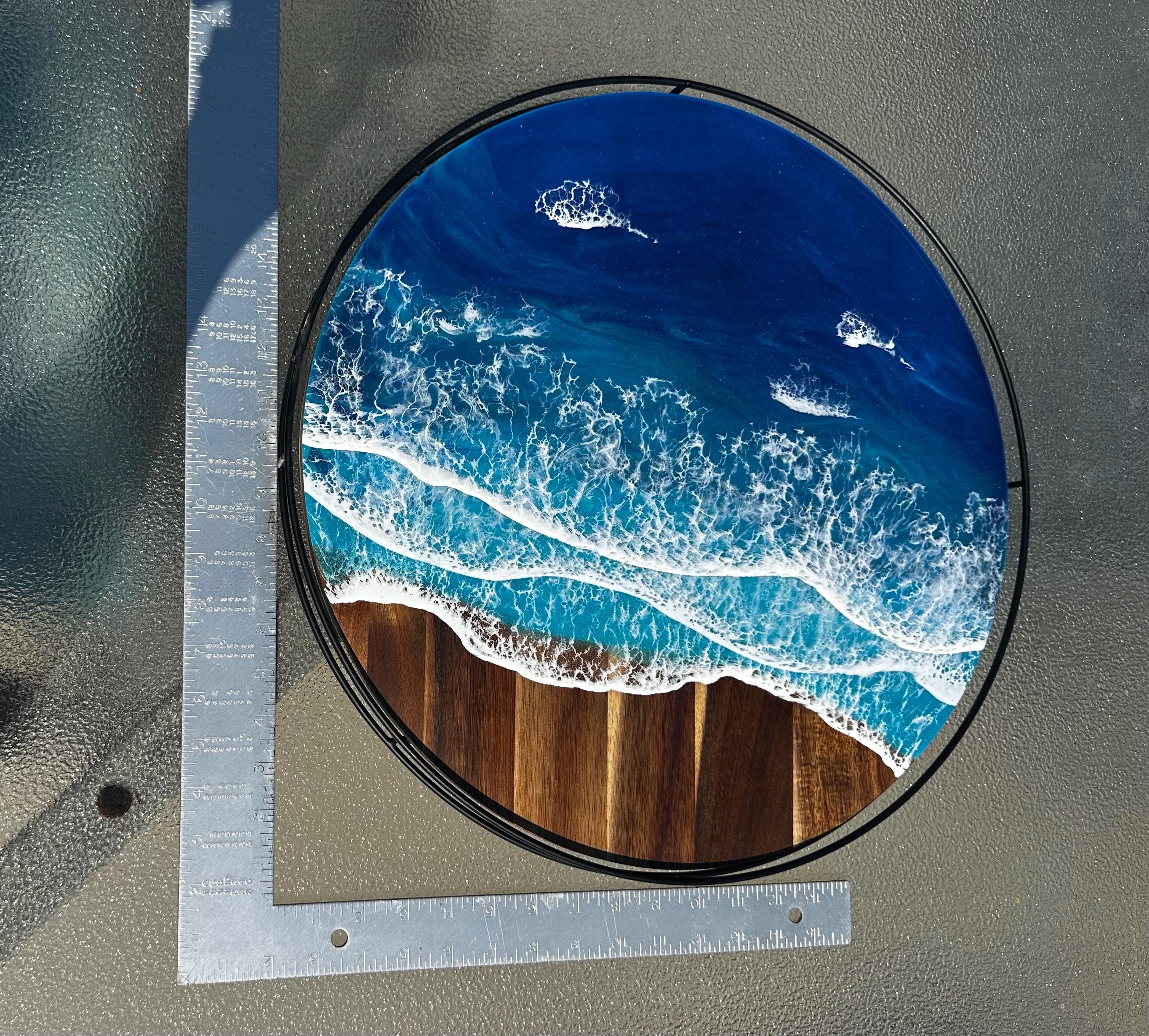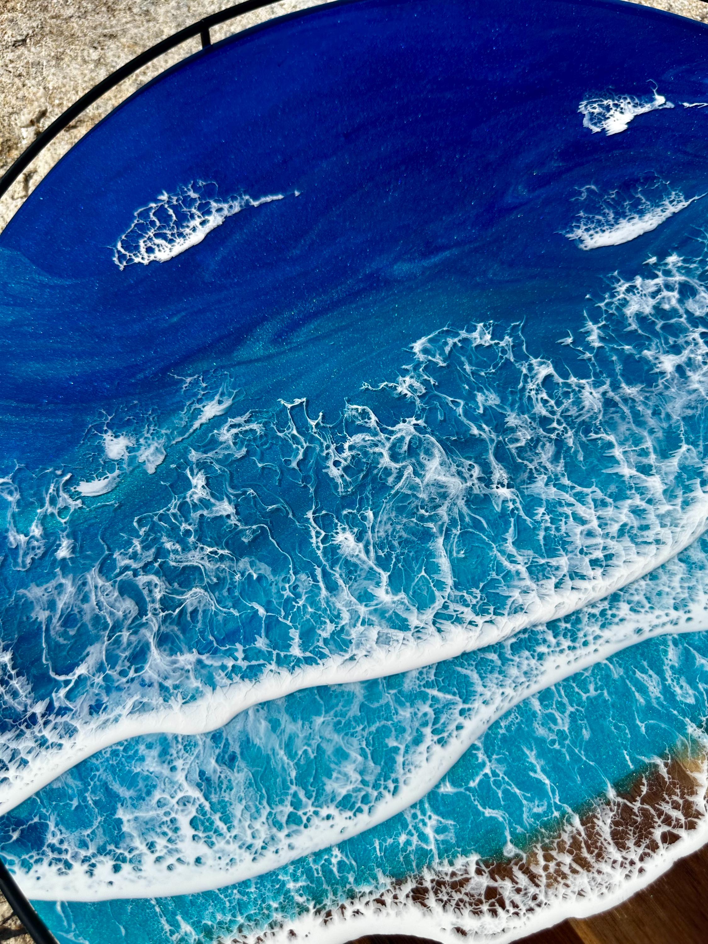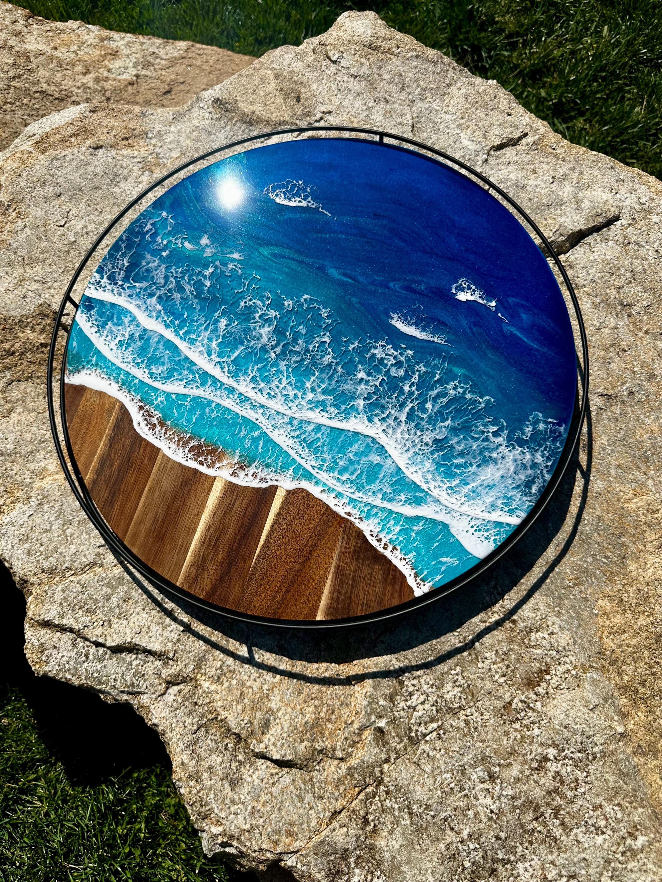 Original functional art. This is a 18" lazy Susan with ocean waves poured with resin. This adds a coastal vibe to any home.