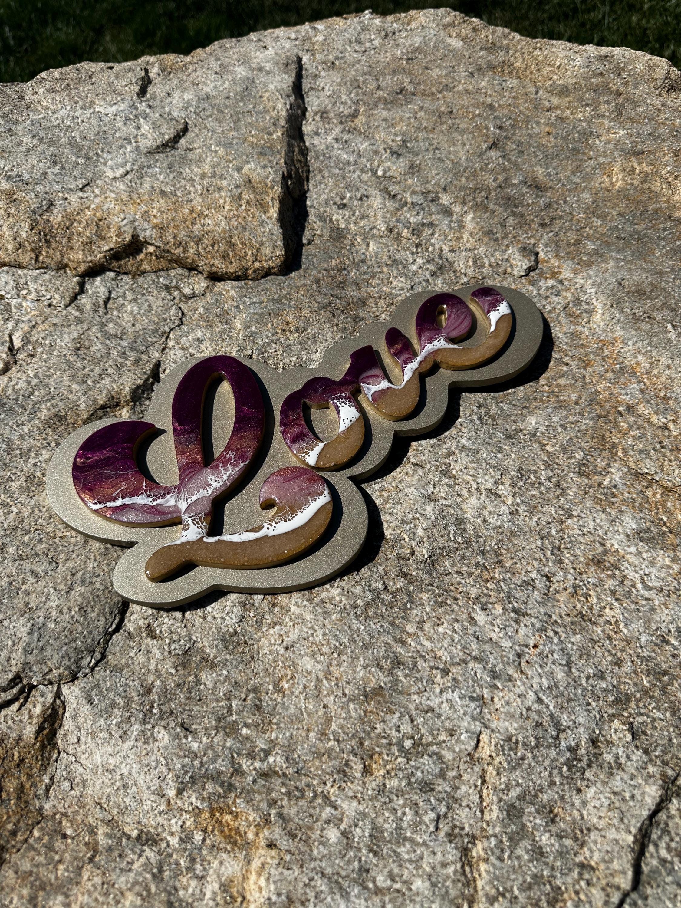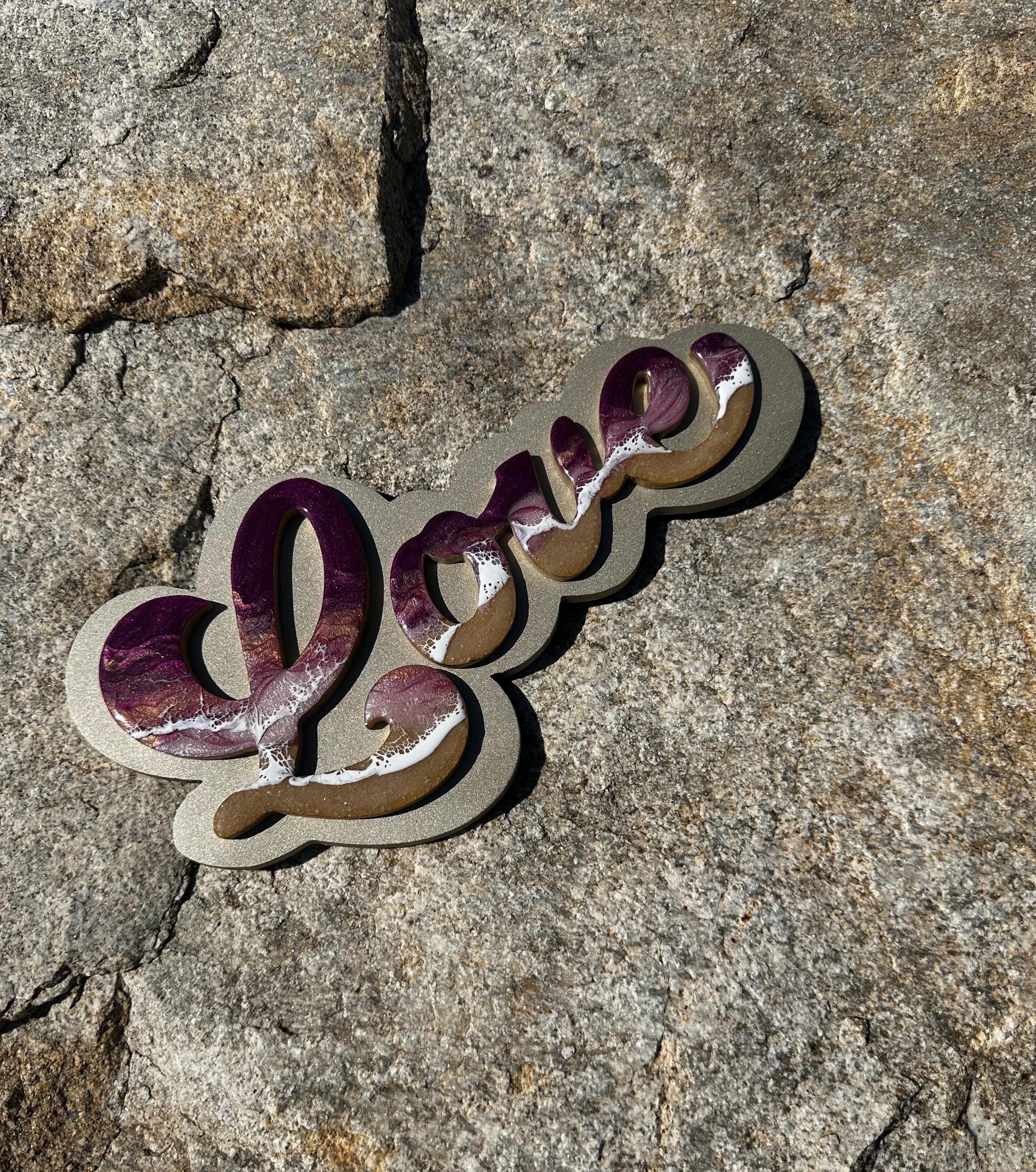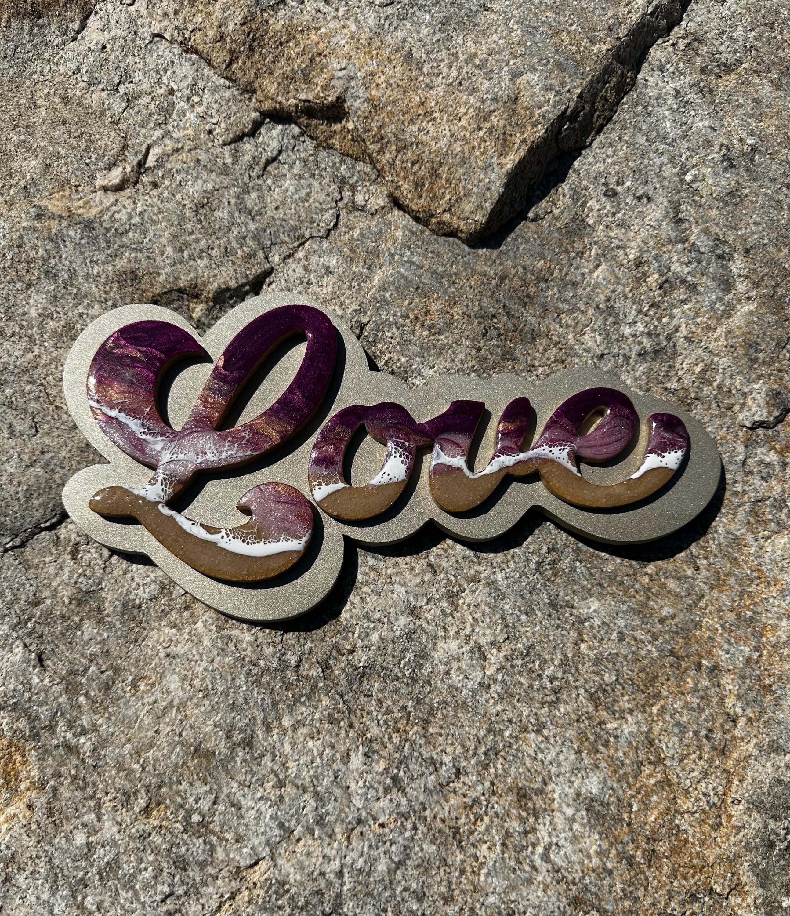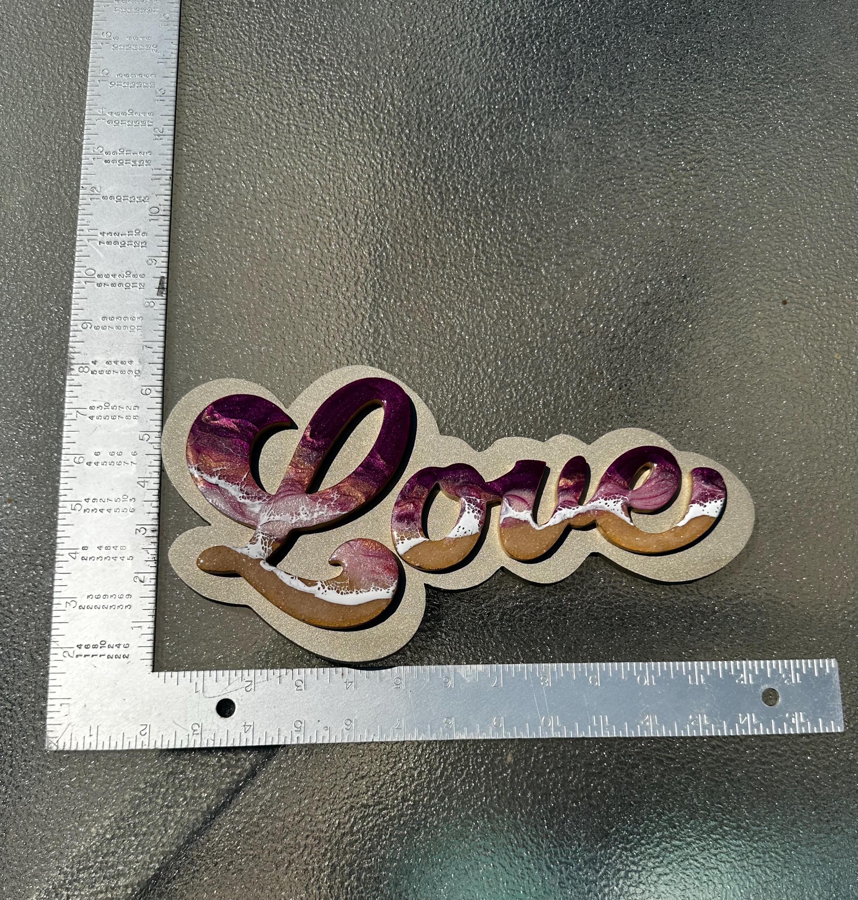 This is a wood cut out with the word love on it with a resin ocean scene on top. This particular design has colors of deep burgundy, champagne pink, and mauve pink with a frothy wave poured on real tan sparkly sand. The words love are backed with a champagne gold backer.