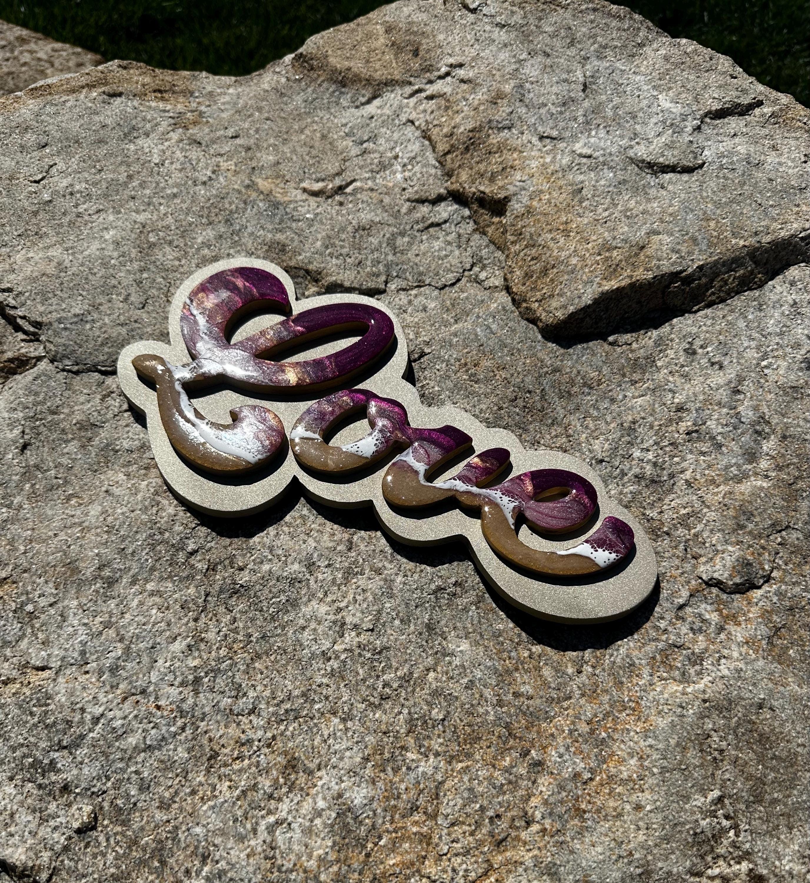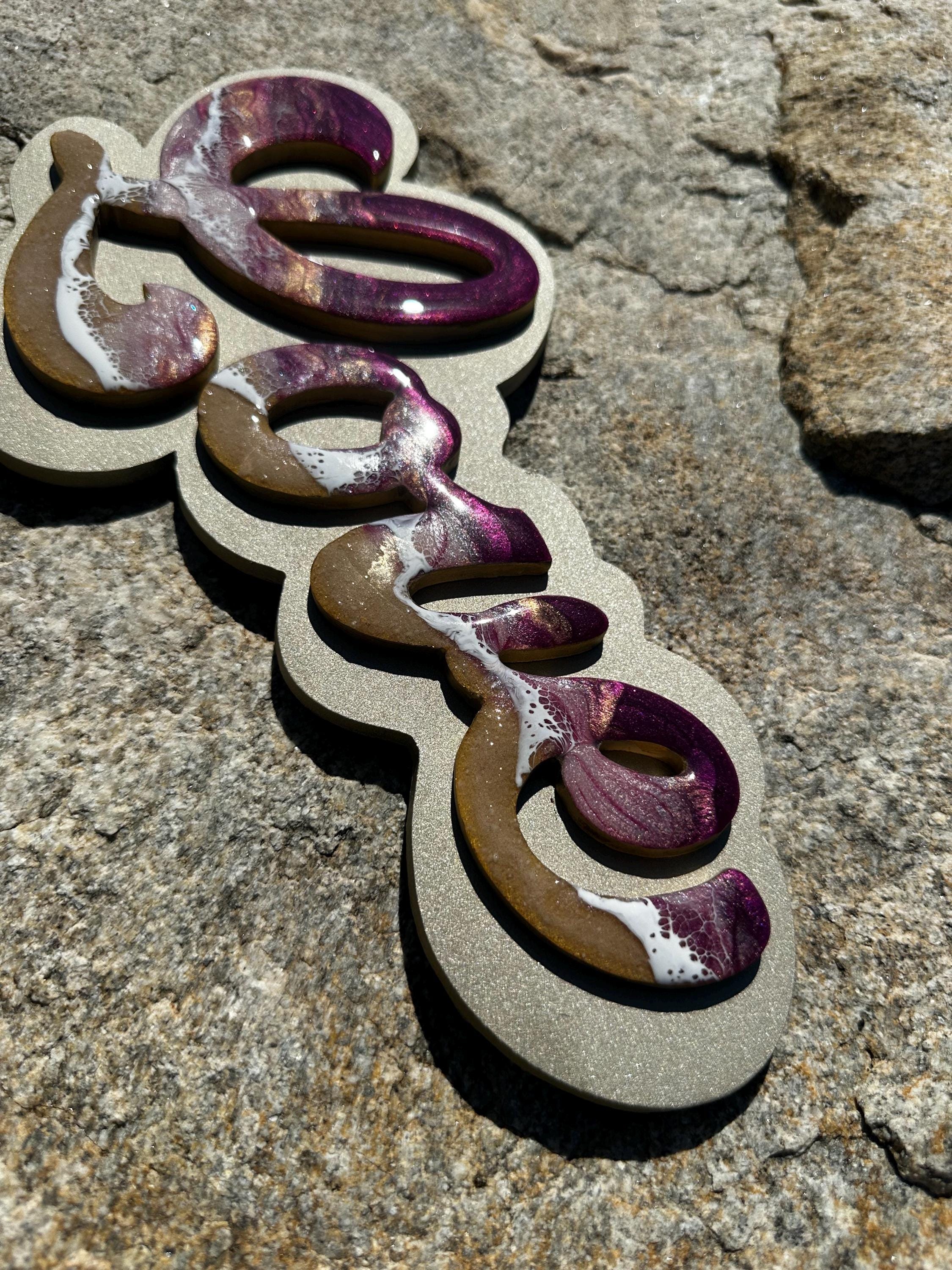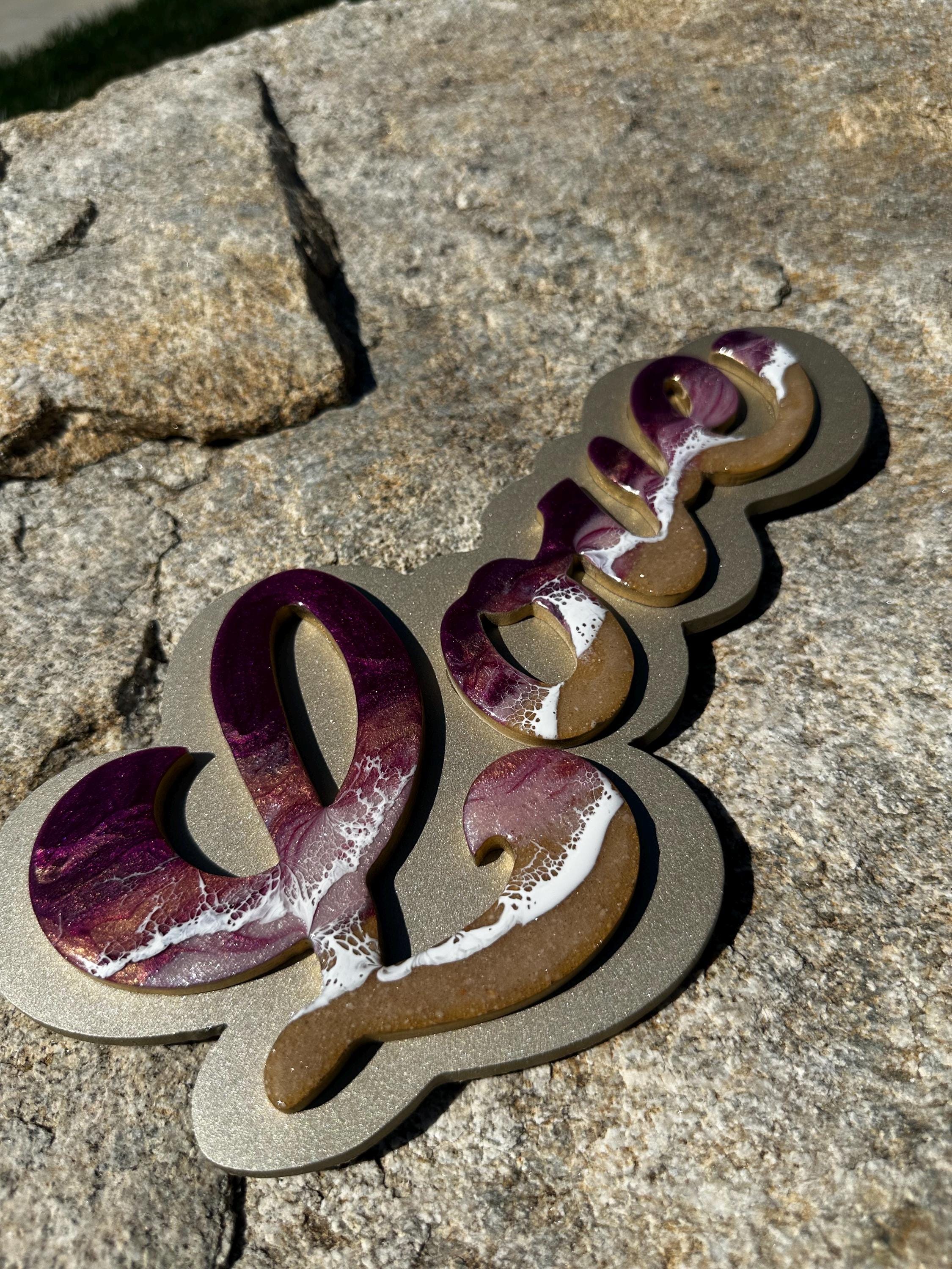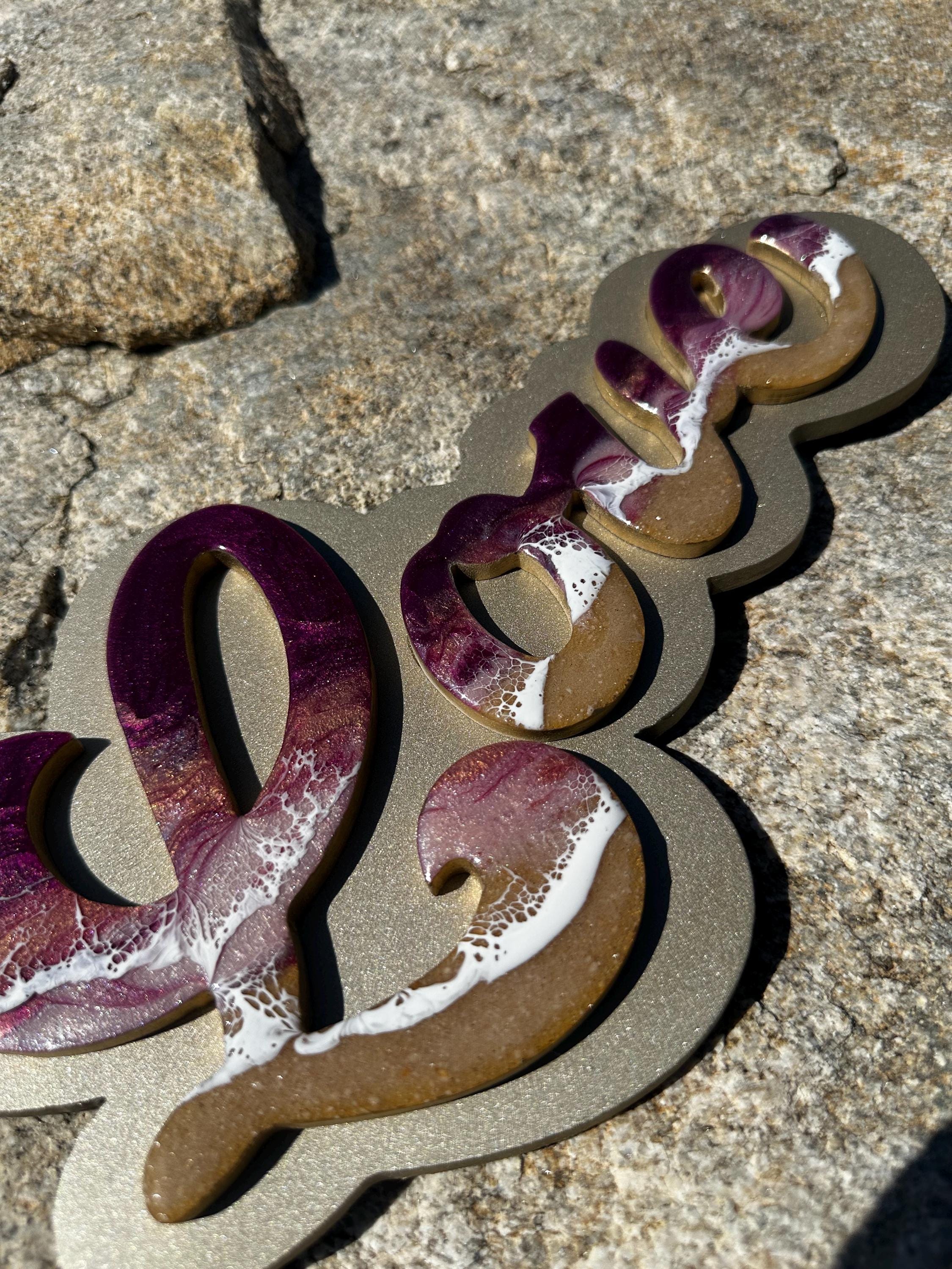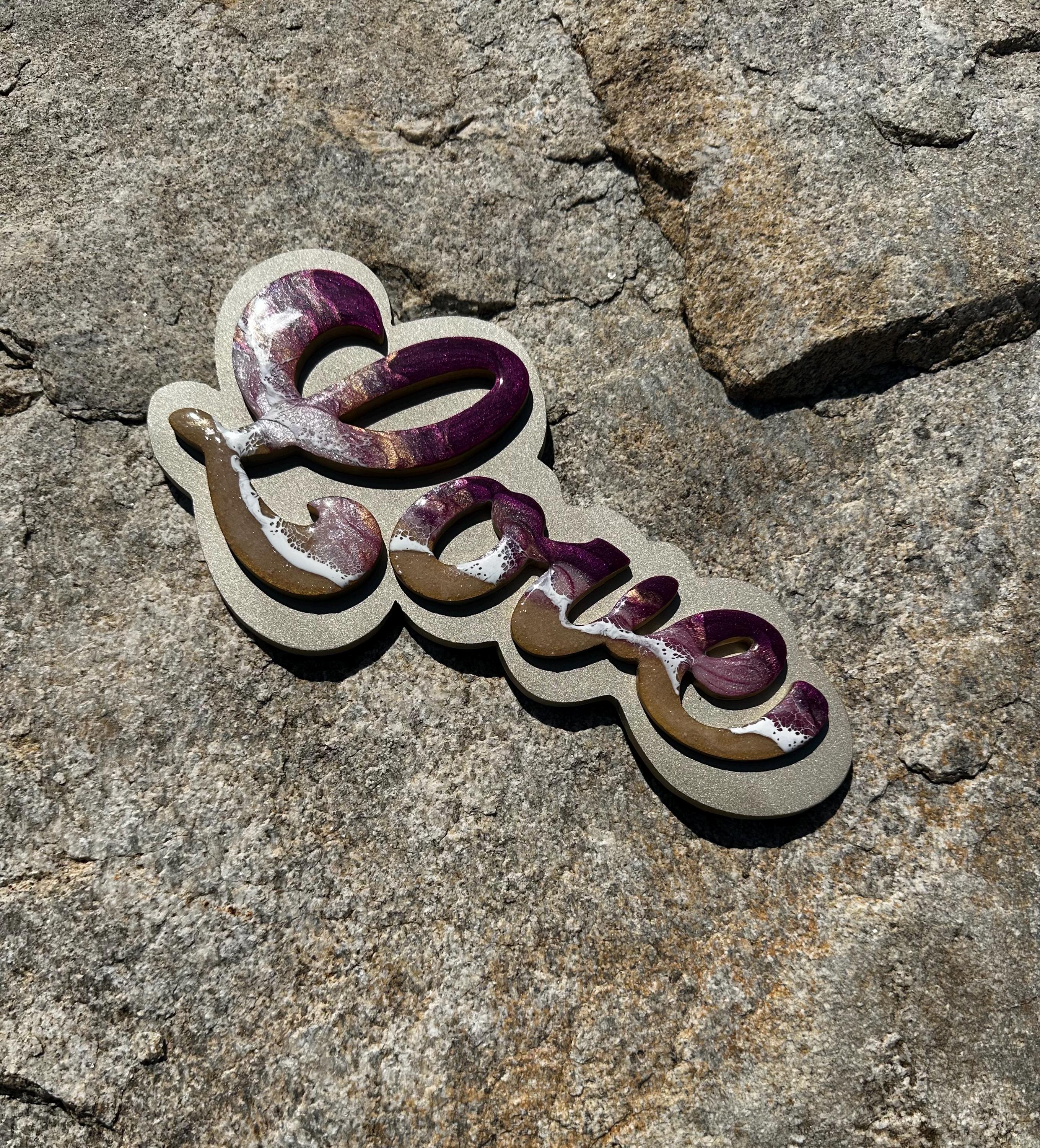 This is a wood cut out with the word love on it with a resin ocean scene on top. This particular design has colors of deep burgundy, champagne pink, and mauve pink with a frothy wave poured on real tan sparkly sand. The words love are backed with a champagne gold backer.