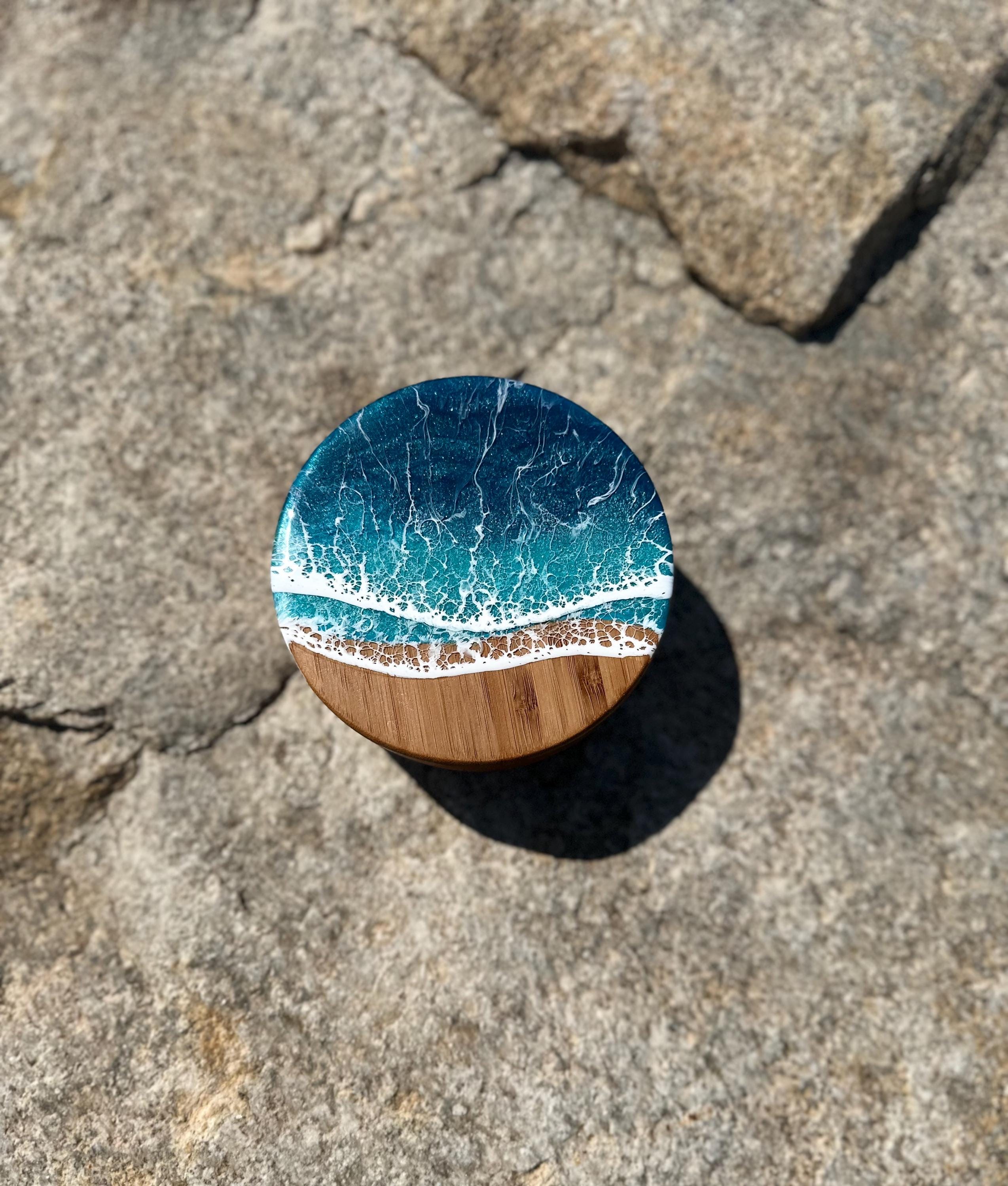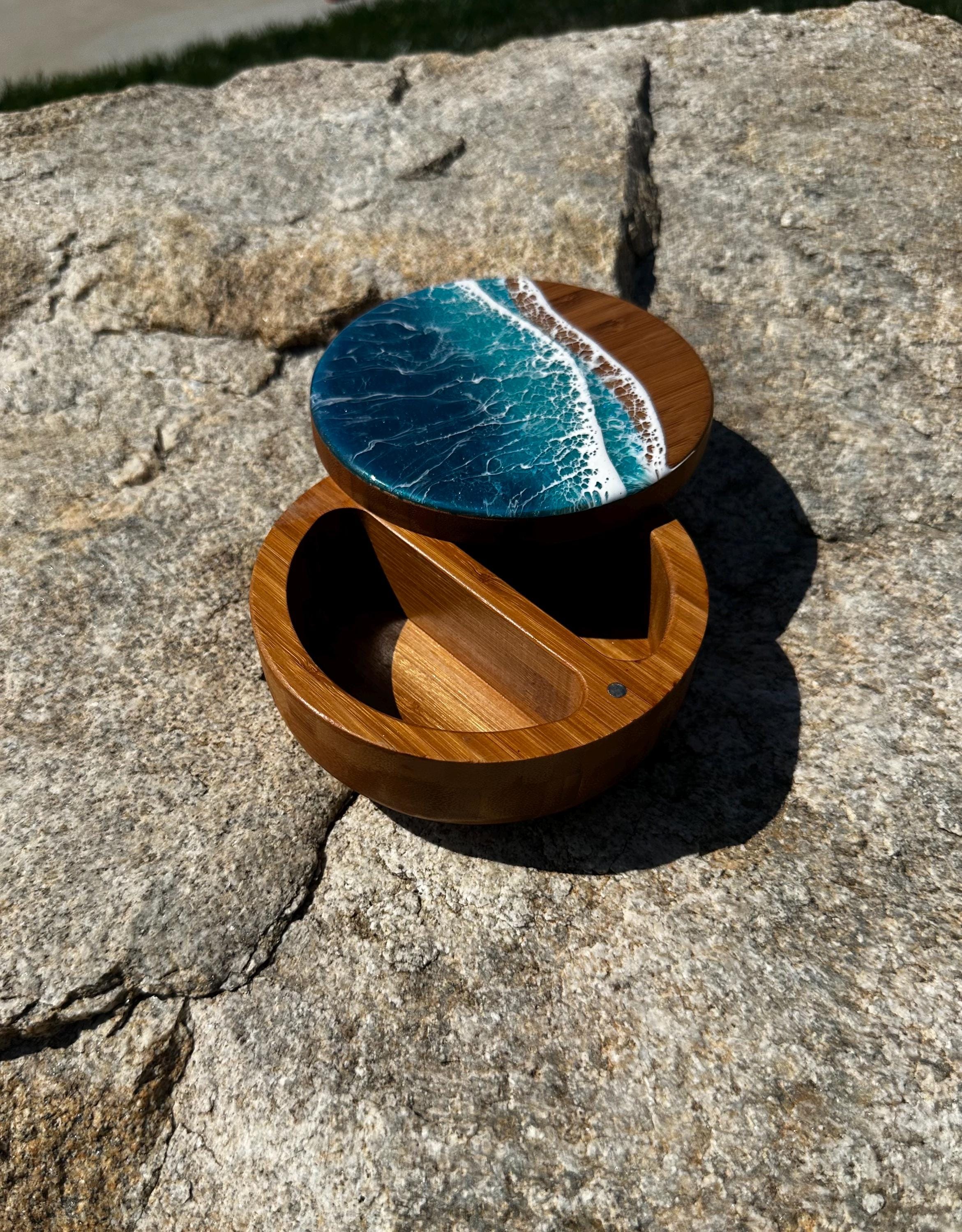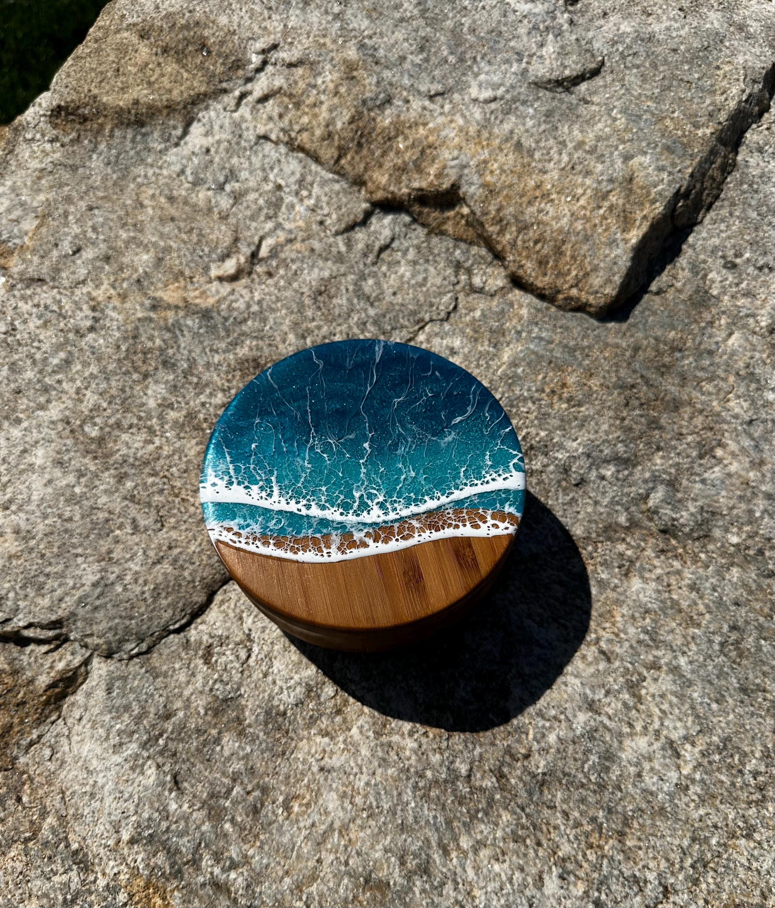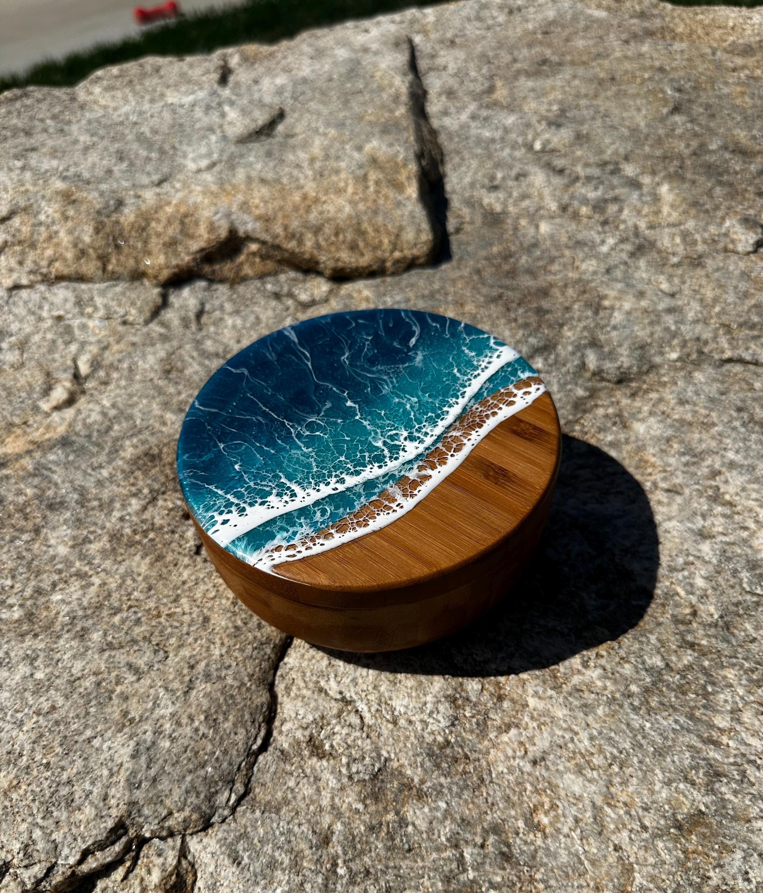 Bamboo wood canister/ box with ocean resin art poured on top.