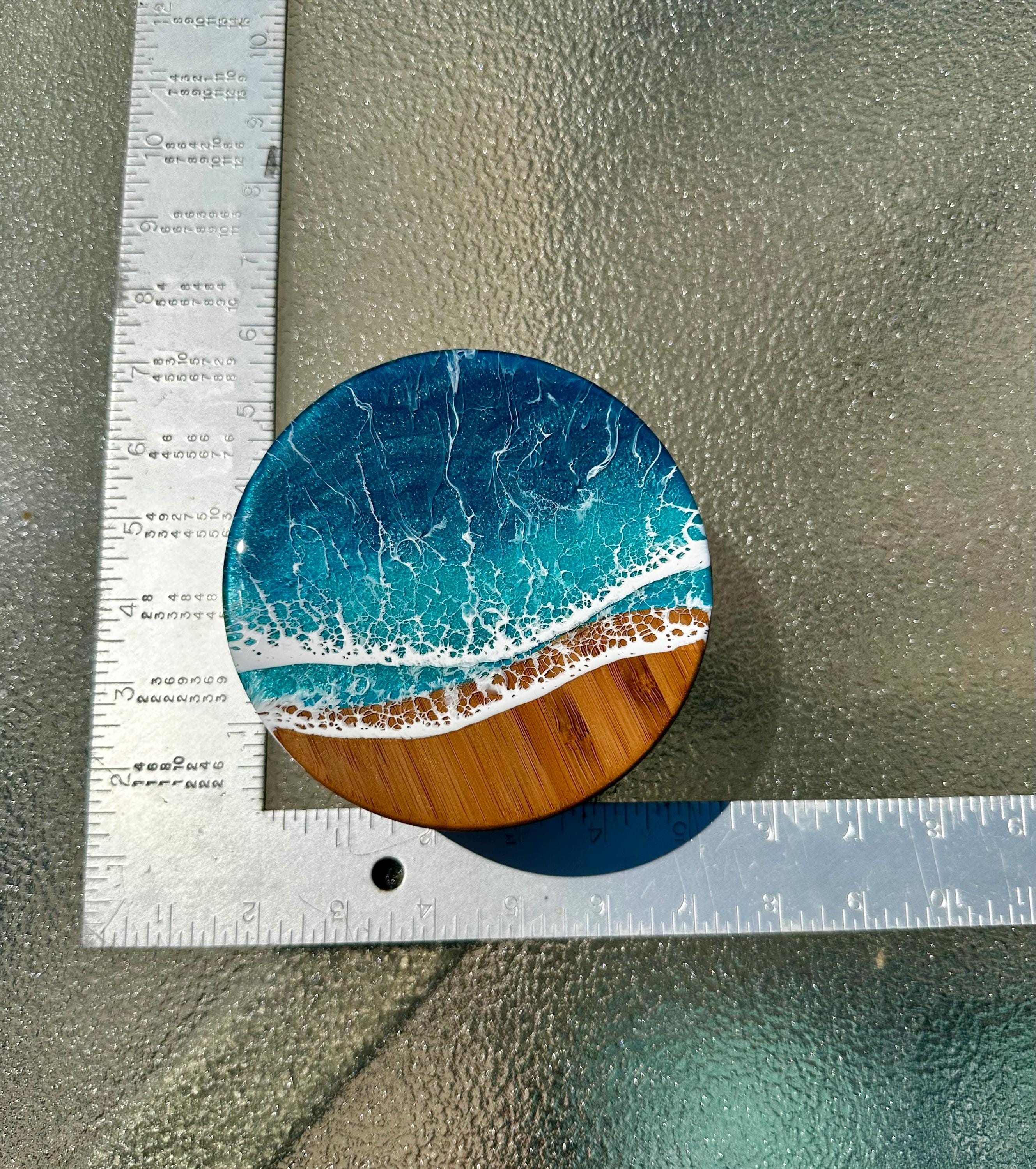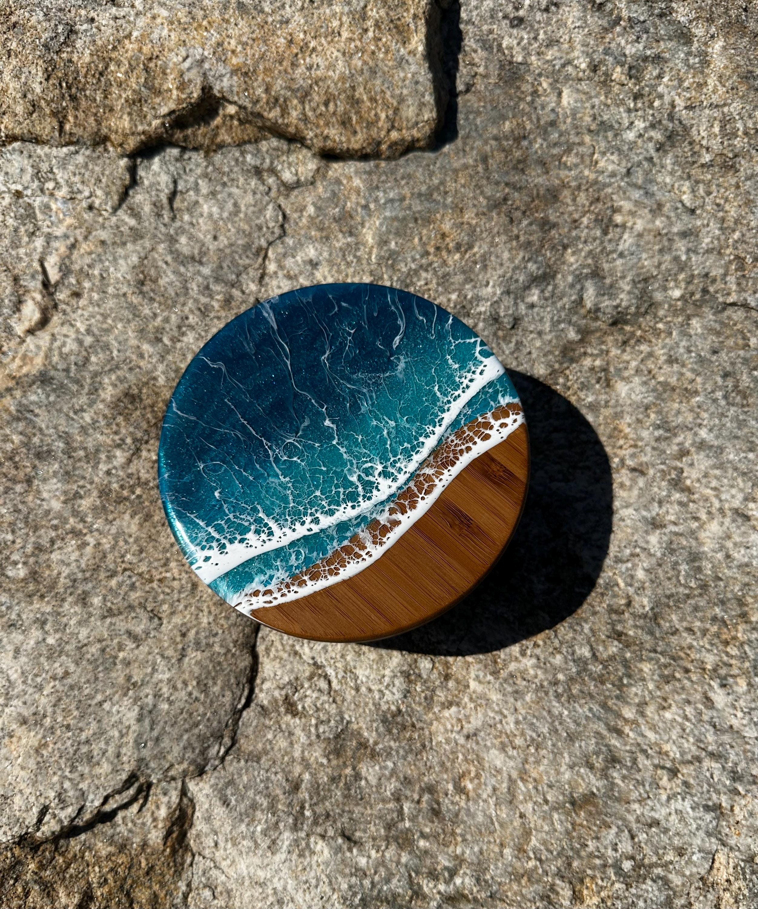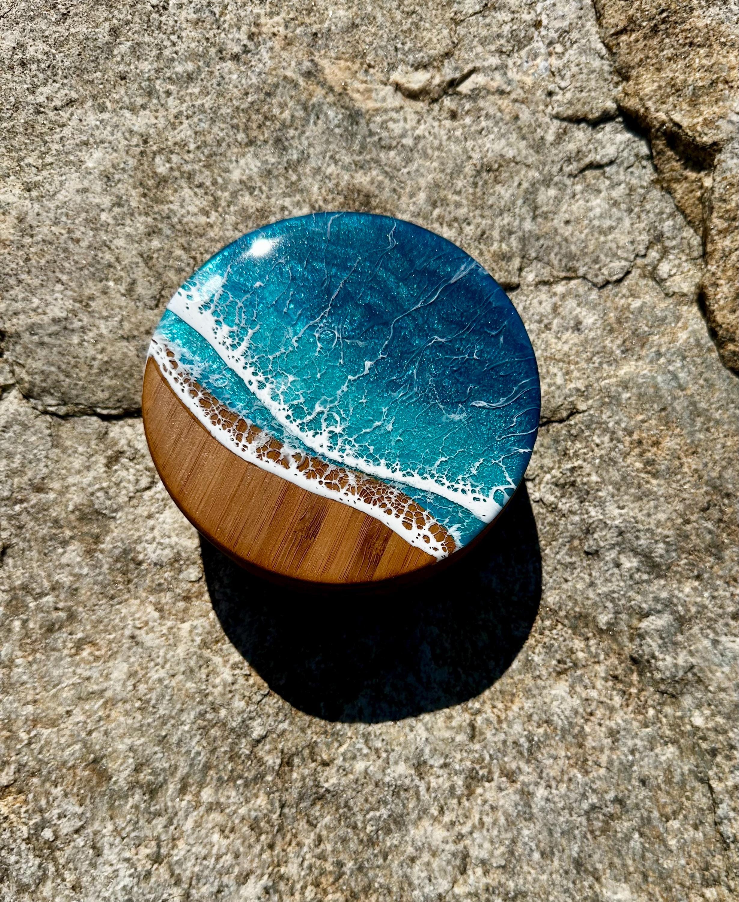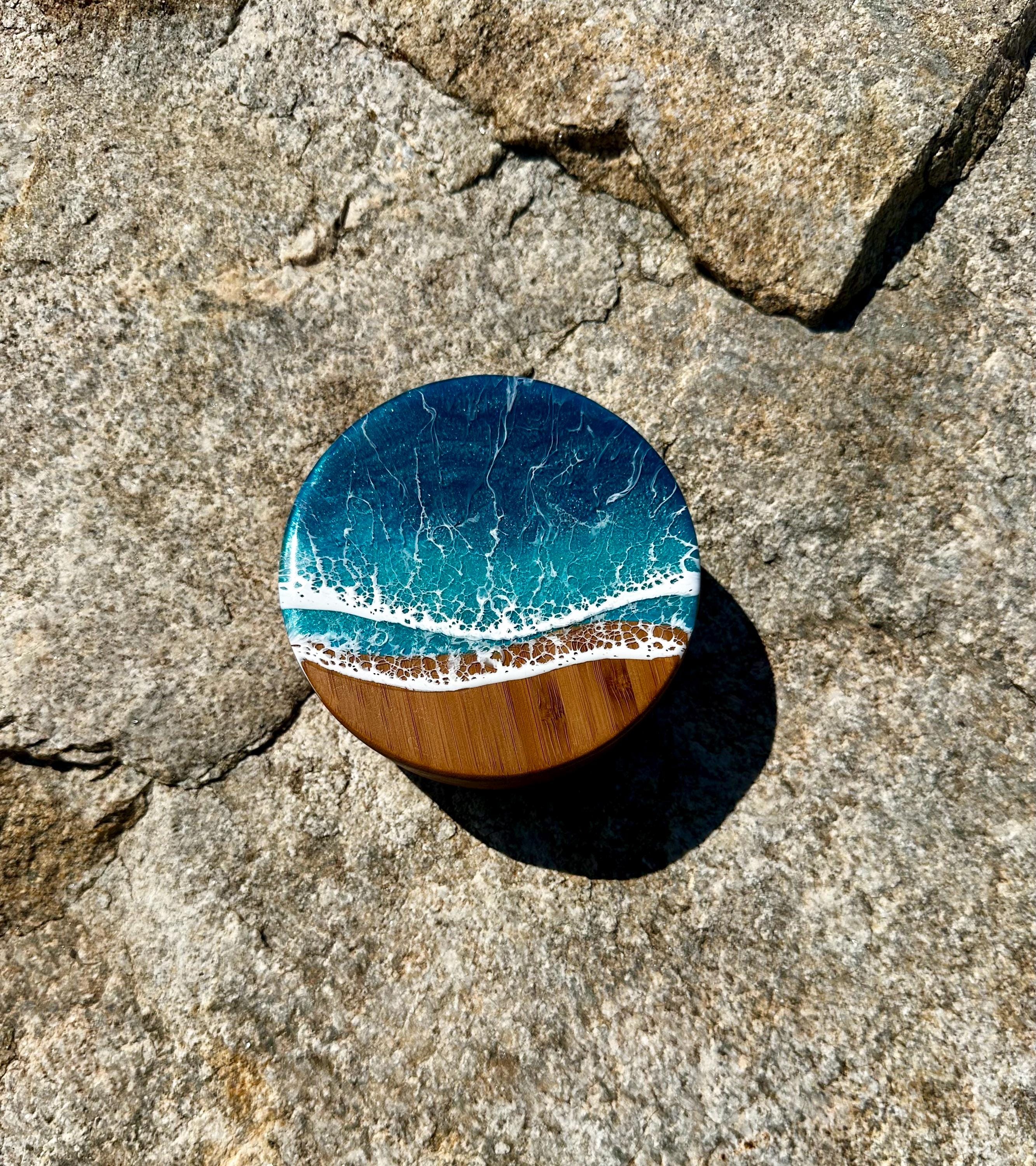 Bamboo wood canister/ box with ocean resin art poured on top.