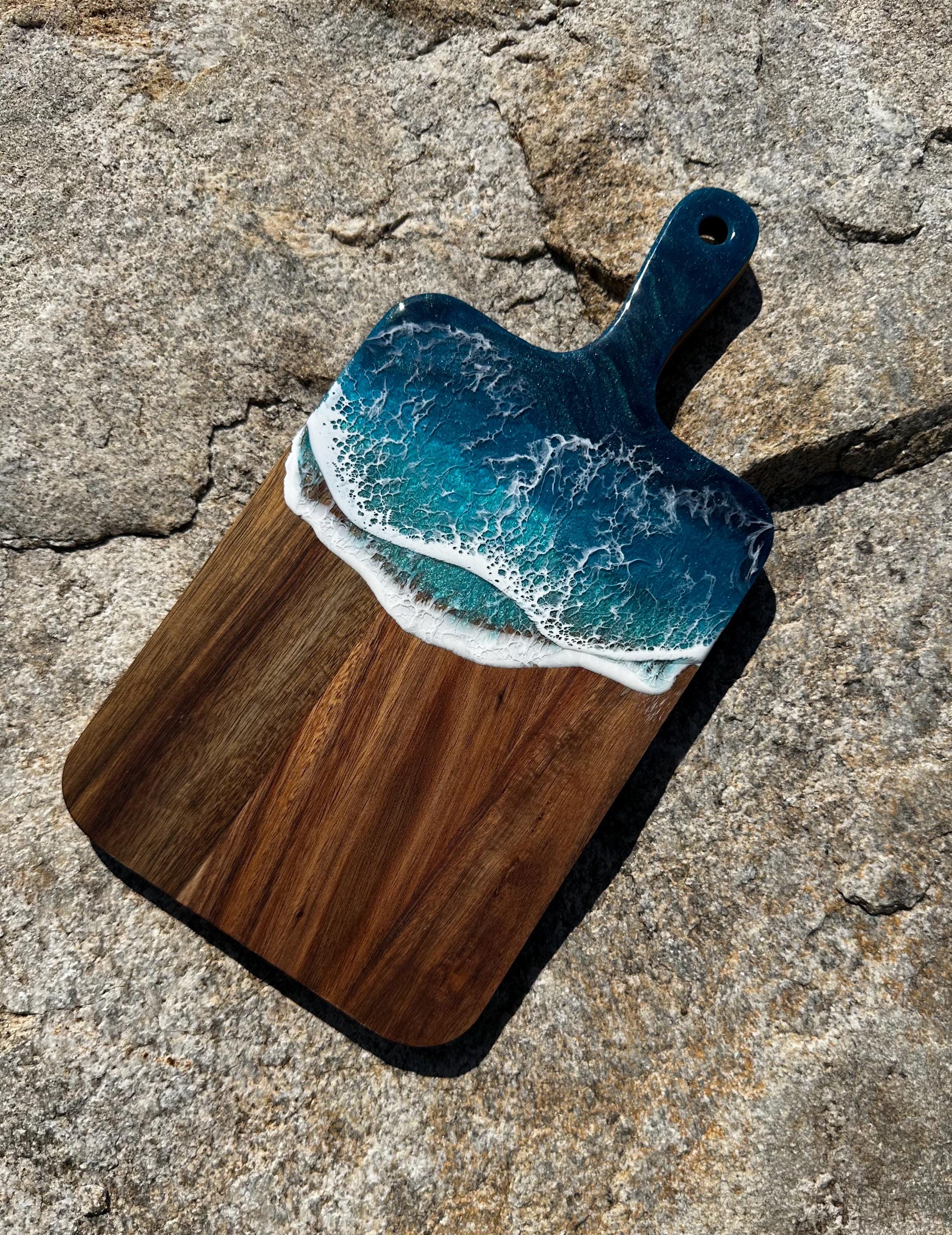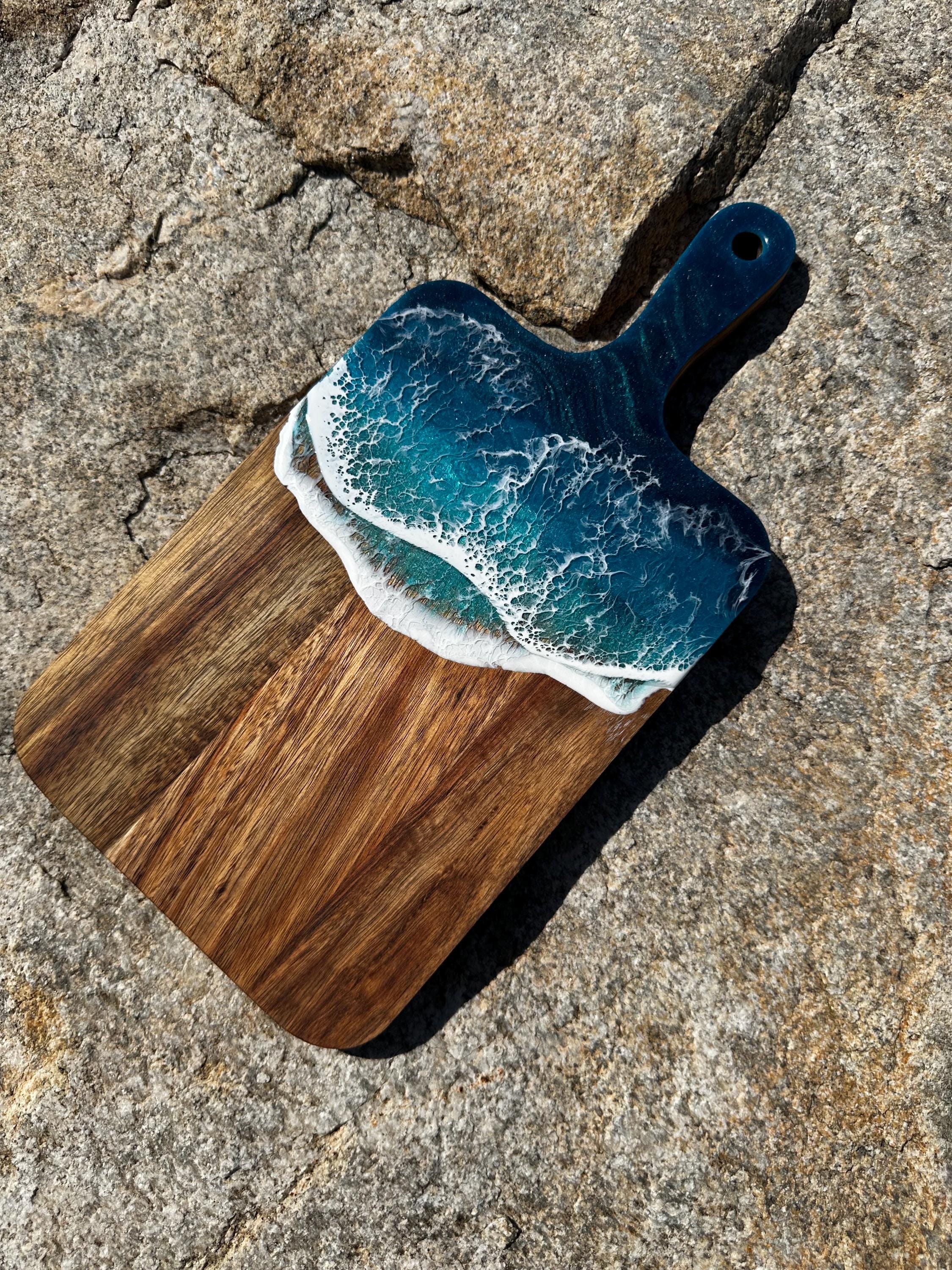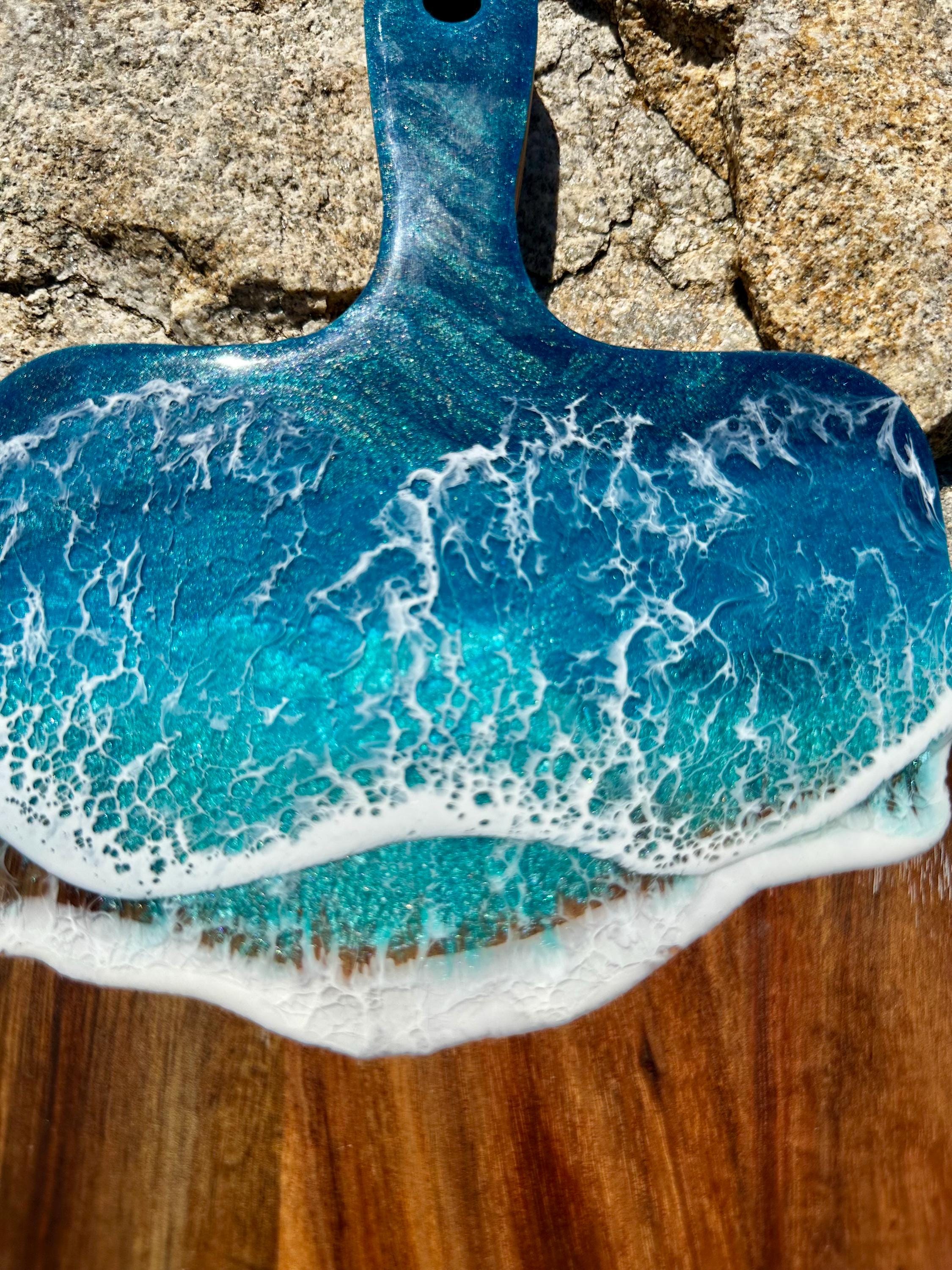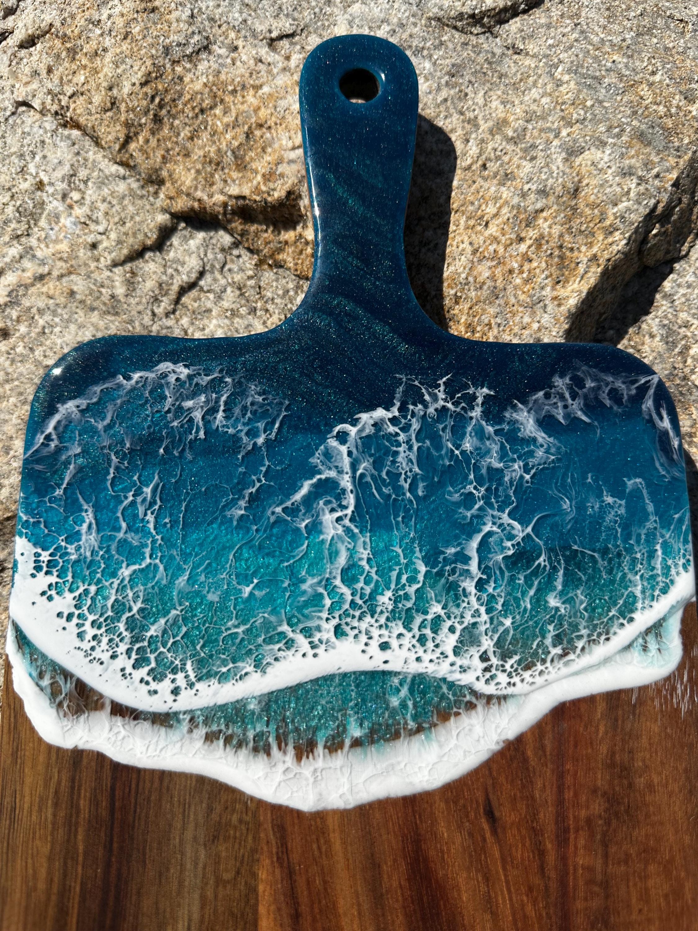 Resin serving board poured on wood. Perfect for charcuterie boards, cheese board, or simply a cutting board. Leave these beautiful boards out on your counter for decoration and it will also be easily accessible for a quick cheese platter or charcuterie board. Ocean waves are realistic and so beautiful in colors of deep dark turquoise, teal blue, and teal green with white crisp ocean waves.