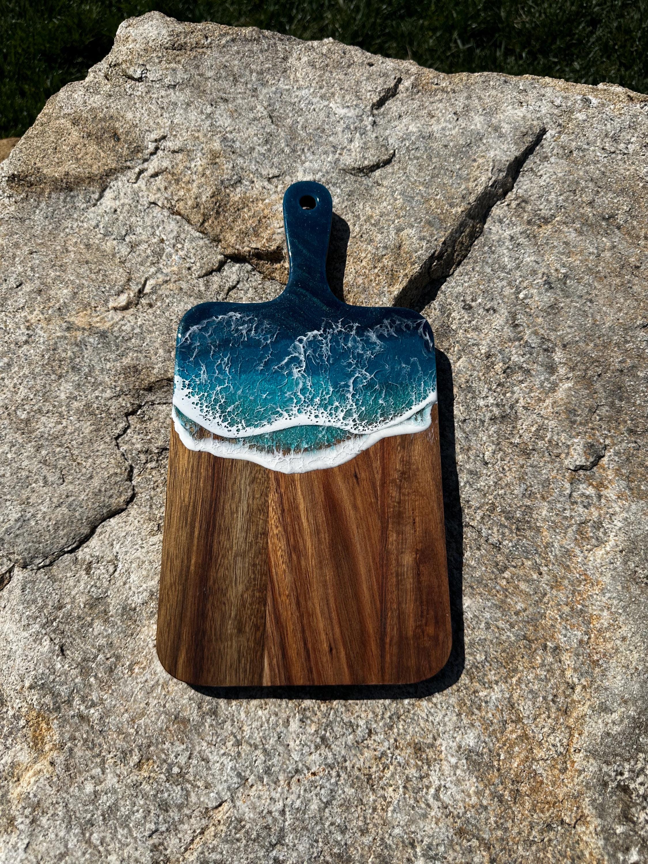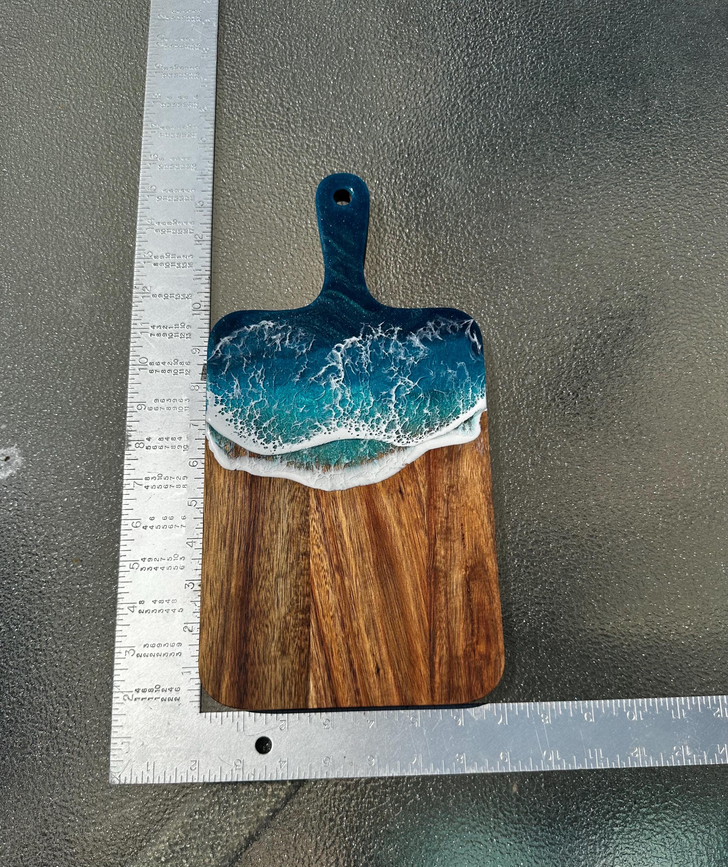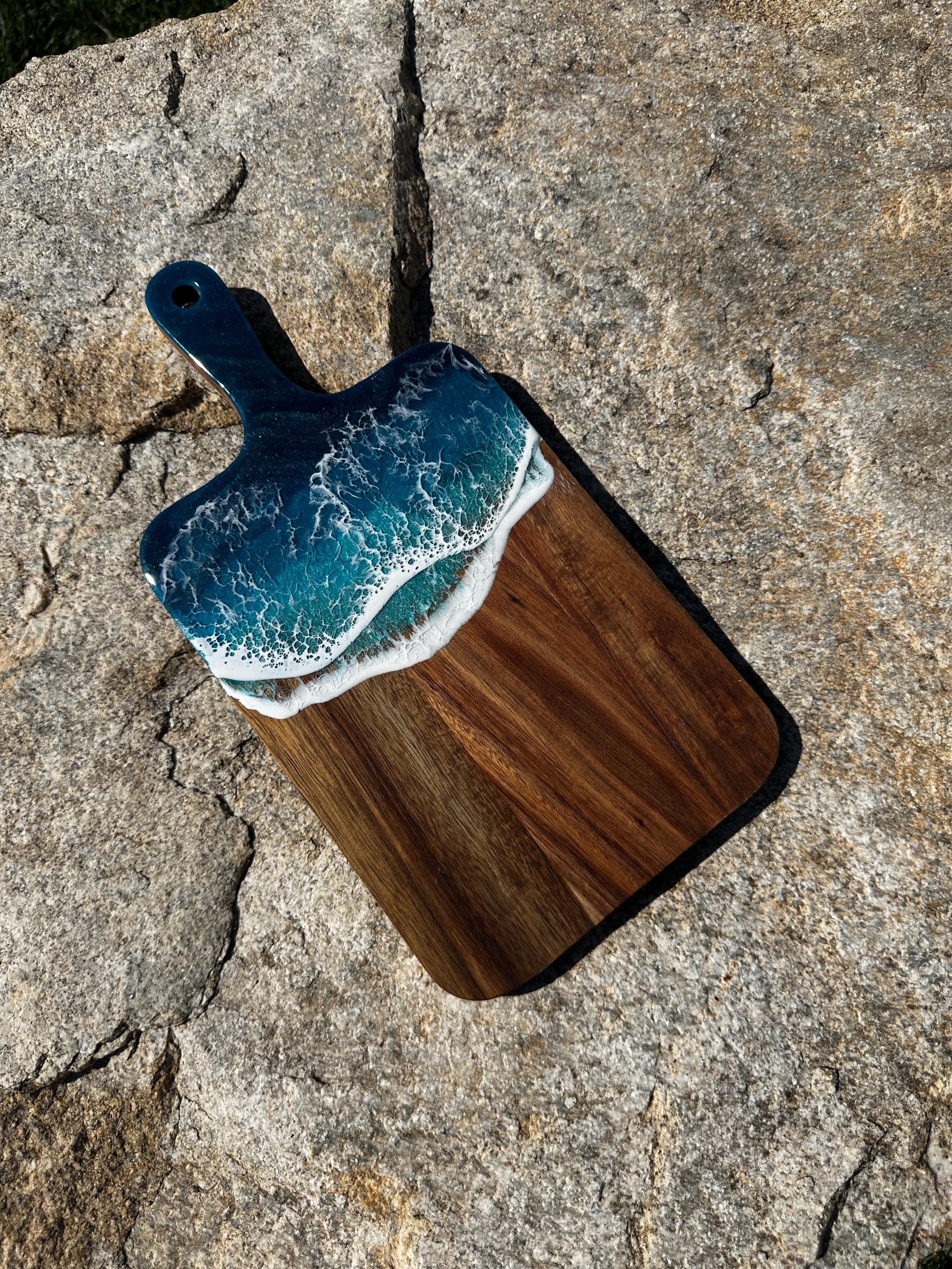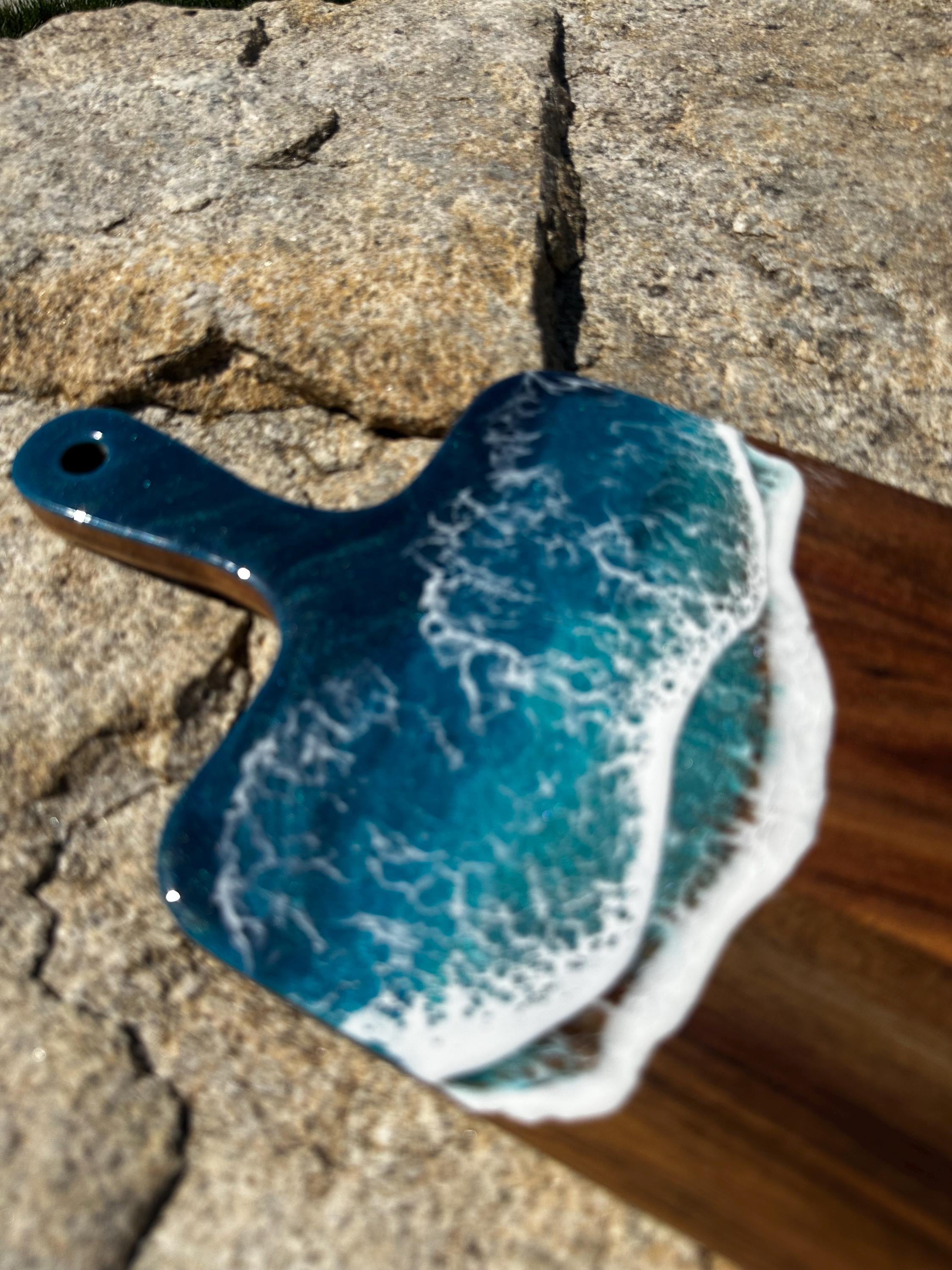 Resin serving board poured on wood. Perfect for charcuterie boards, cheese board, or simply a cutting board. Leave these beautiful boards out on your counter for decoration and it will also be easily accessible for a quick cheese platter or charcuterie board. Ocean waves are realistic and so beautiful in colors of deep dark turquoise, teal blue, and teal green with white crisp ocean waves.
