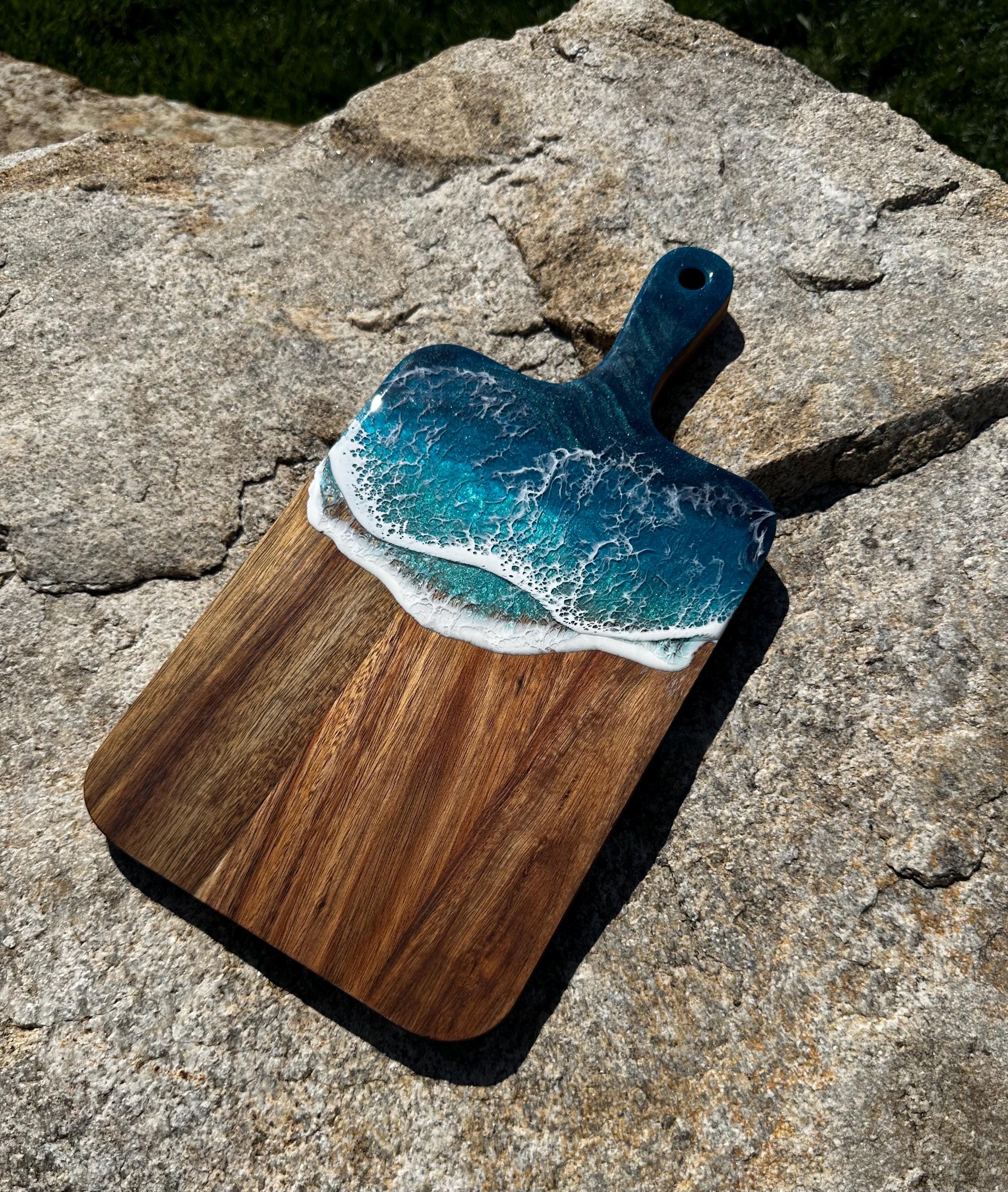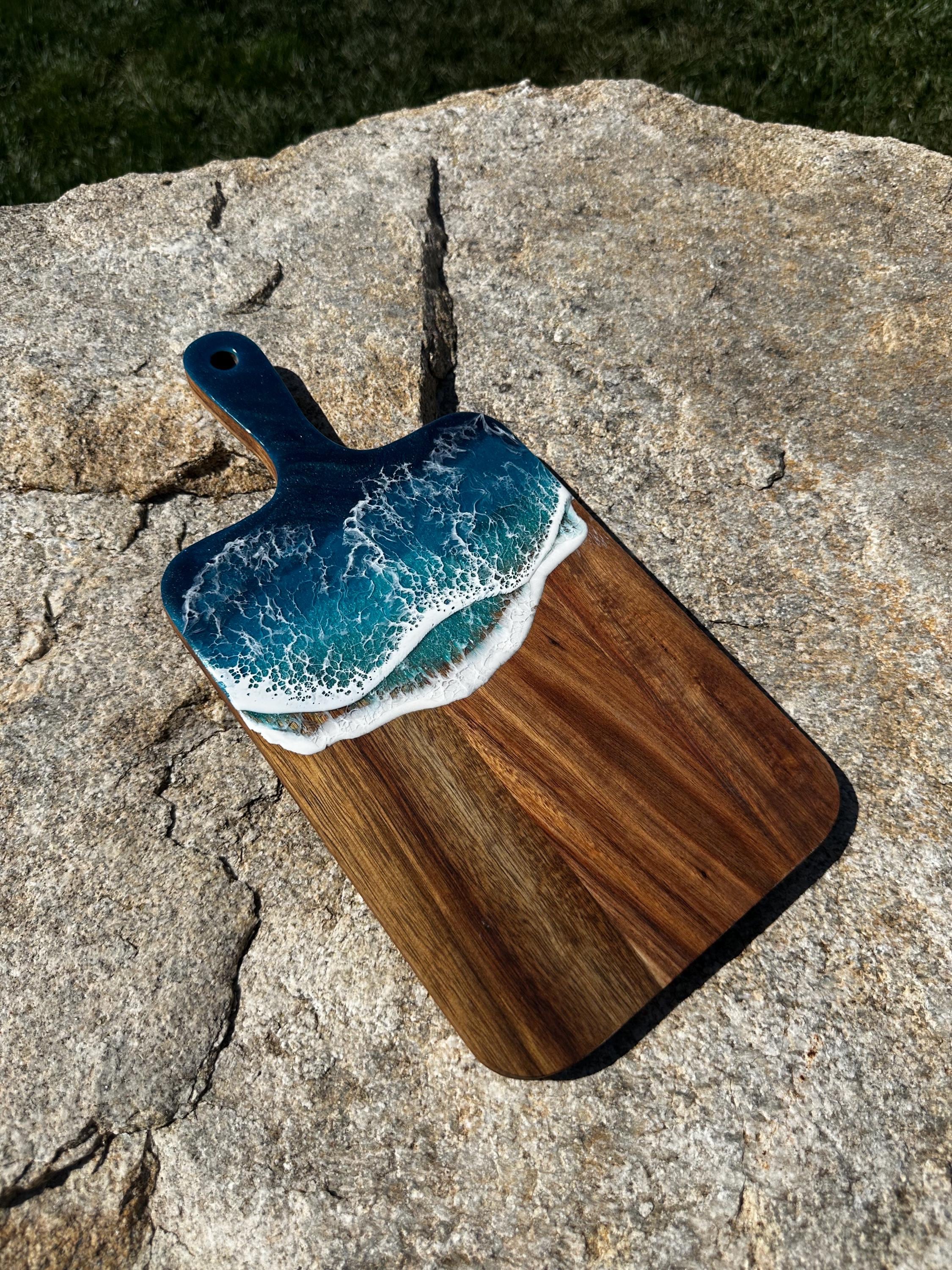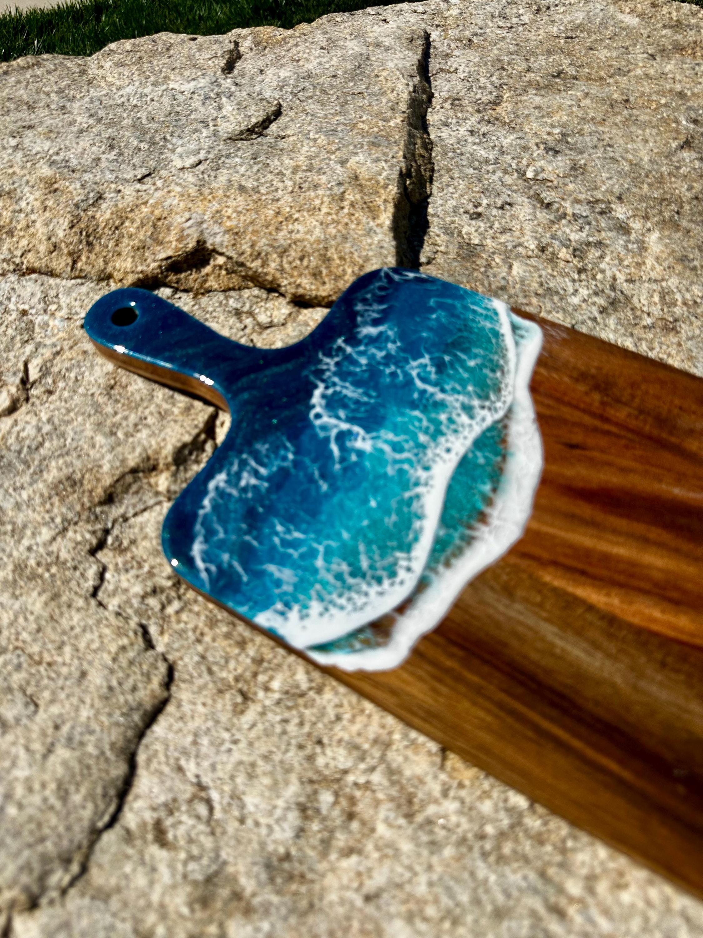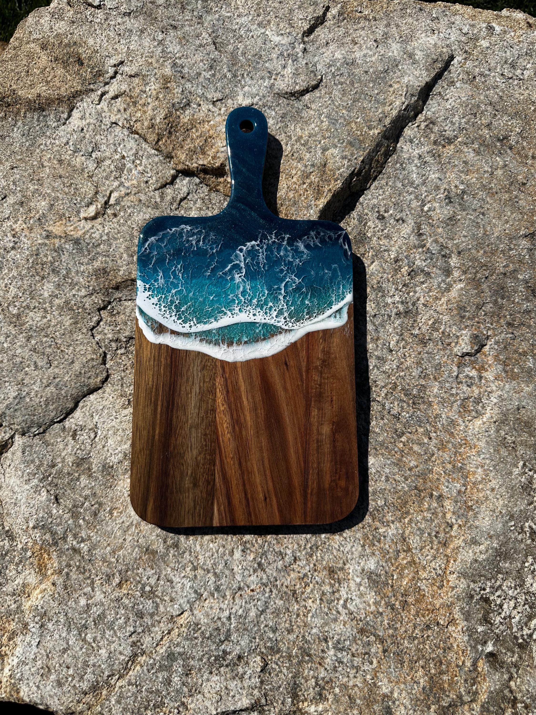 Resin serving board poured on wood. Perfect for charcuterie boards, cheese board, or simply a cutting board. Leave these beautiful boards out on your counter for decoration and it will also be easily accessible for a quick cheese platter or charcuterie board. Ocean waves are realistic and so beautiful in colors of deep dark turquoise, teal blue, and teal green with white crisp ocean waves.