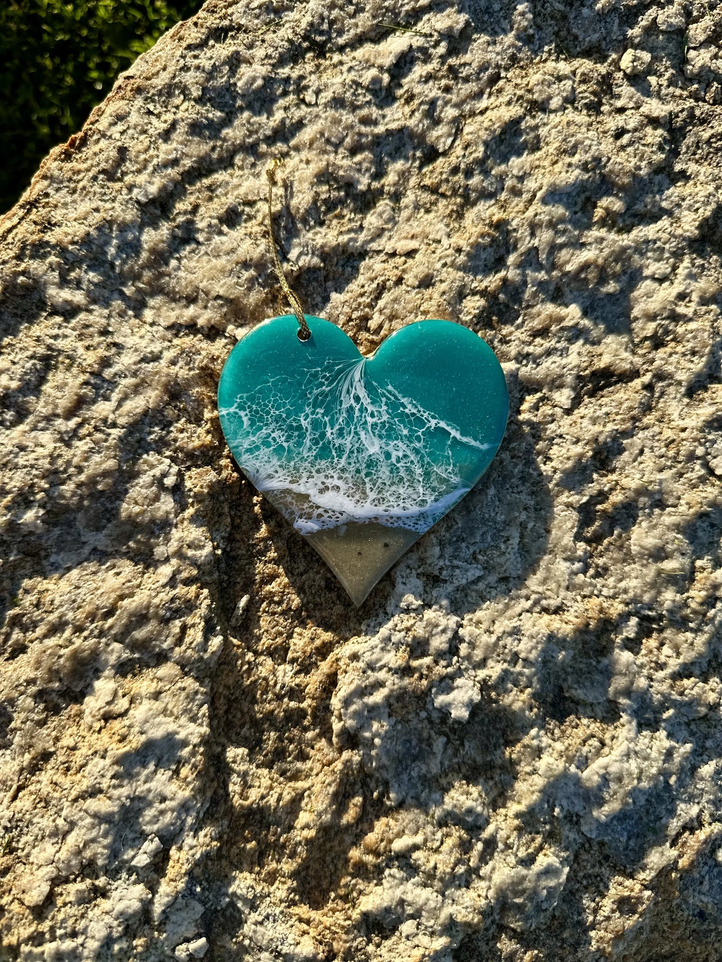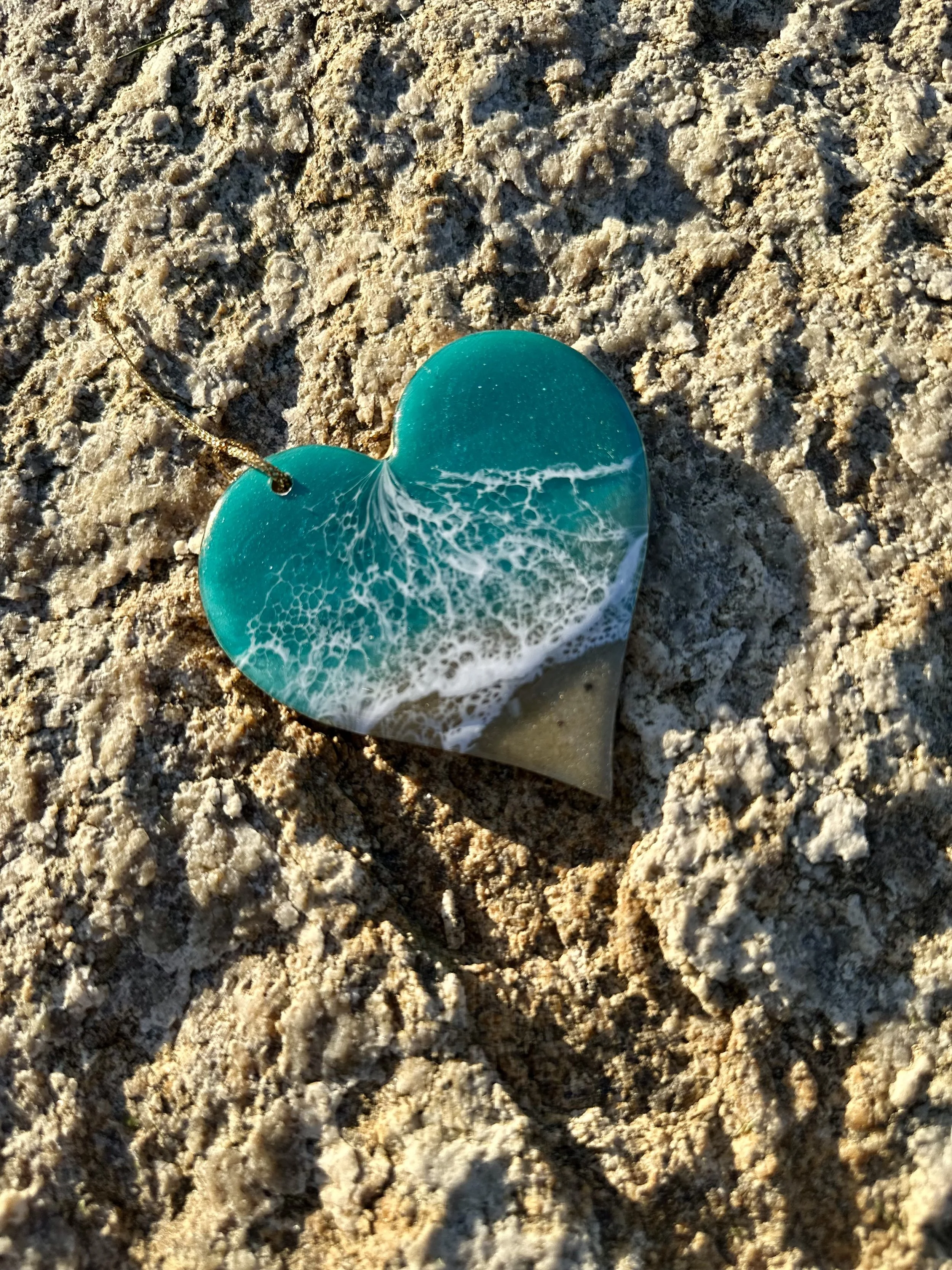 This is a wood whale that has resin poured on it to create a little ocean beach scene. The colors of the ocean are greens with emerald, green, teal green, and aqua with white wispy waves throughout.