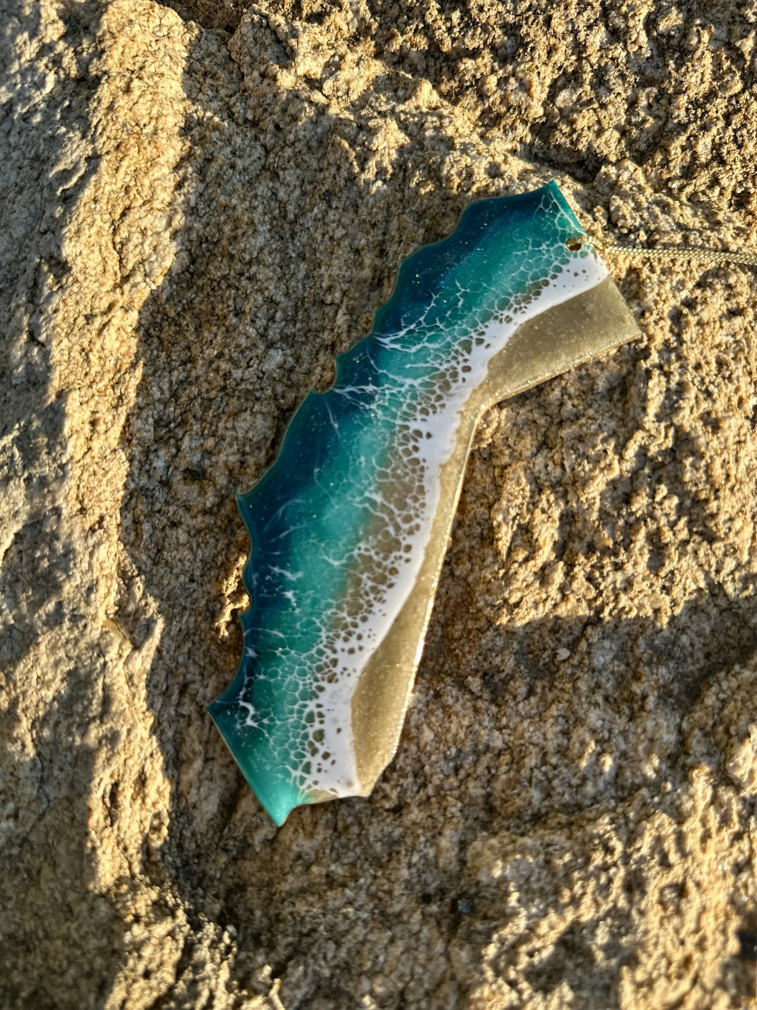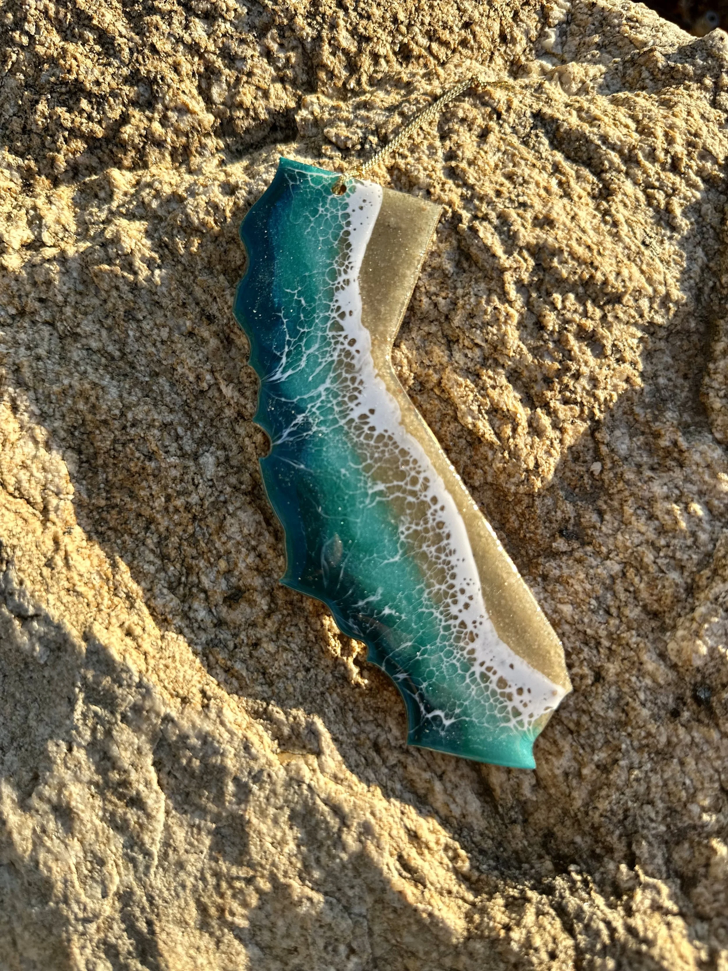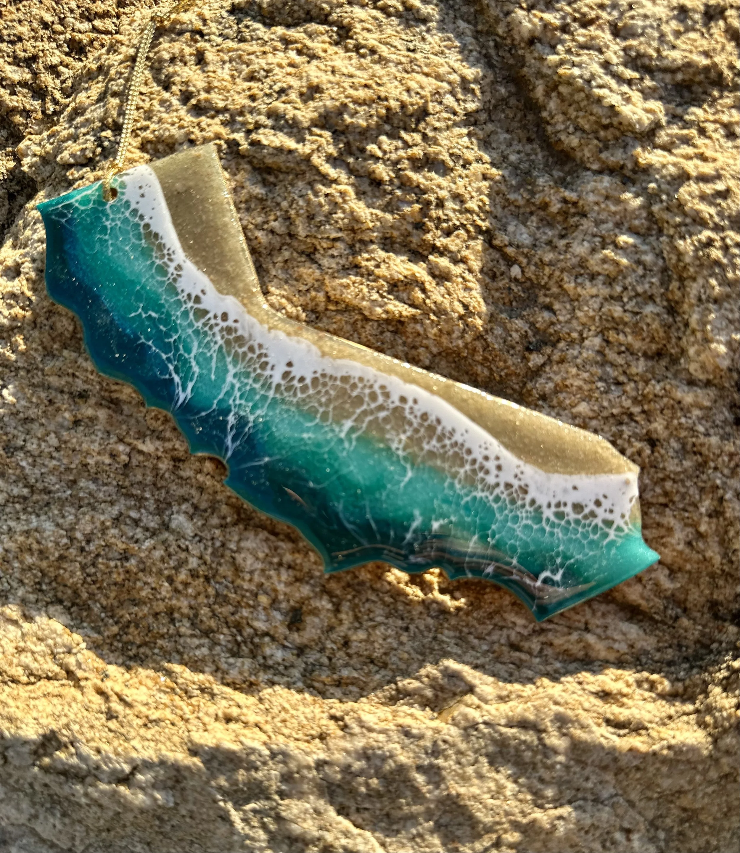 This is a wood stingray that has resin poured on it to create a little ocean beach scene. The colors of the ocean are dark blue, mid blue, and teal blue with white wispy waves throughout.