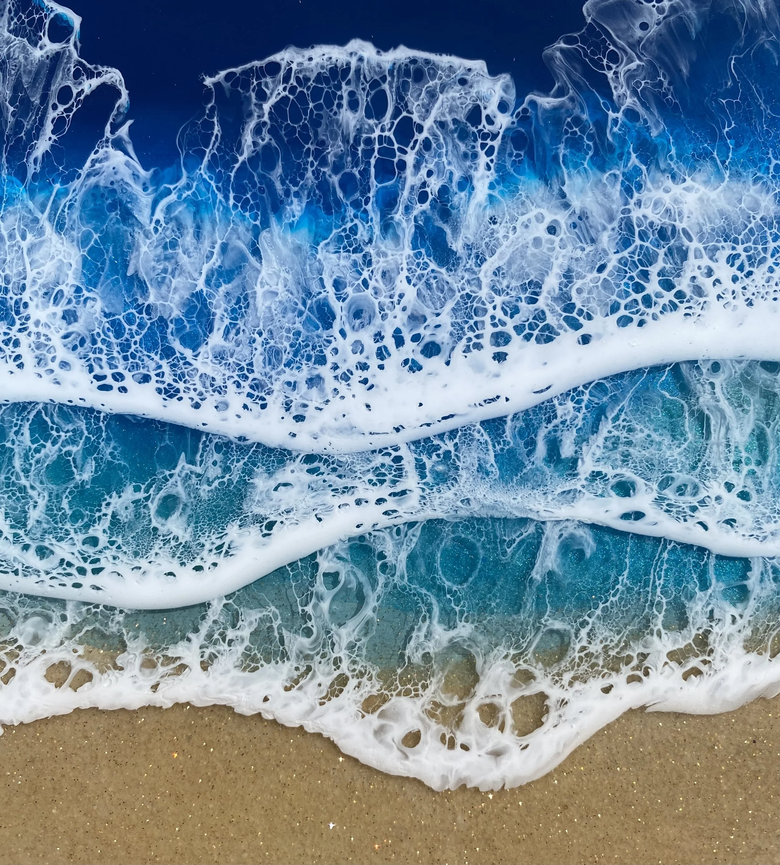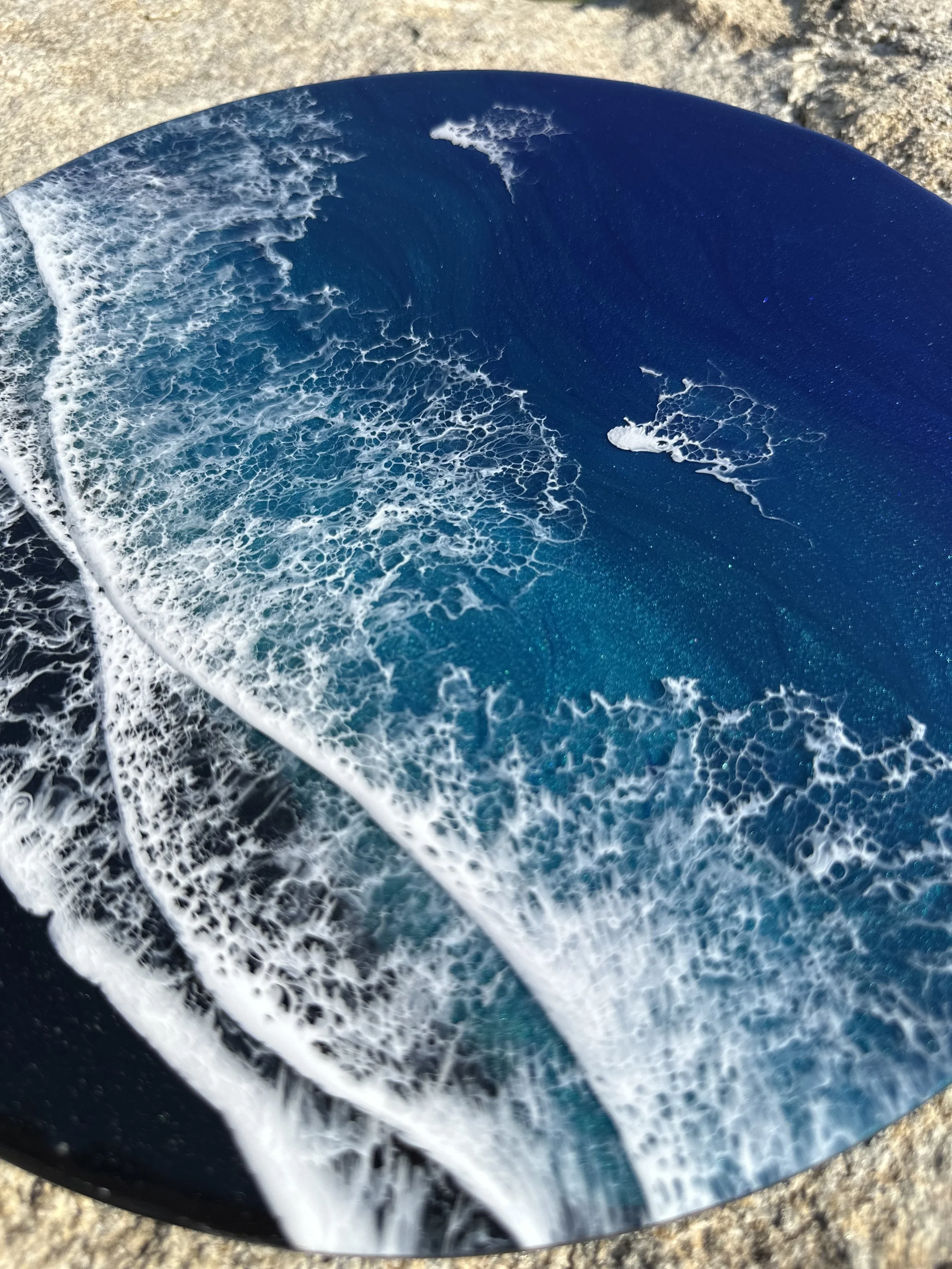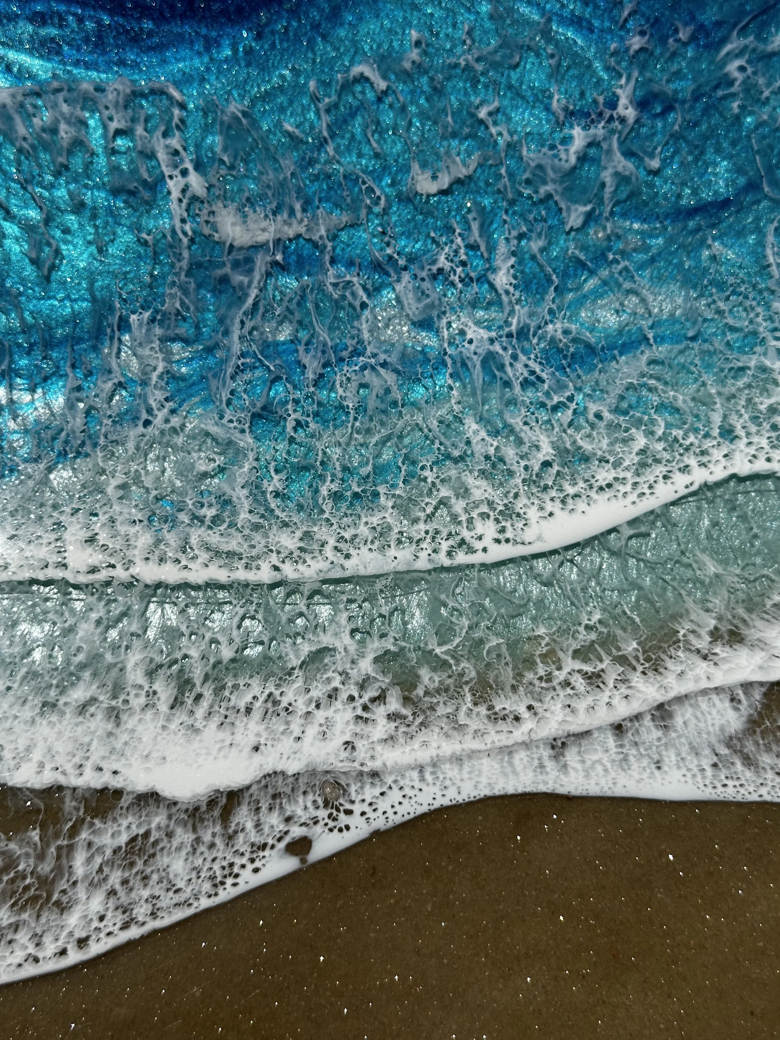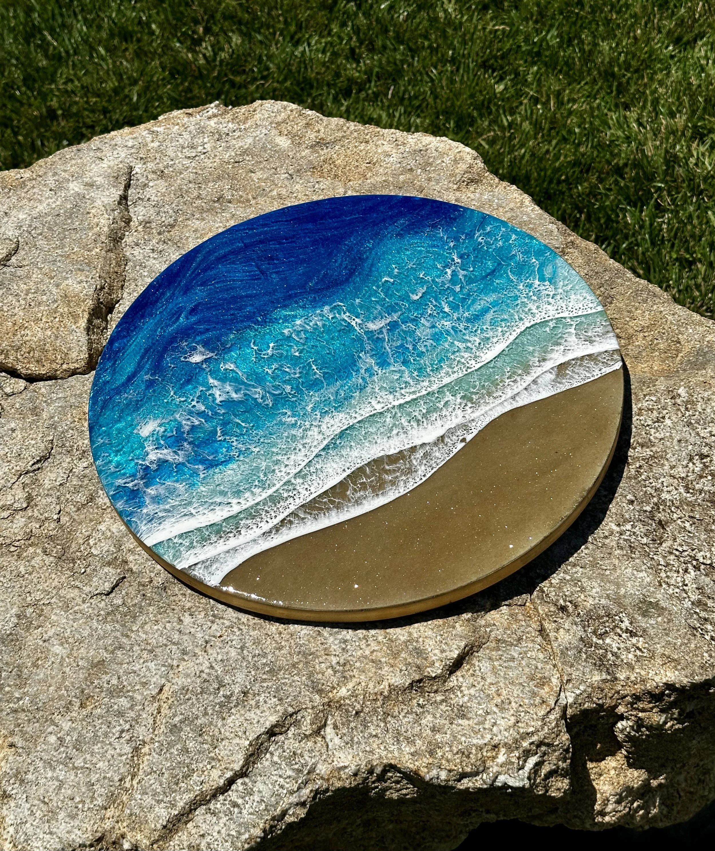 Beautiful ocean resin art on a 12-inch round cradle board. This particular ocean has various shades of blue from dark turquoise, teal blue, and aqua throughout with white crisp waves crashing on the beach. The beach area is made from real tan sand mixed with glitter to create the sparkle and shine of the sand.