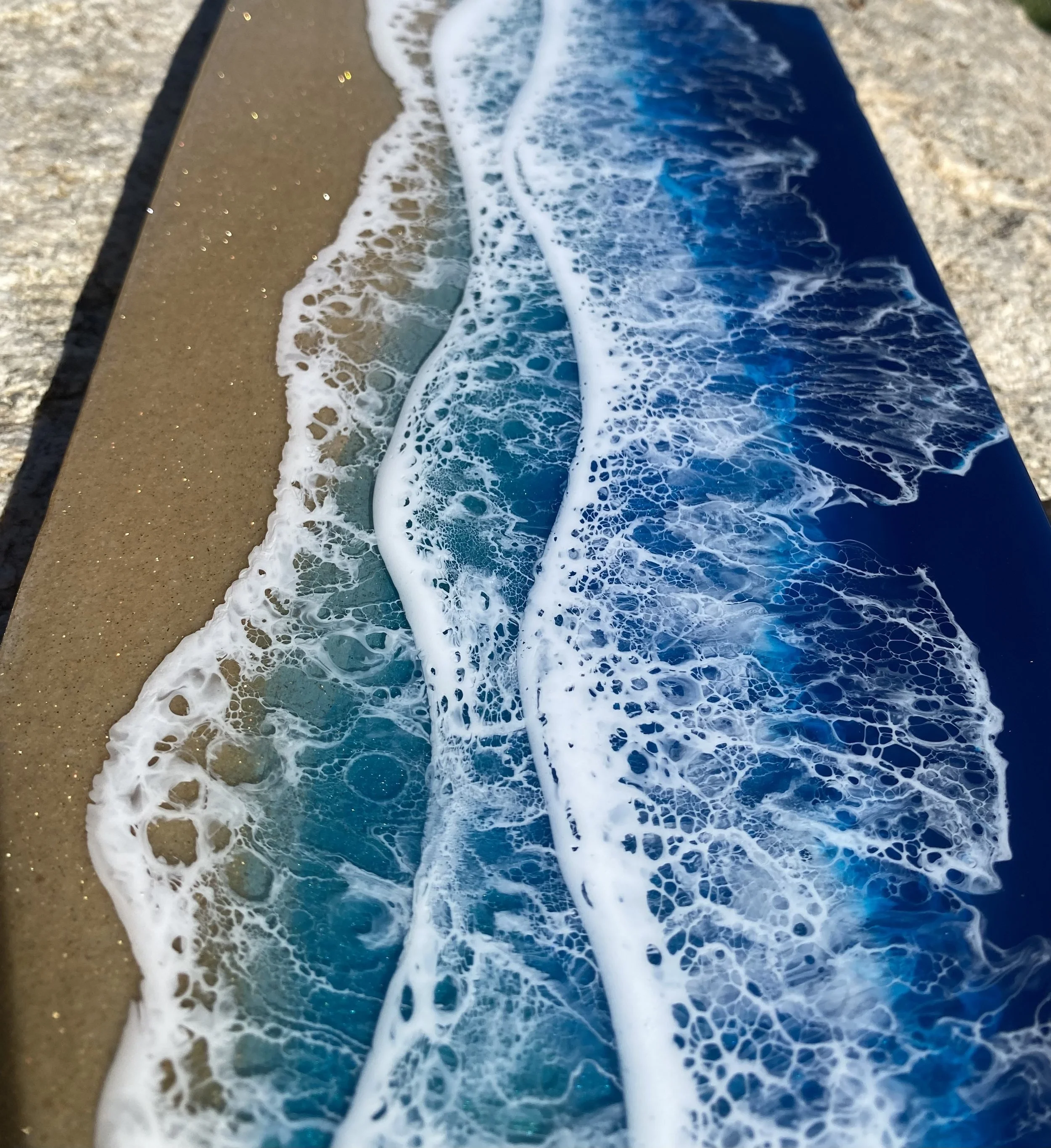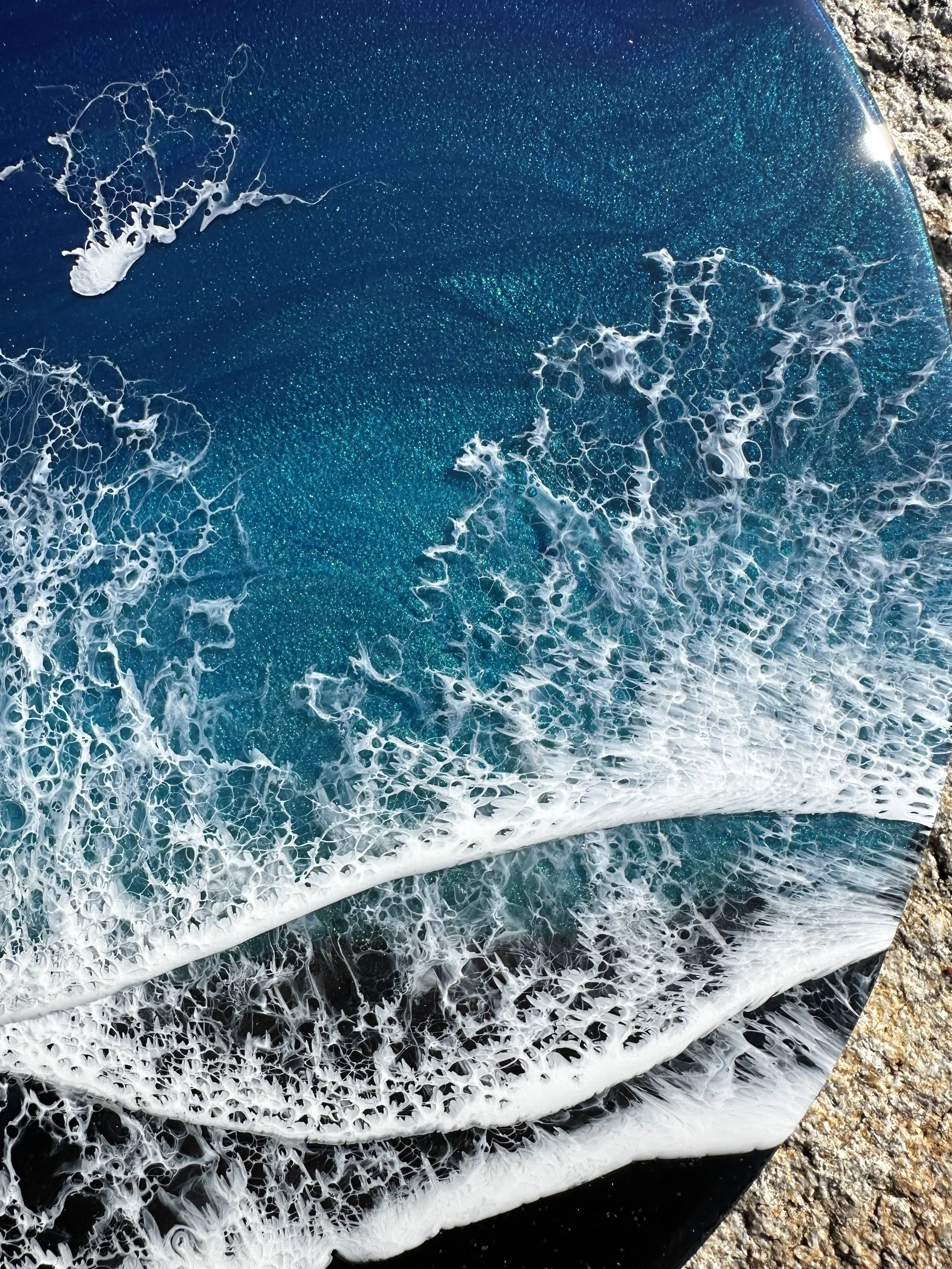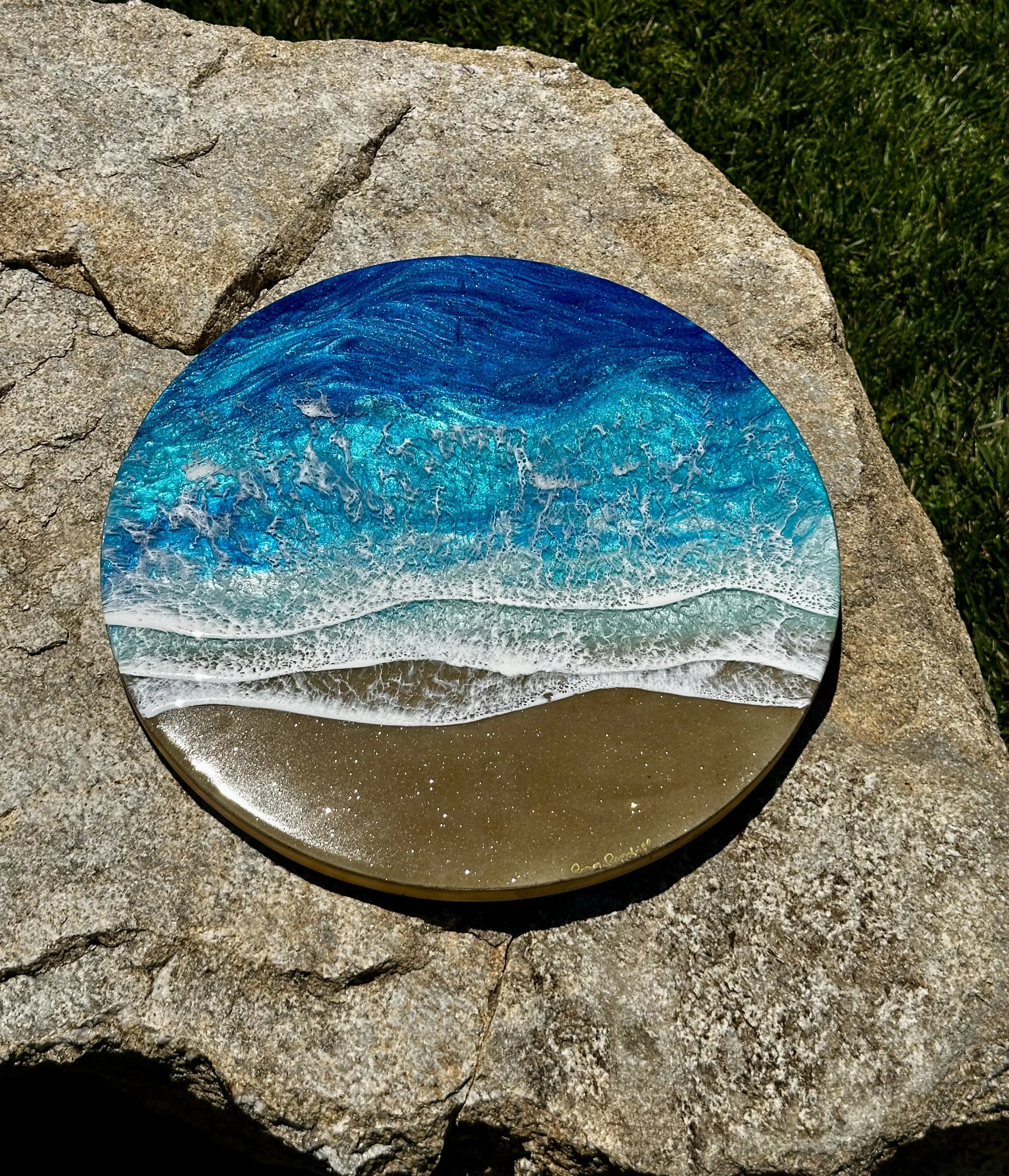 Beautiful ocean resin art on a 12-inch round cradle board. This particular ocean has various shades of blue from dark turquoise, teal blue, and aqua throughout with white crisp waves crashing on the beach. The beach area is made from real tan sand mixed with glitter to create the sparkle and shine of the sand.