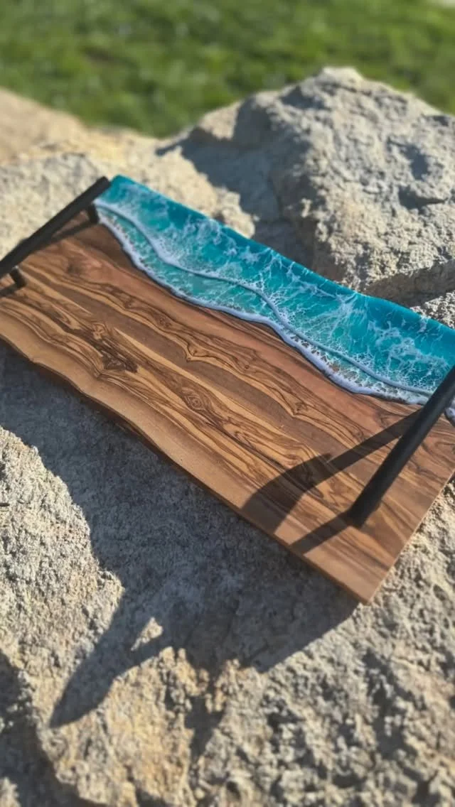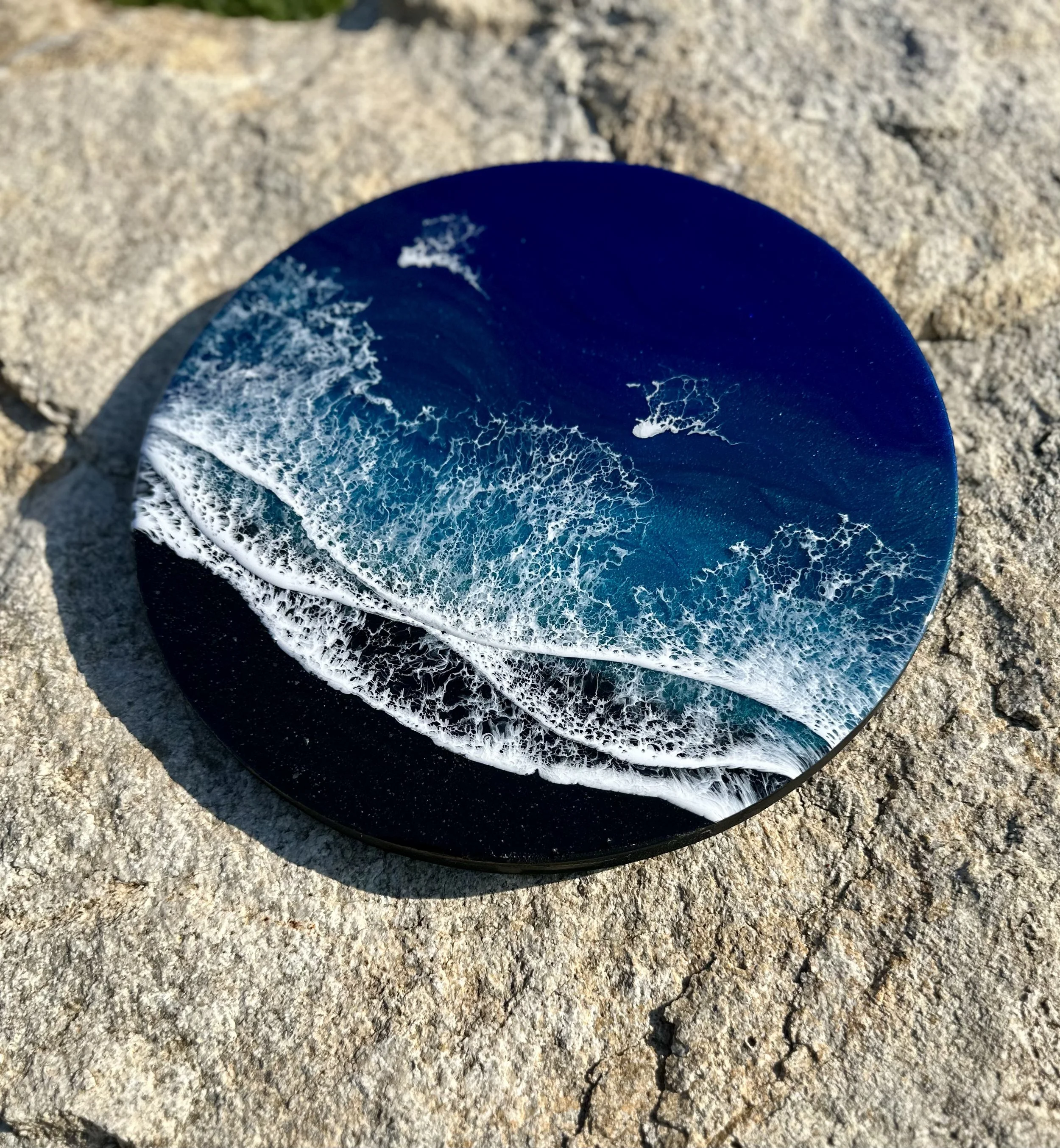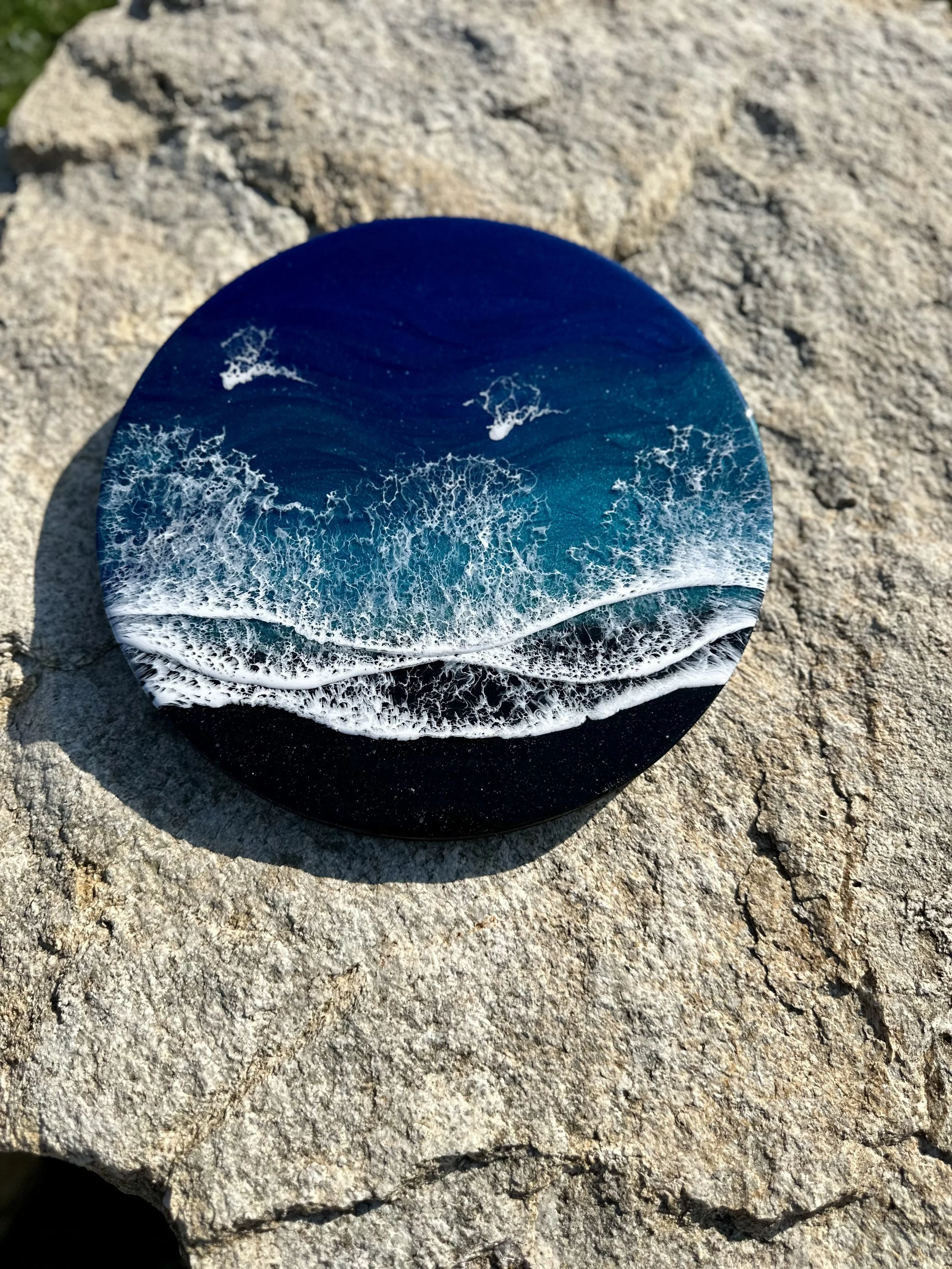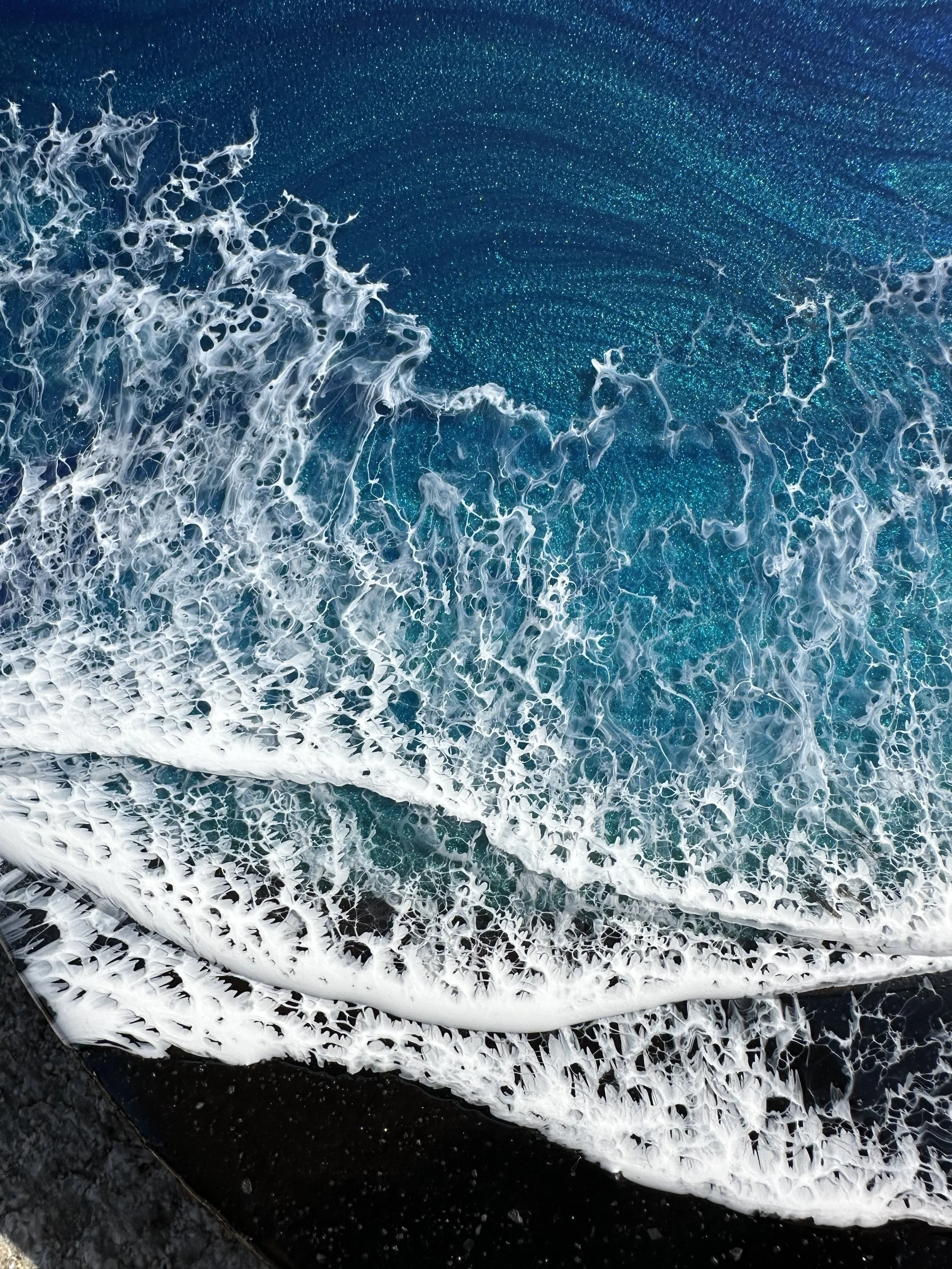 Beautiful ocean resin art on a 12-inch round cradle board. This particular ocean has various shades of blue from dark turquoise, teal blue, and aqua throughout with white crisp waves crashing on the beach. The beach area is made from real tan sand mixed with glitter to create the sparkle and shine of the sand.