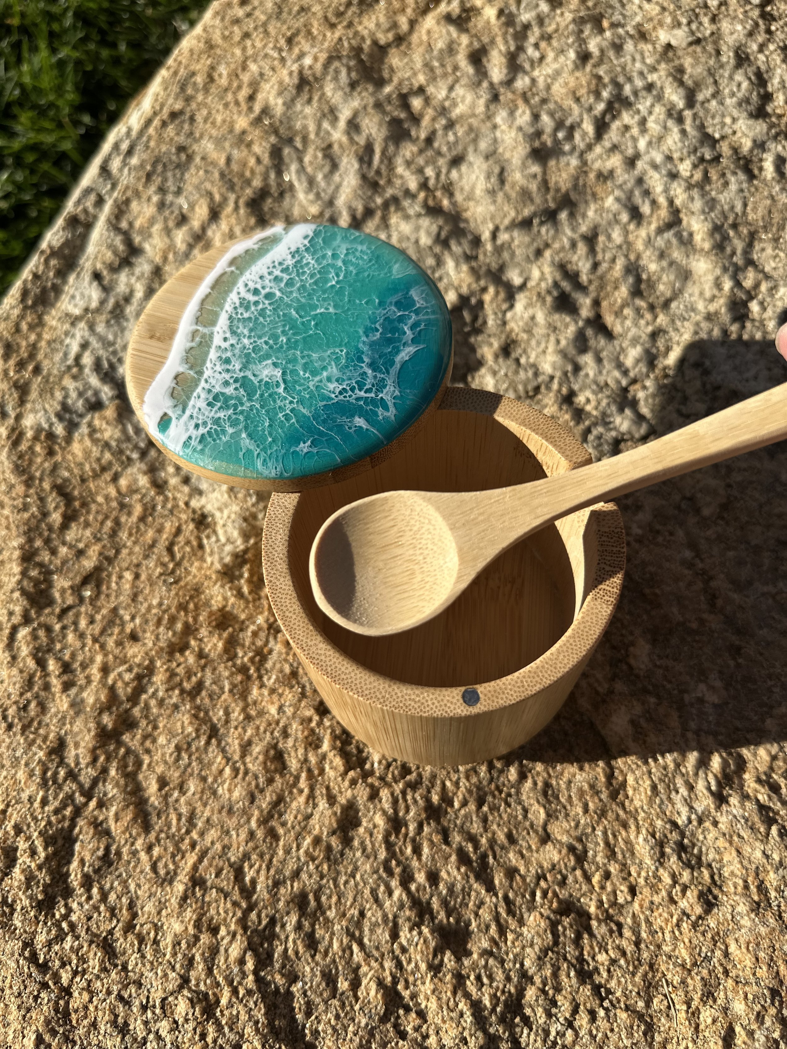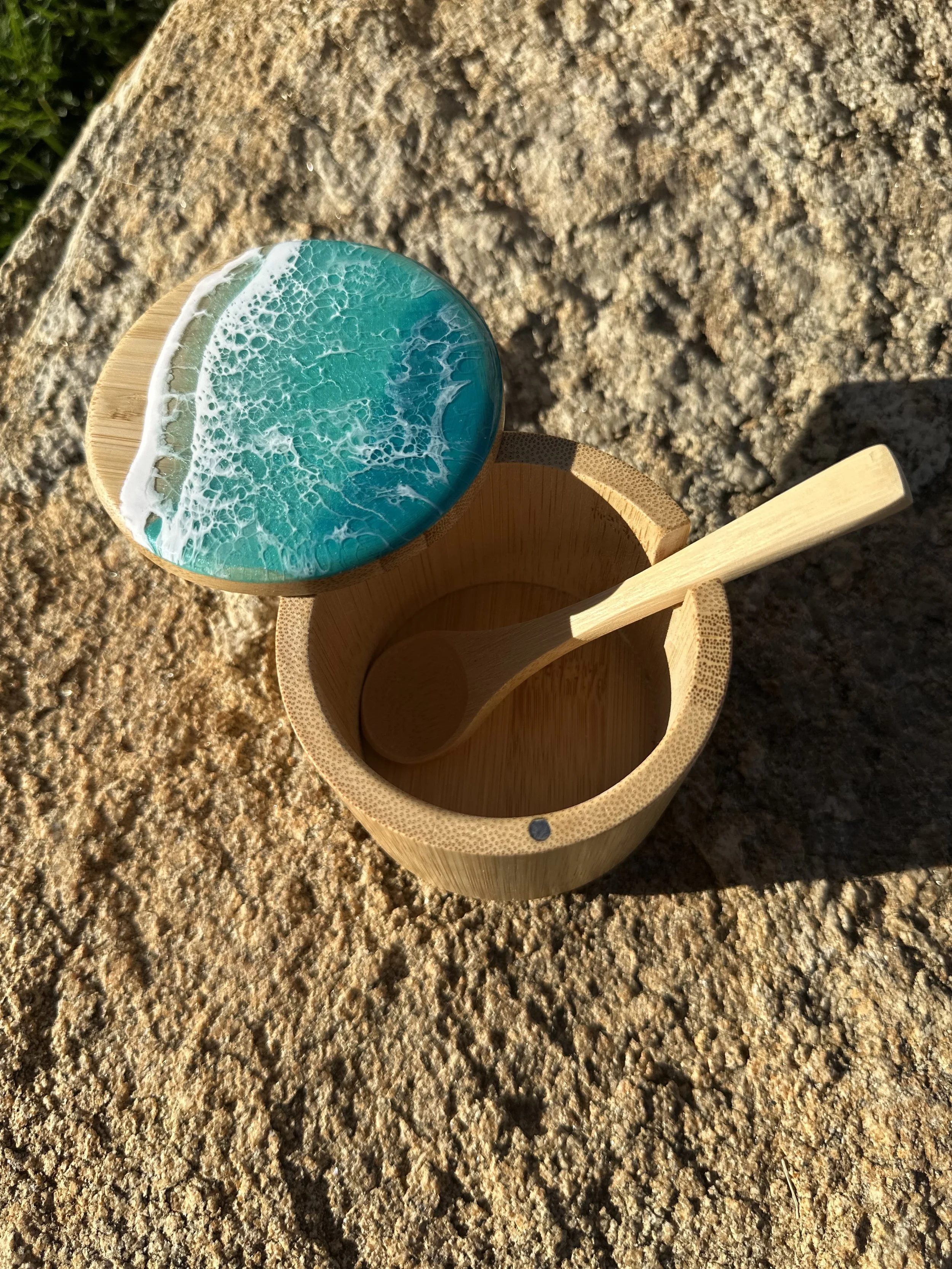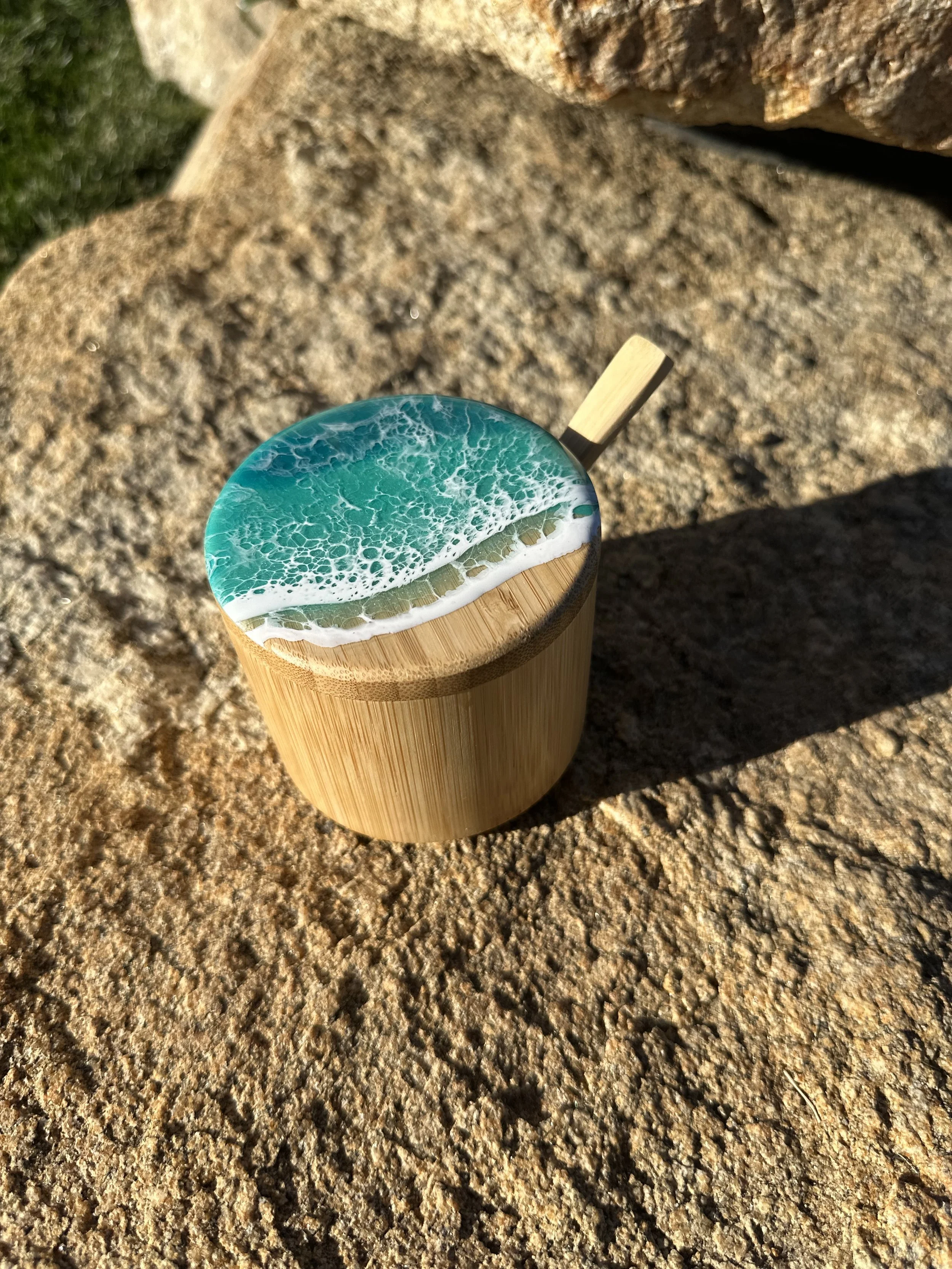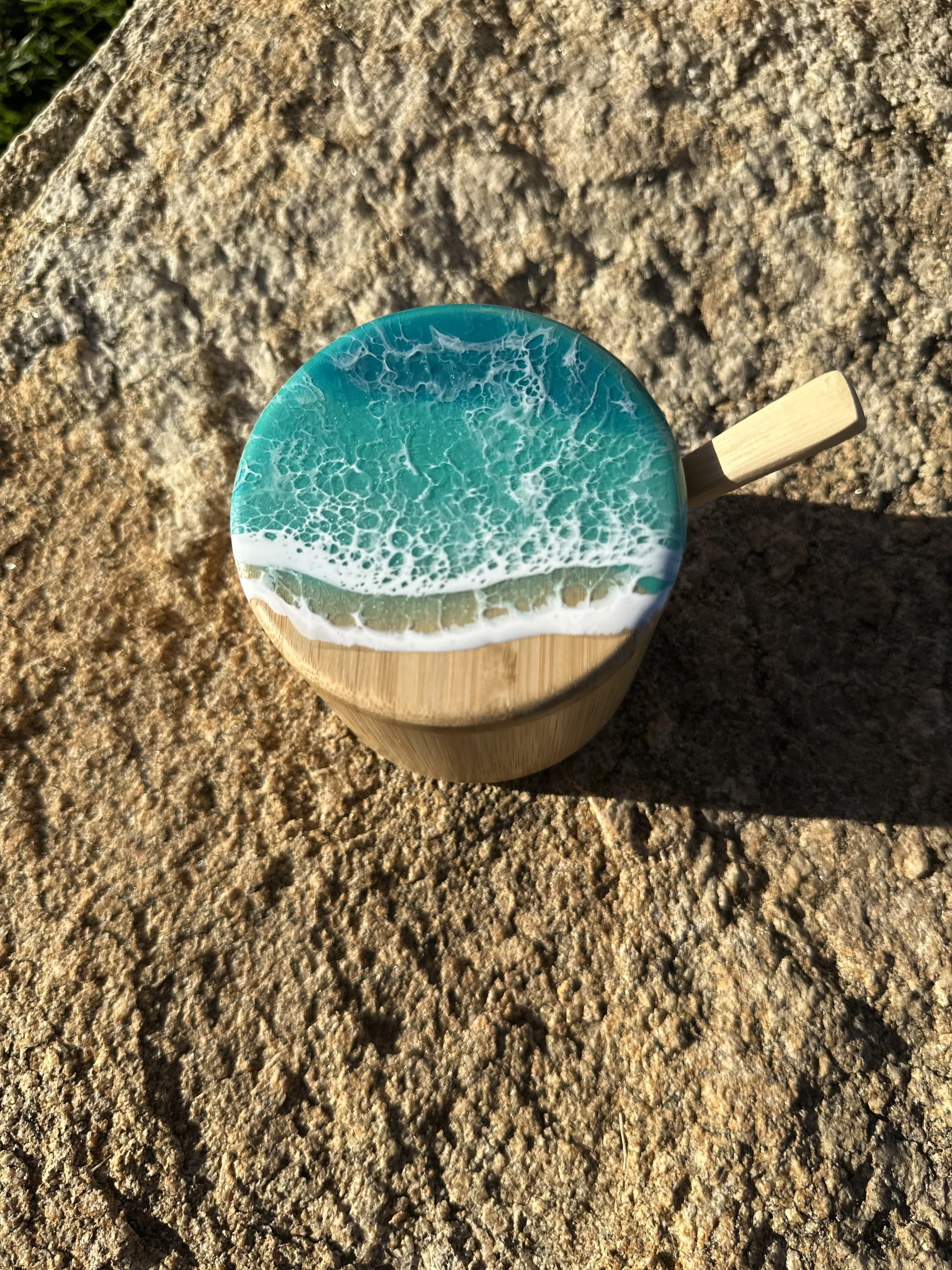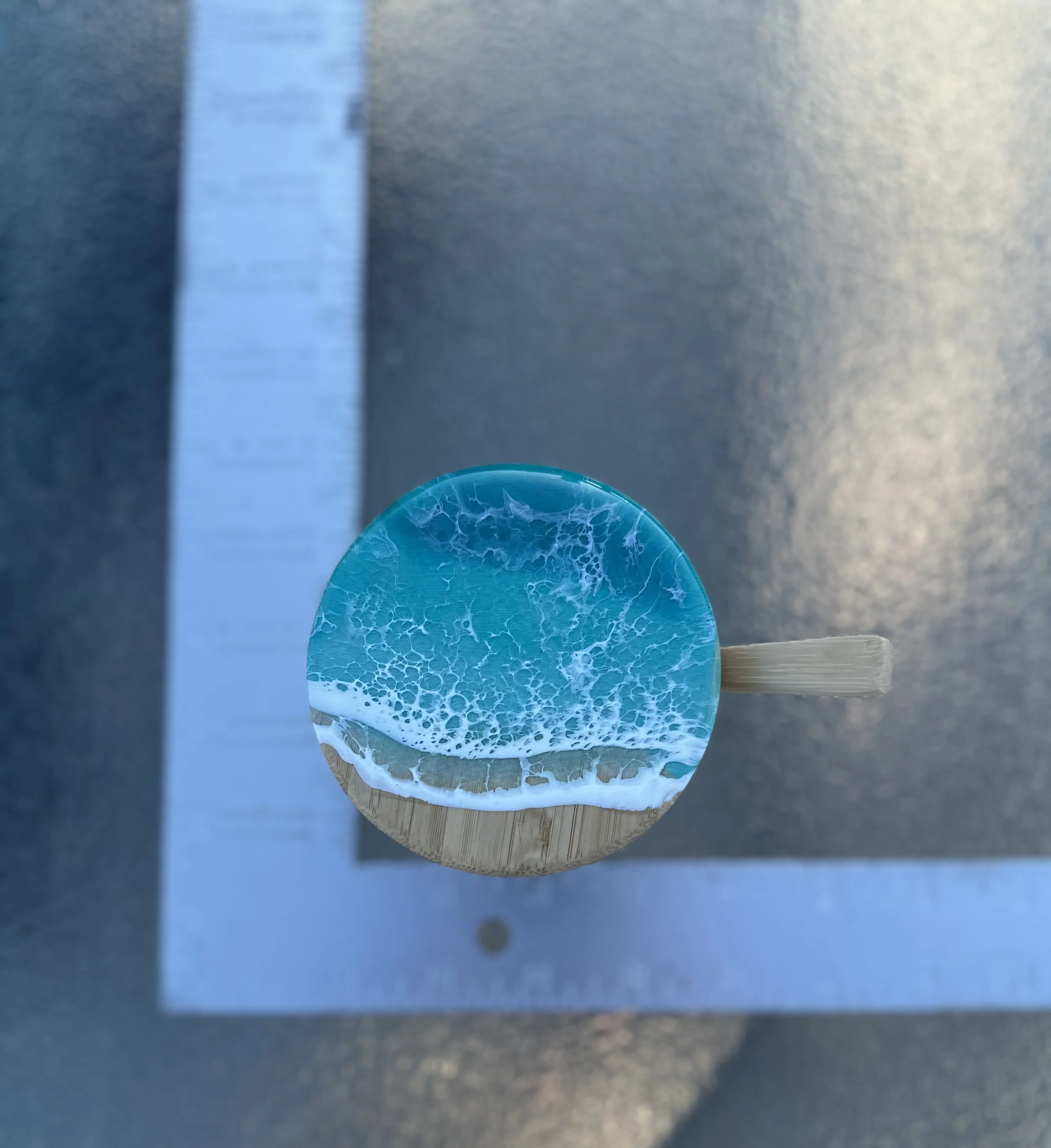 The tray has a beautiful ocean resin art piece poured on top in the colors of deep turquoise blue, teal blue, and teal green with foamy white waves.