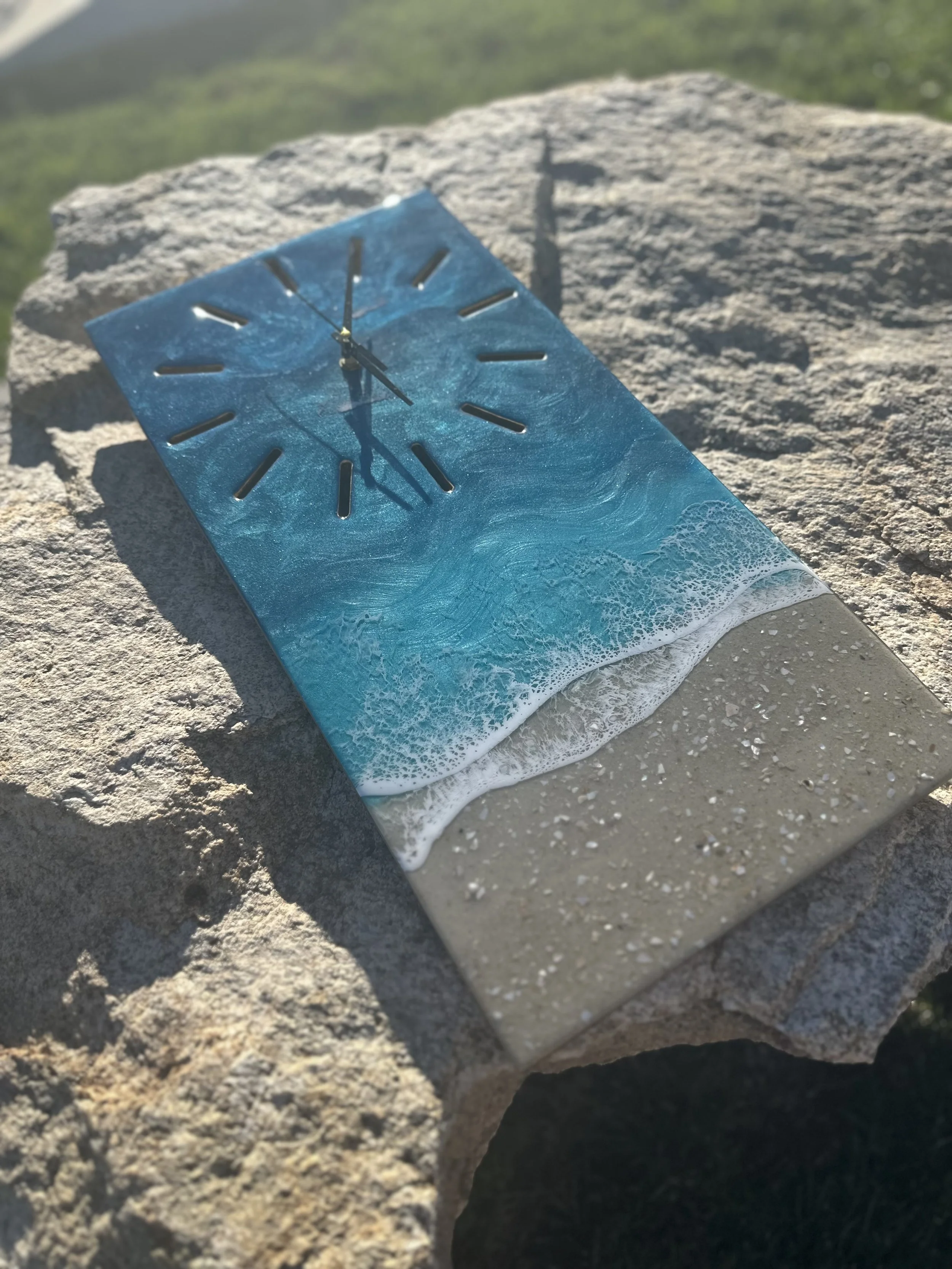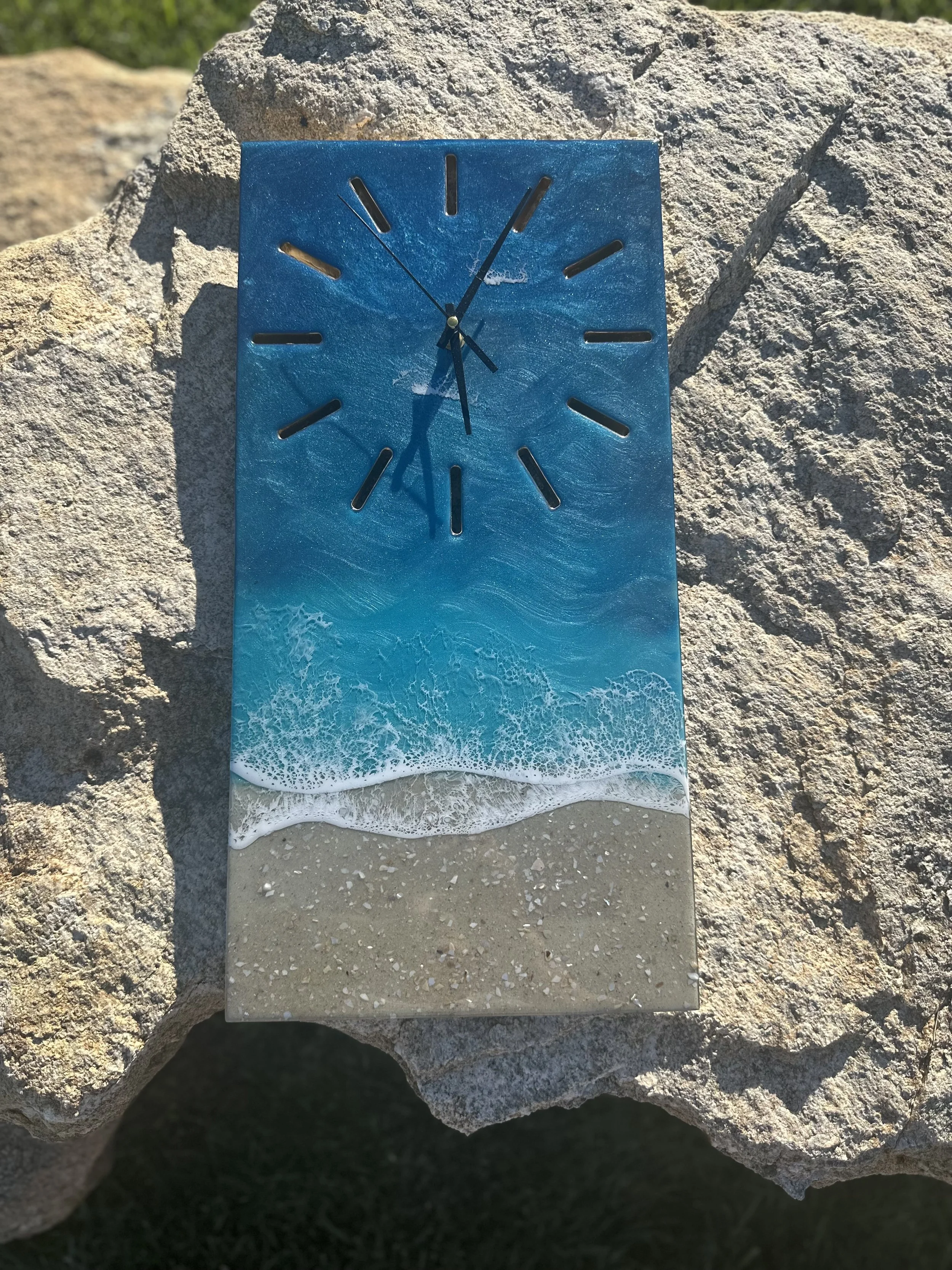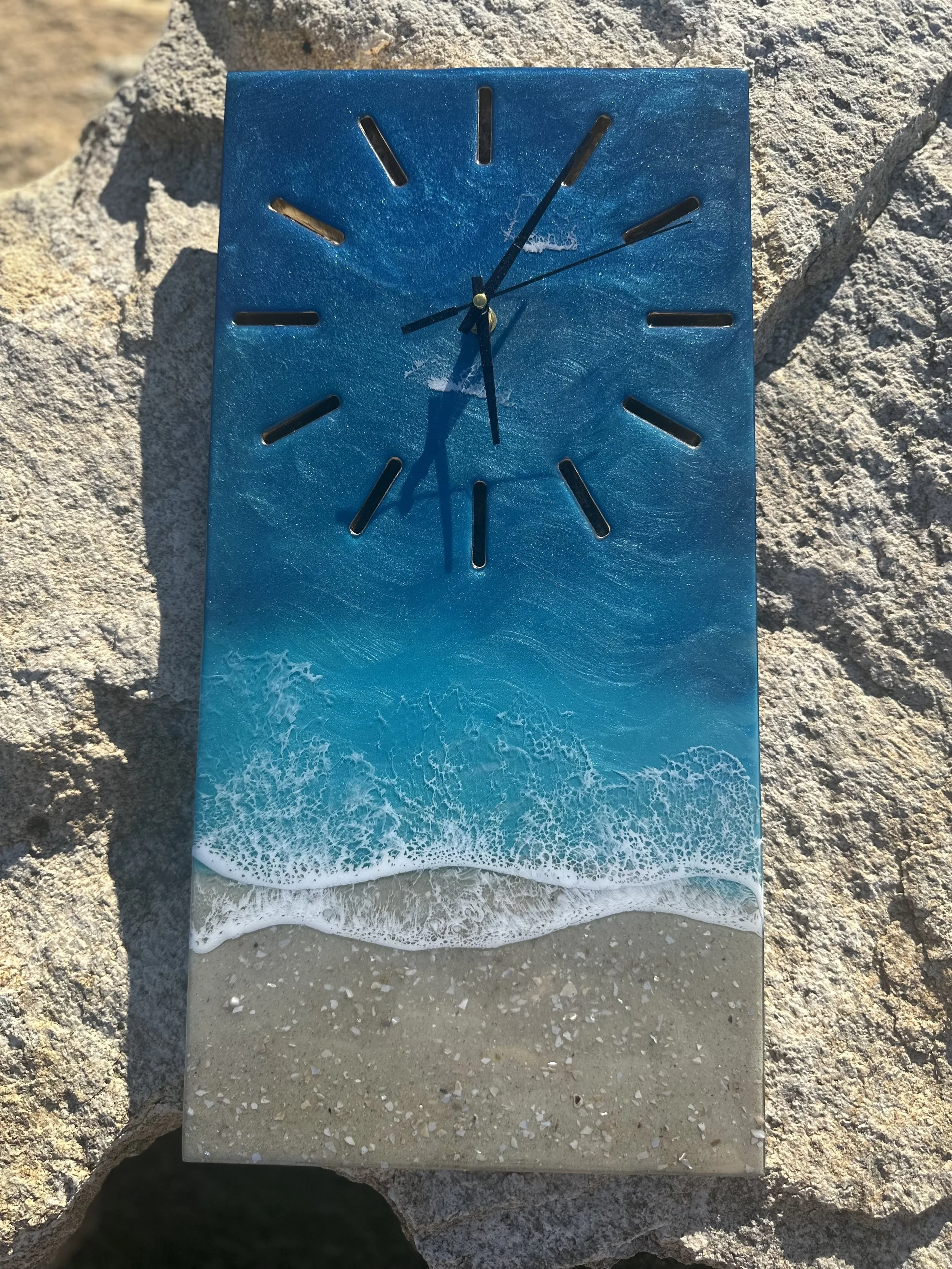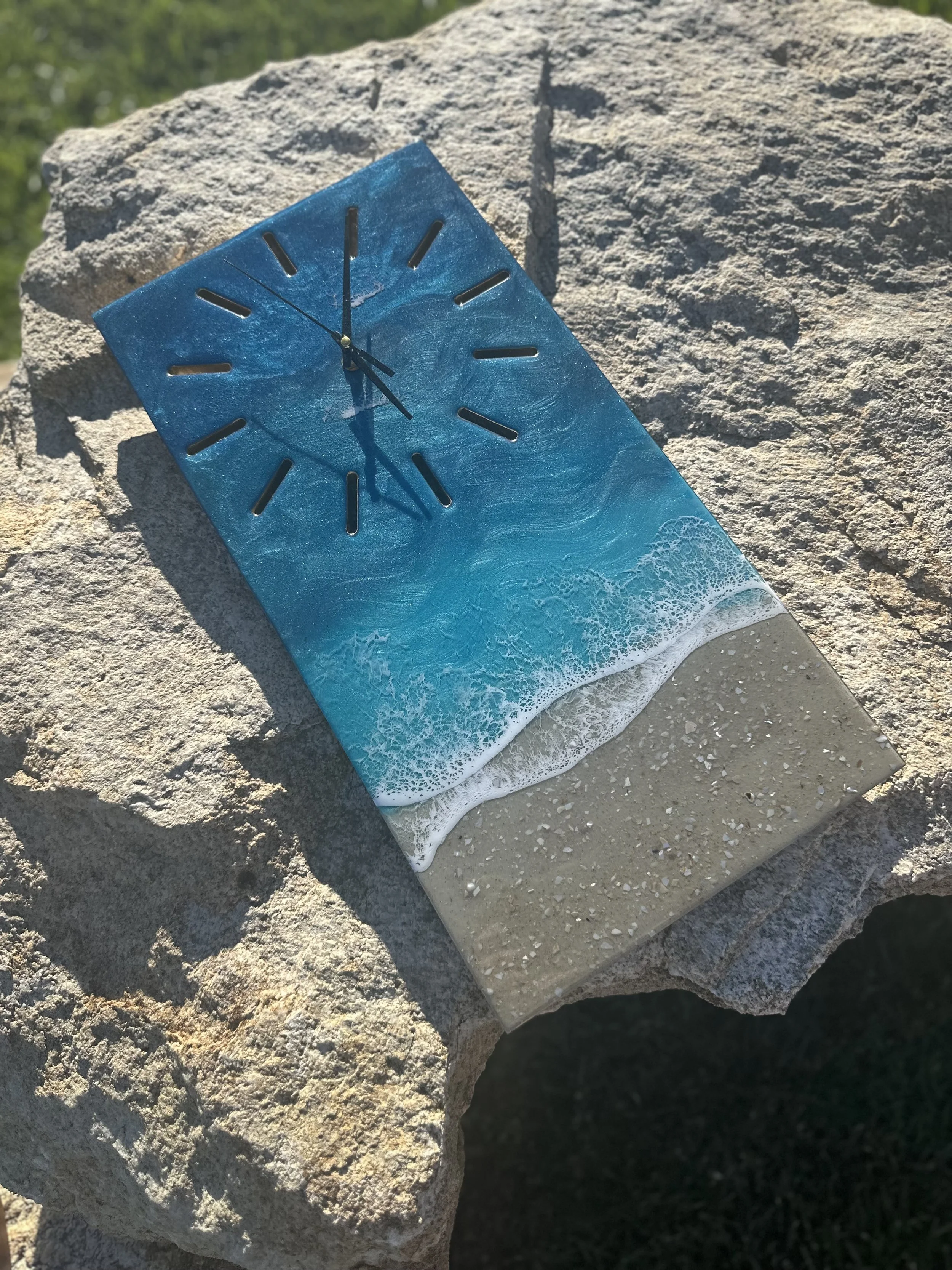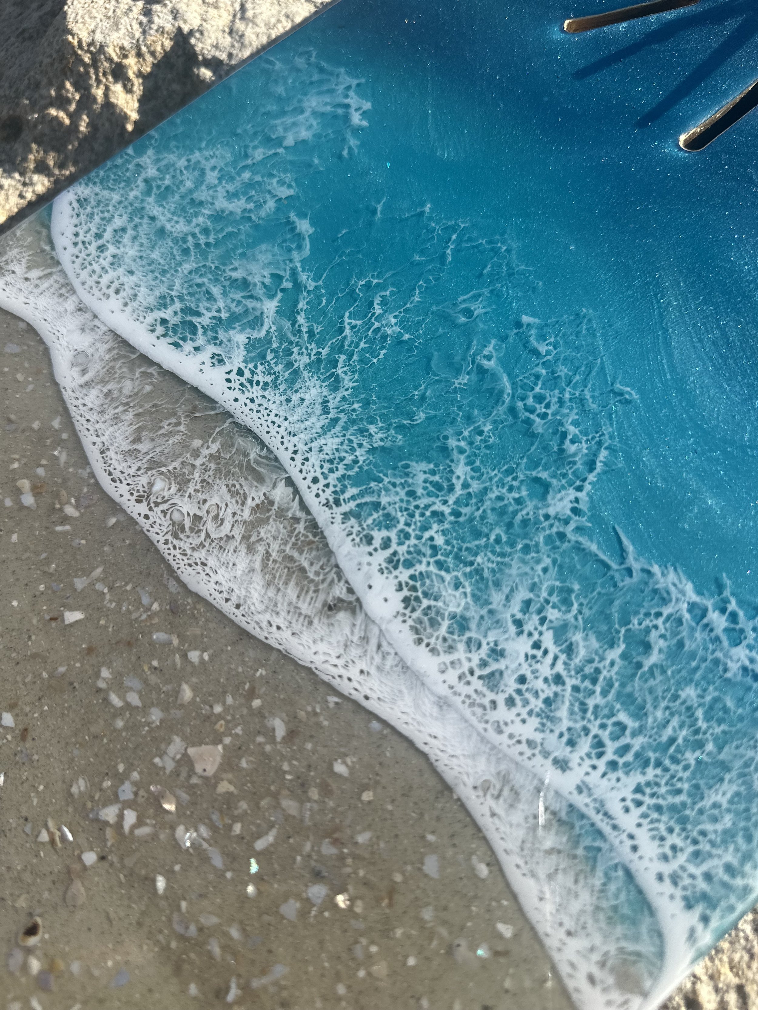 This tray brings you that feeling of the ocean with its beautiful colors and depth of waves. This item is a wood live edge board with black metal handles with resin poured in several layers to create depth and realism in the waves and water. The colors in the water are iridescent blues and greens with foamy waves.